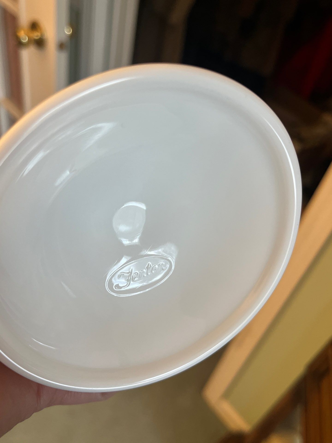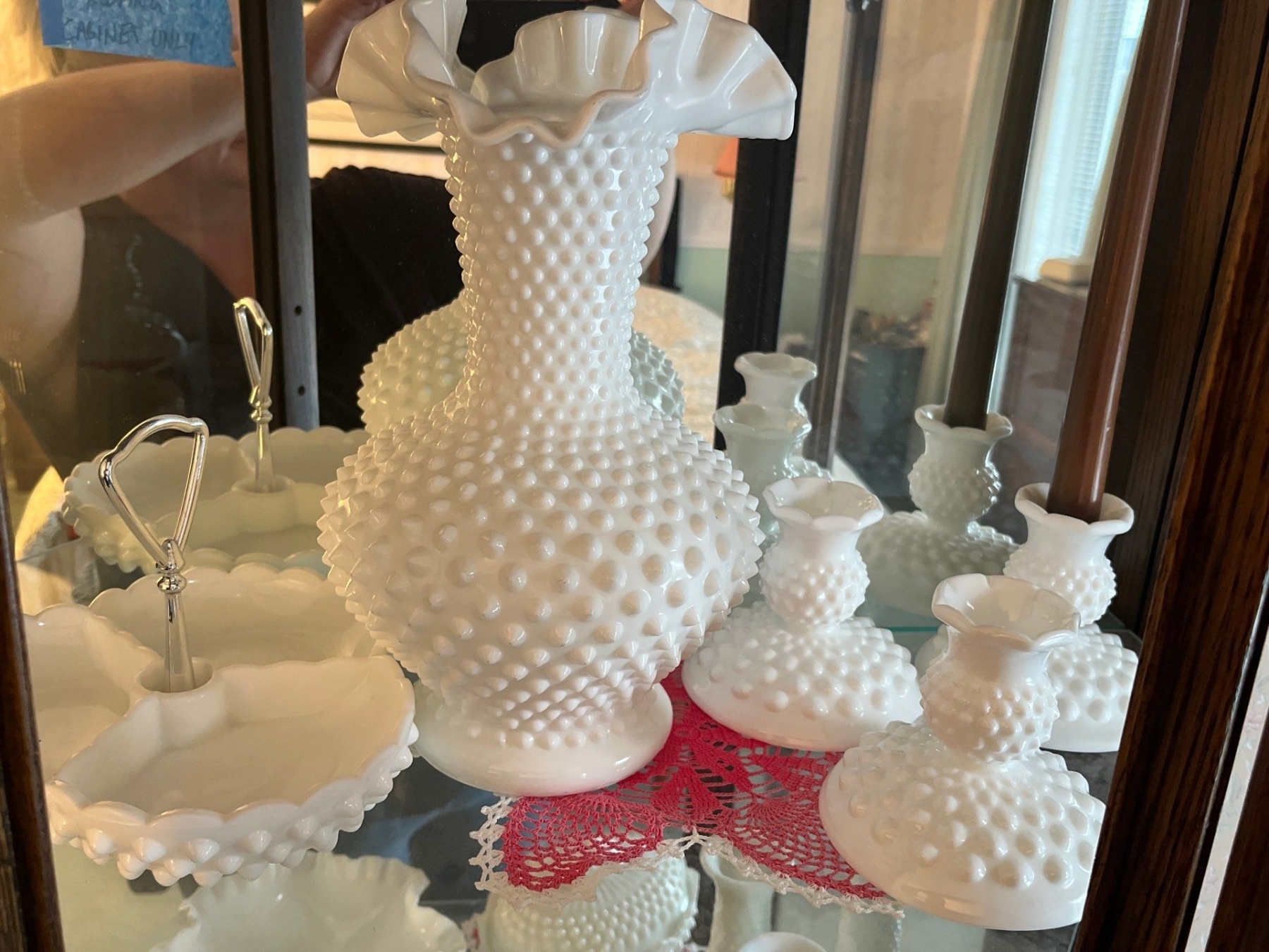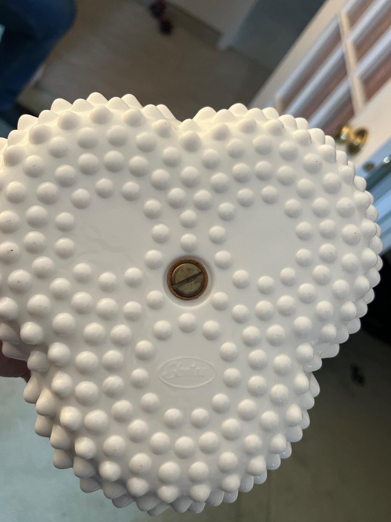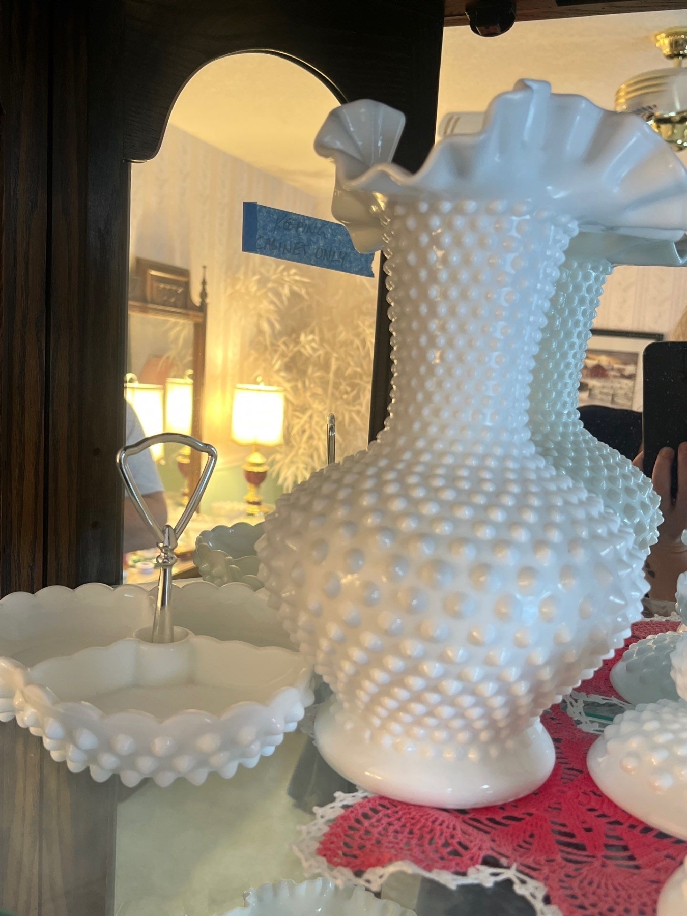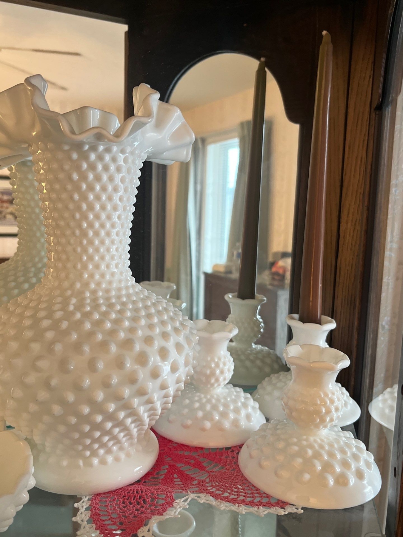 Vintage Milk Glass Hobnail Ruffle Top vase 10.5”with Fenton candy dish and 3 candle holders