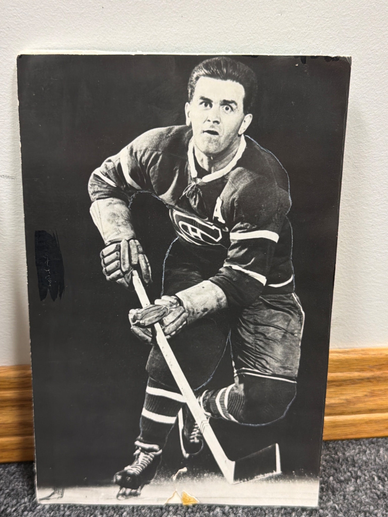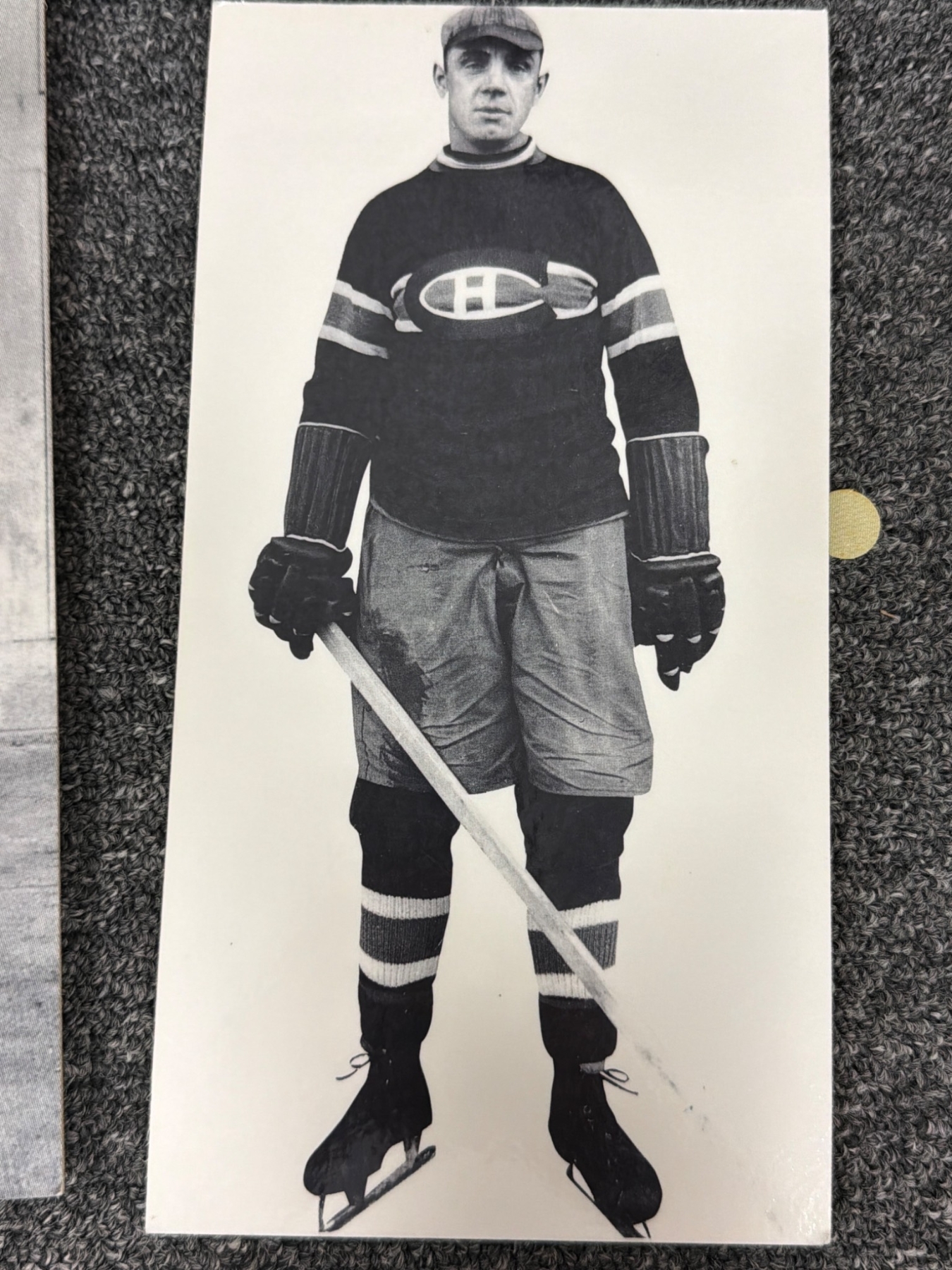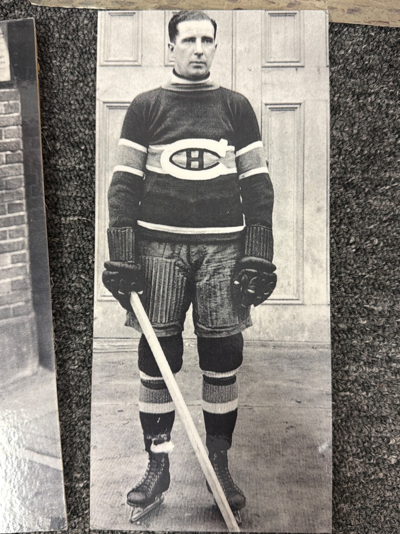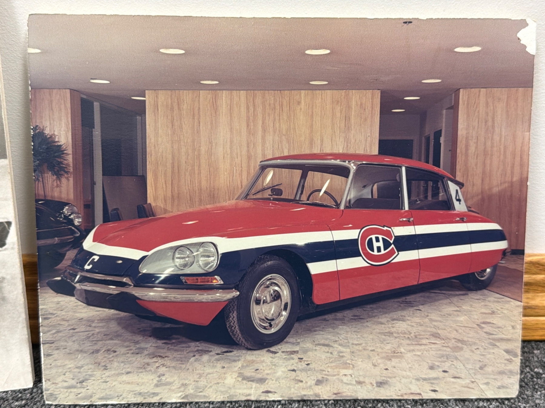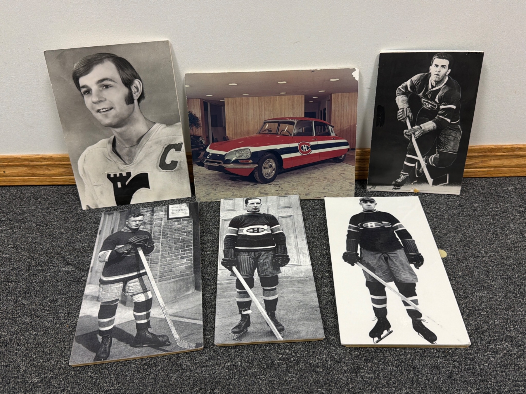 Montreal Canadiens memorabilia, including black-and-white player portraits and action shots from historical periods, capturing players like Sprague Cleghorn, Billy Couture, and others and their contributions, including the 1924 Stanley Cup playoff. Also features a unique car image wrapped in iconic Canadiens colors, gifted to Jean Beliveau. Items offer a glimpse into the rich historical legacy of the team.