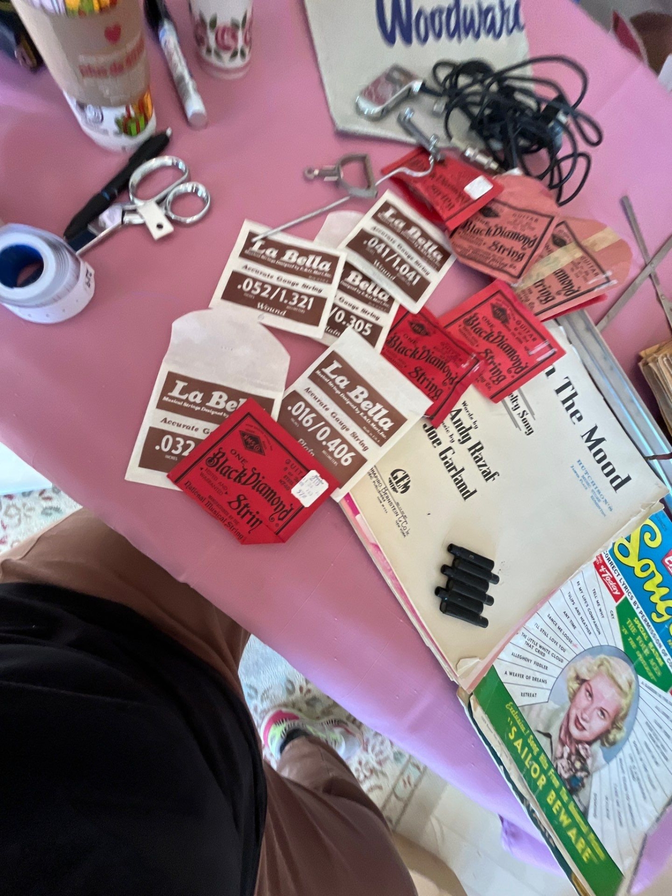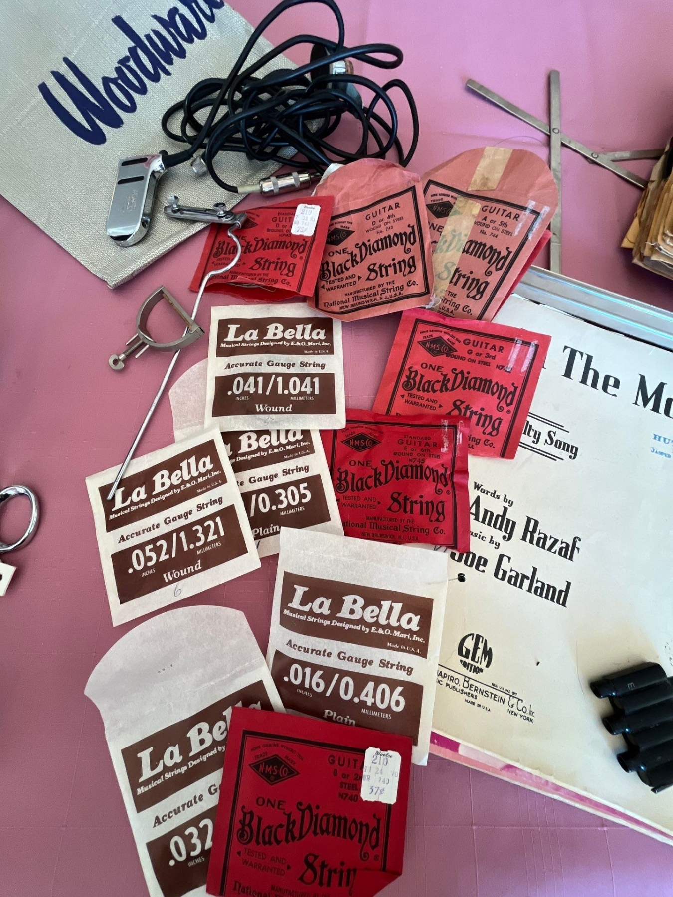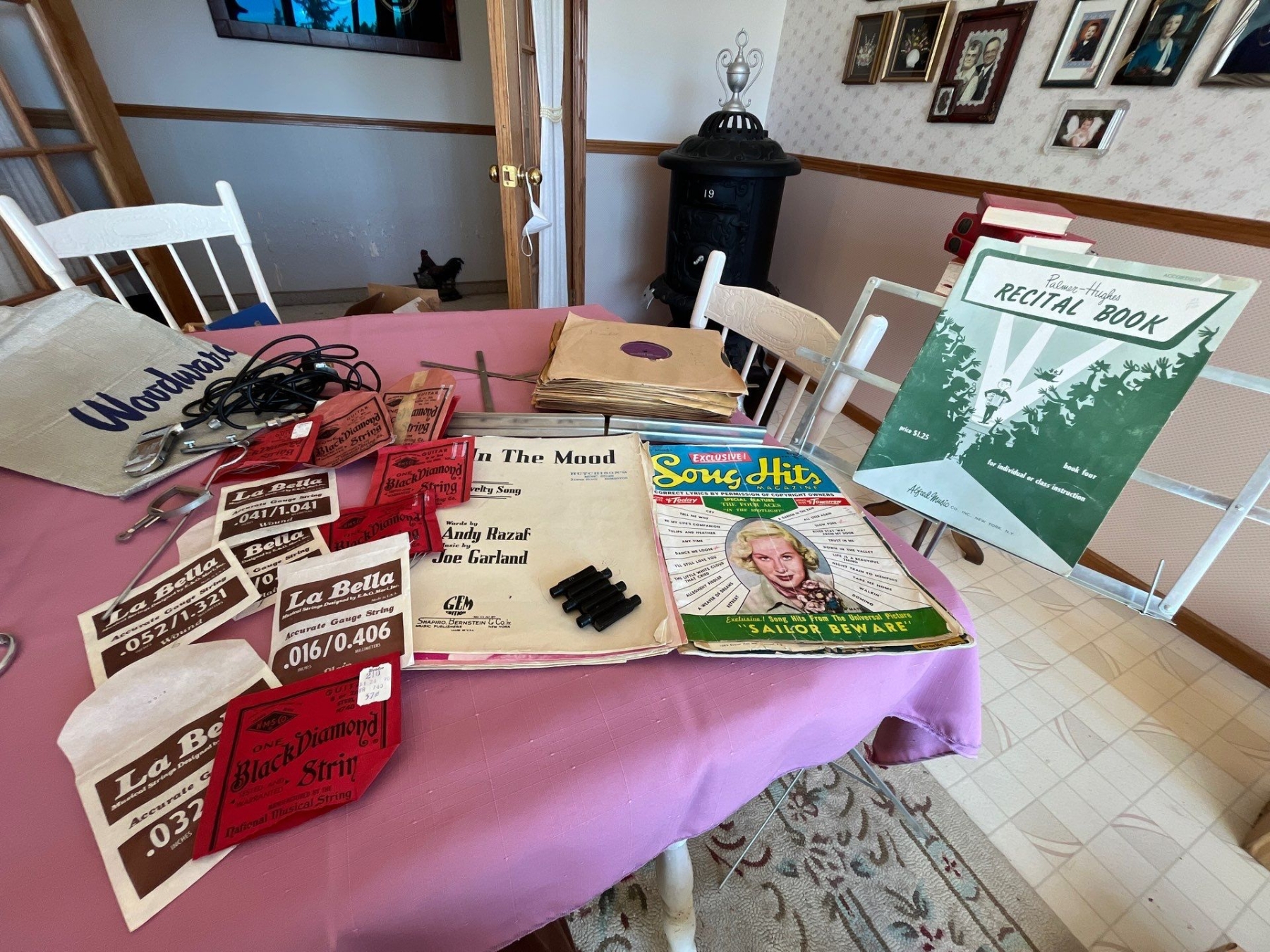 Vintage Music stands and recital books . With a selection of antique black diamond Labella guitar strings with a E tuning harmonica and a collection of 8 inch records