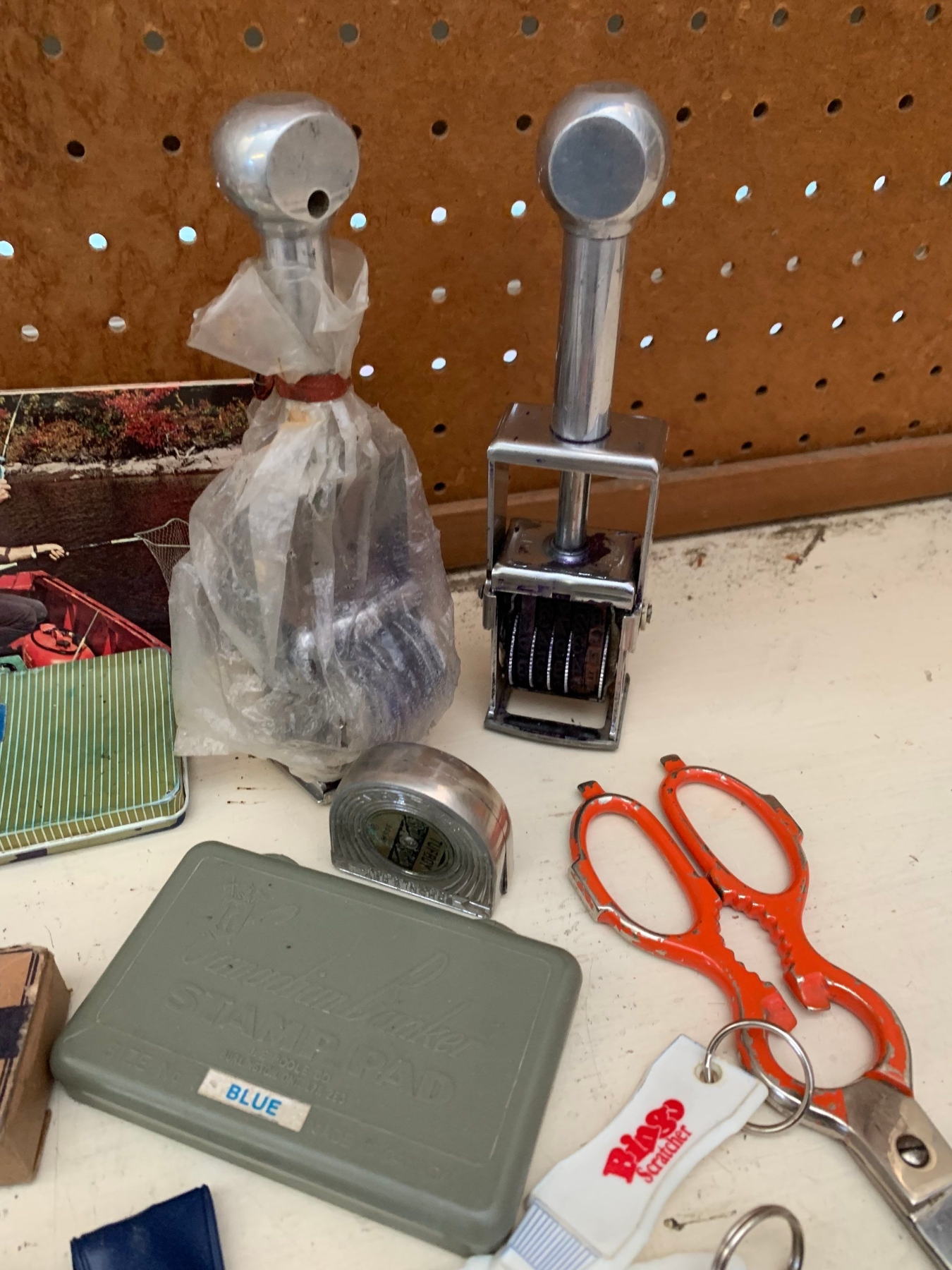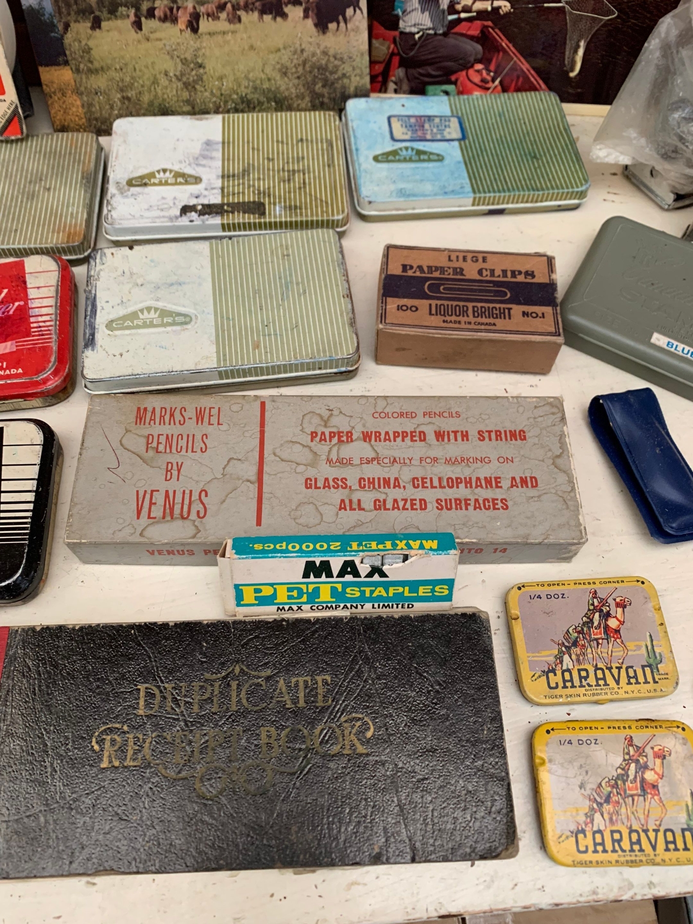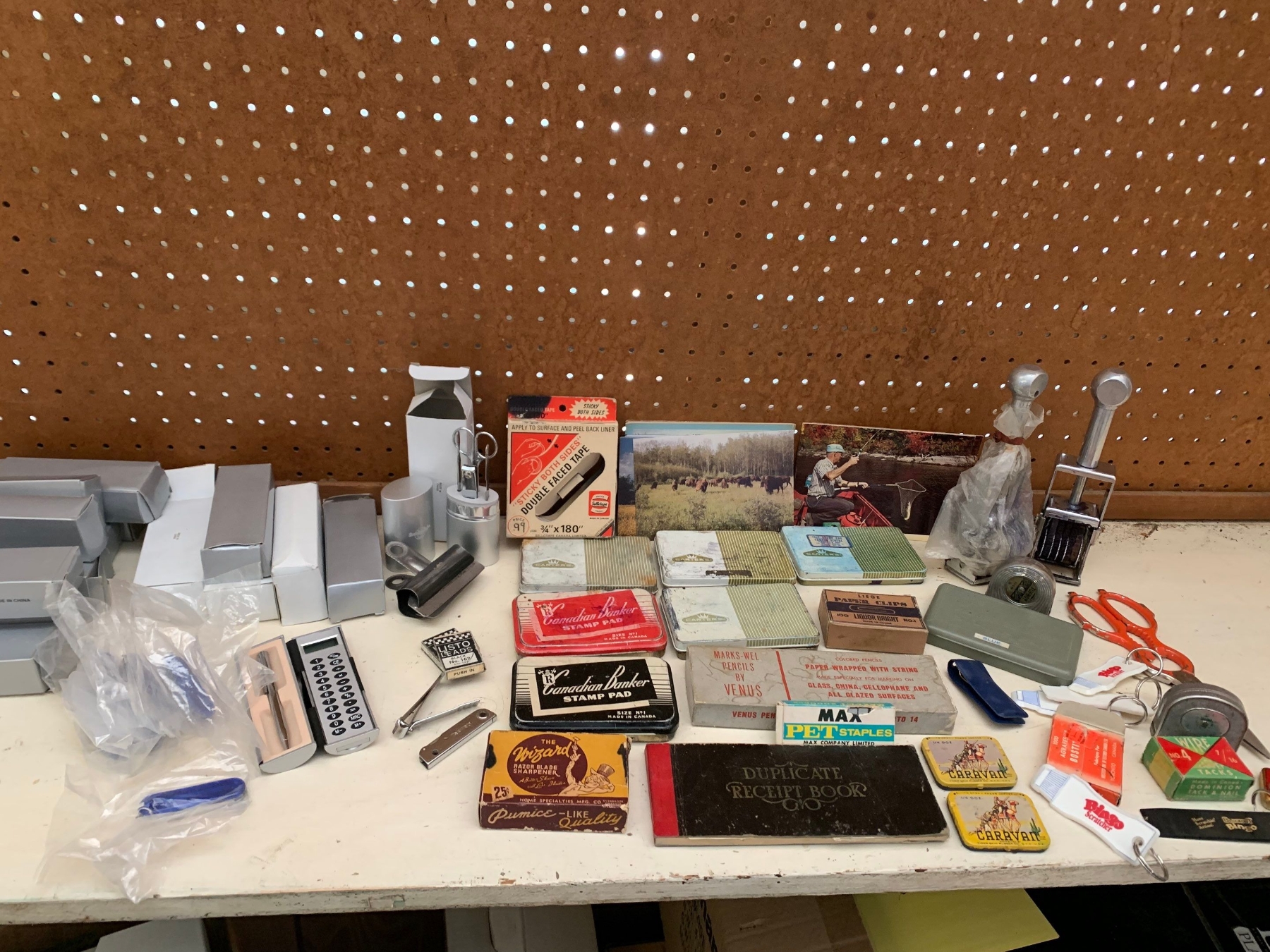 Vintage Office Supplies, antique stamp pads, vintage post cards, vintage new stock pocket knifes, vintage ashtray great for the collector