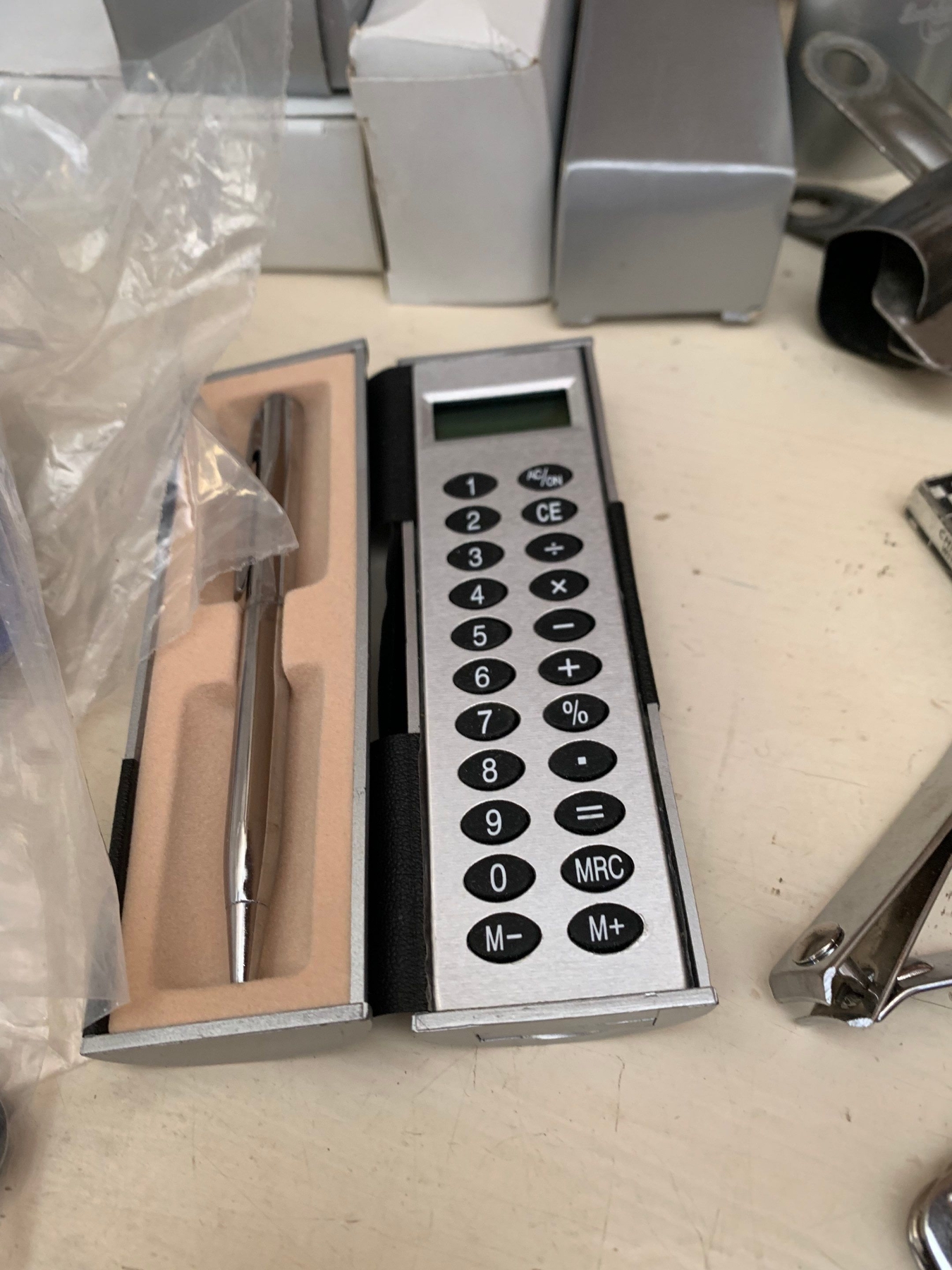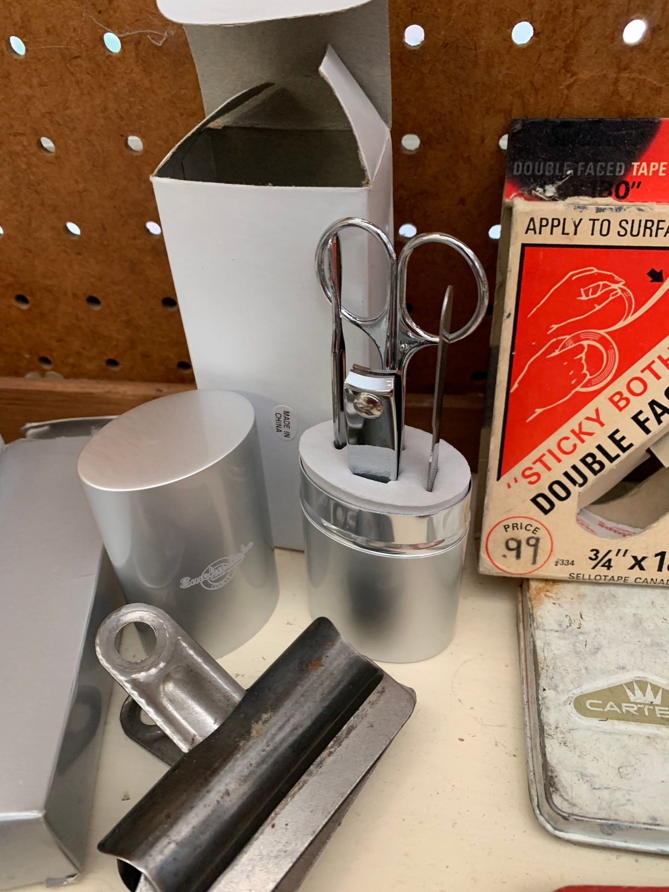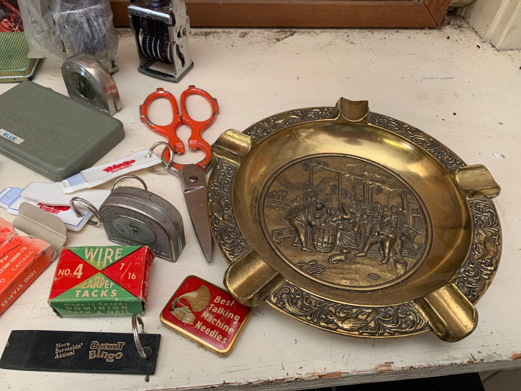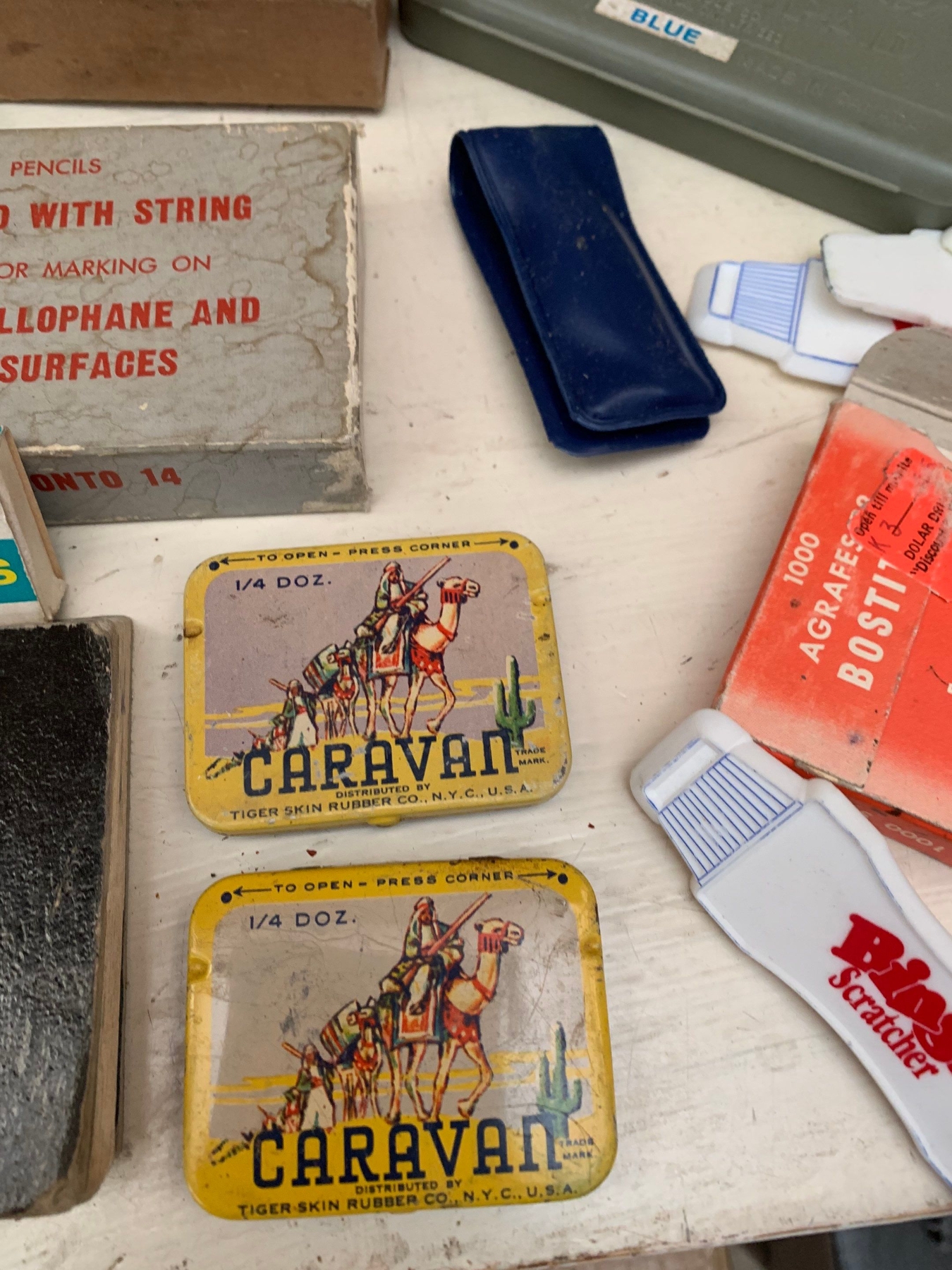 Vintage Office Supplies, antique stamp pads, vintage post cards, vintage new stock pocket knifes, vintage ashtray great for the collector