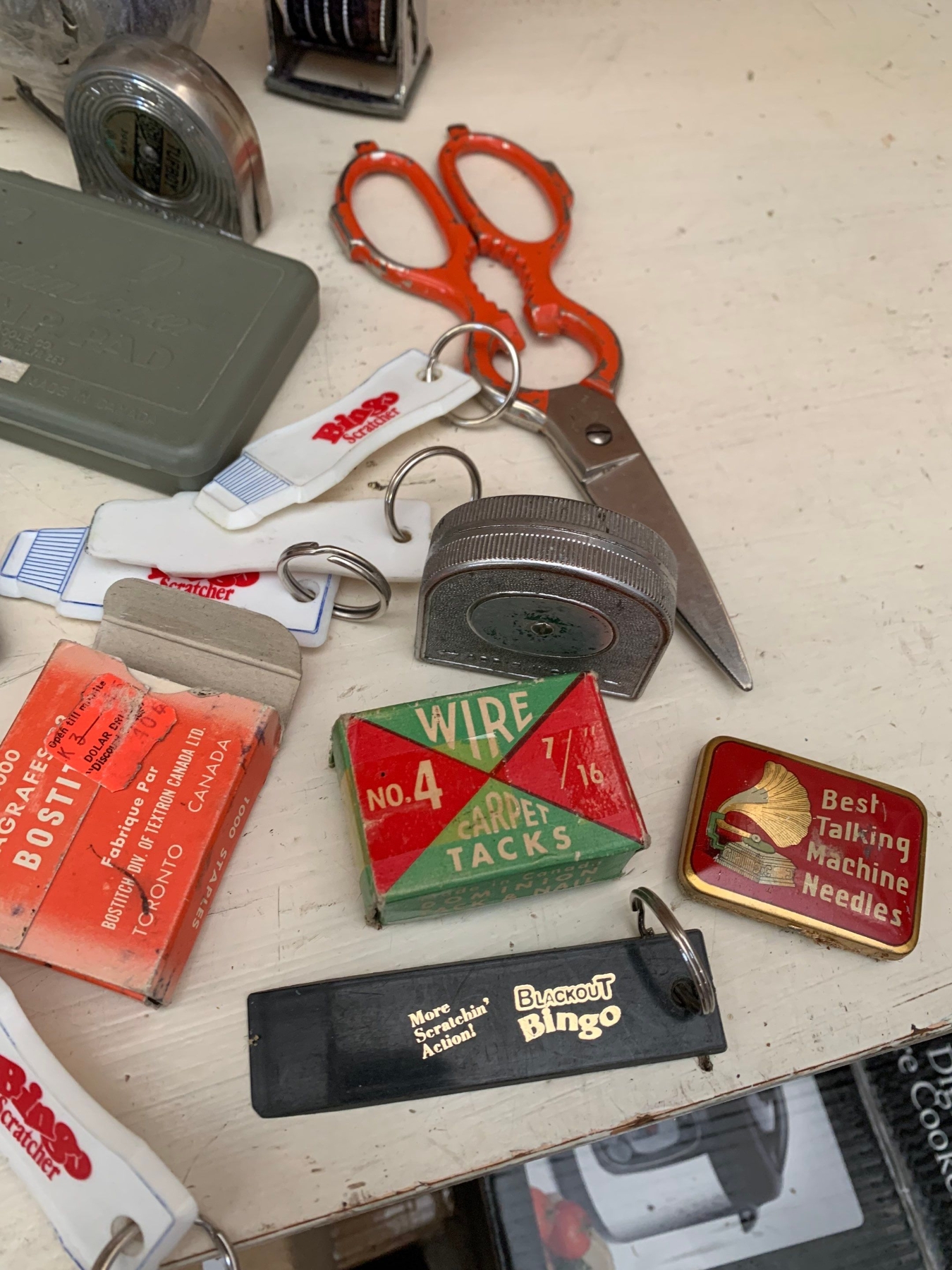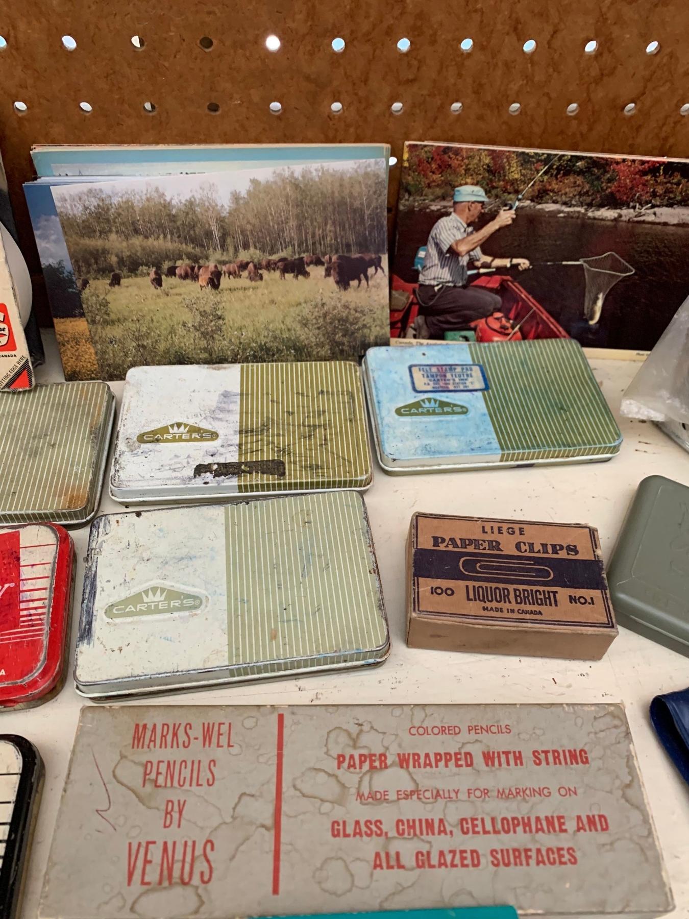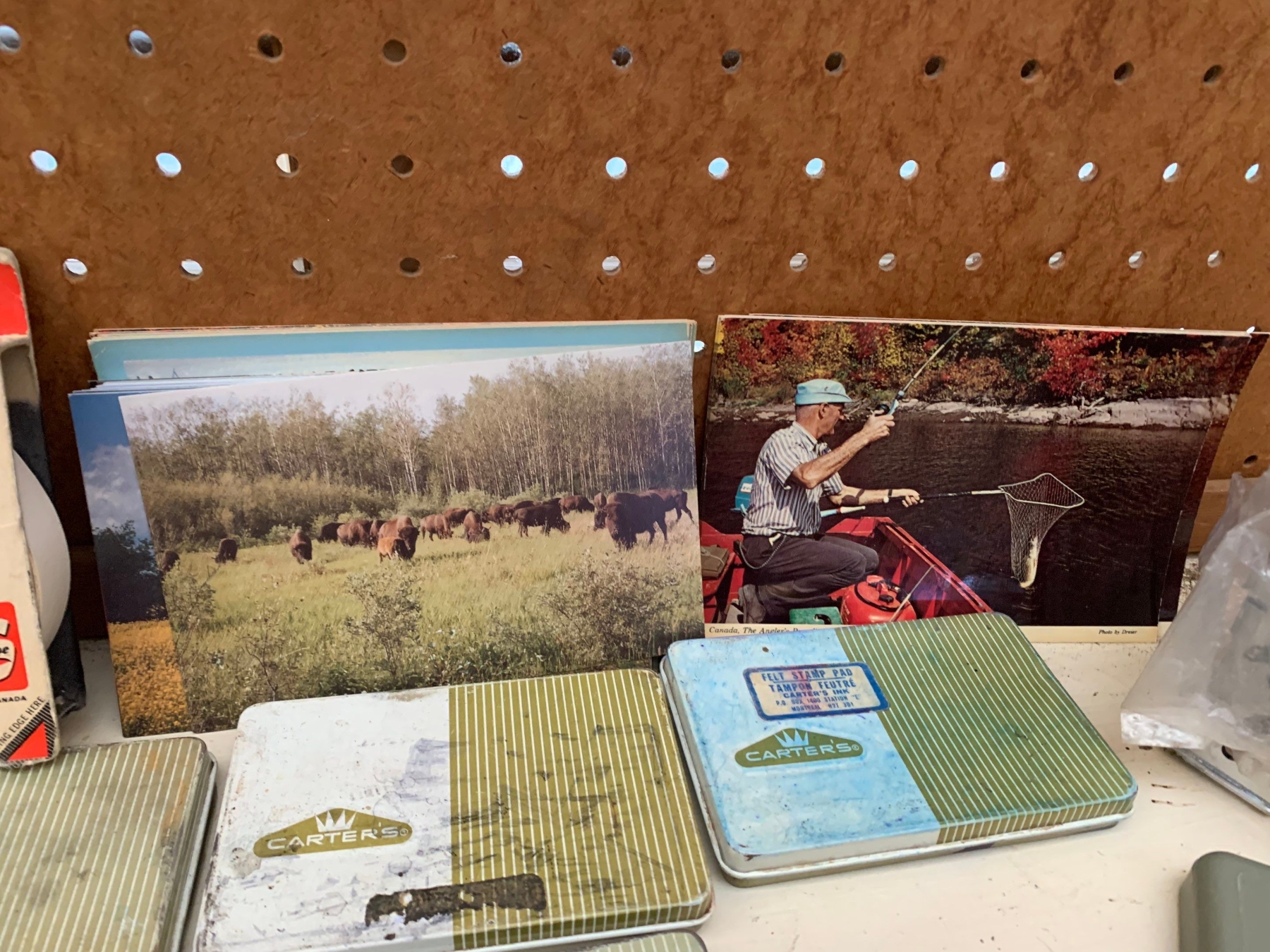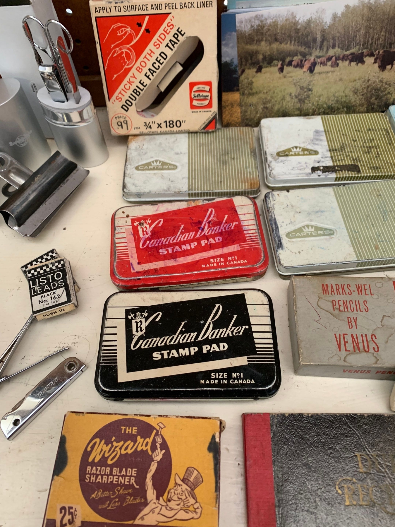 Vintage Office Supplies, antique stamp pads, vintage post cards, vintage new stock pocket knifes, vi