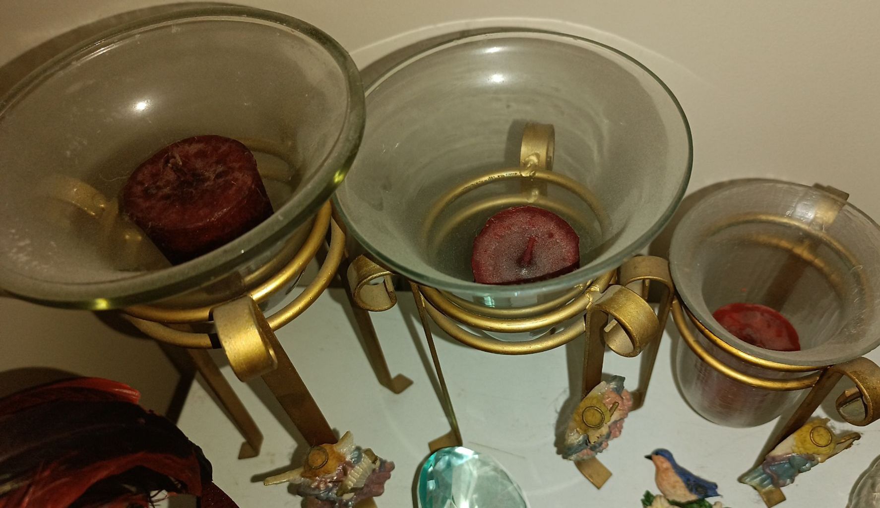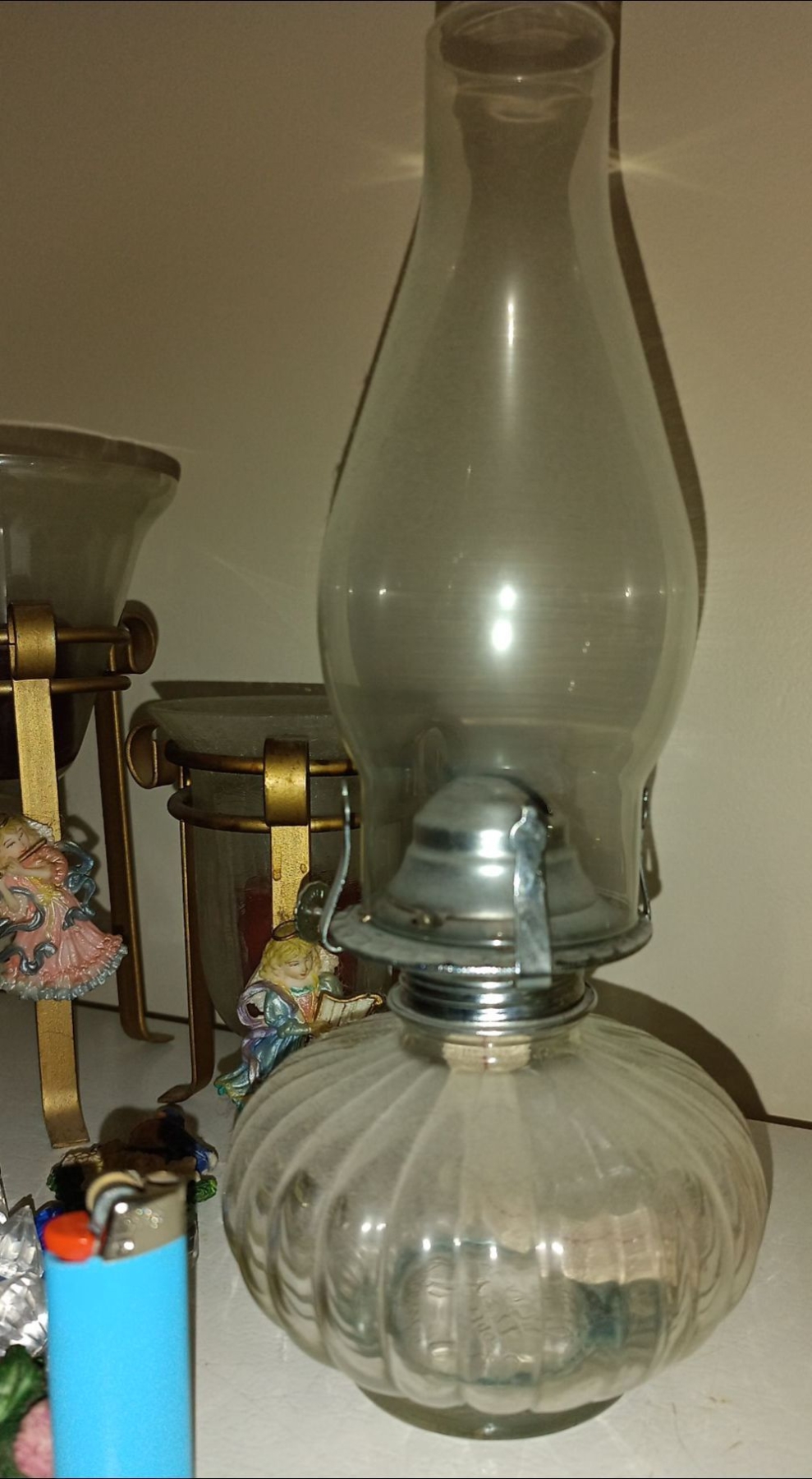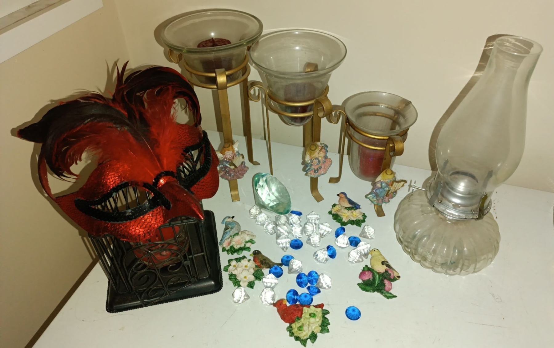 Vintage Oil Lamp w/Assorted Home Decor Mini Bird Cage, Bird Mask, Fridge Magnets And Matching Candle Stands