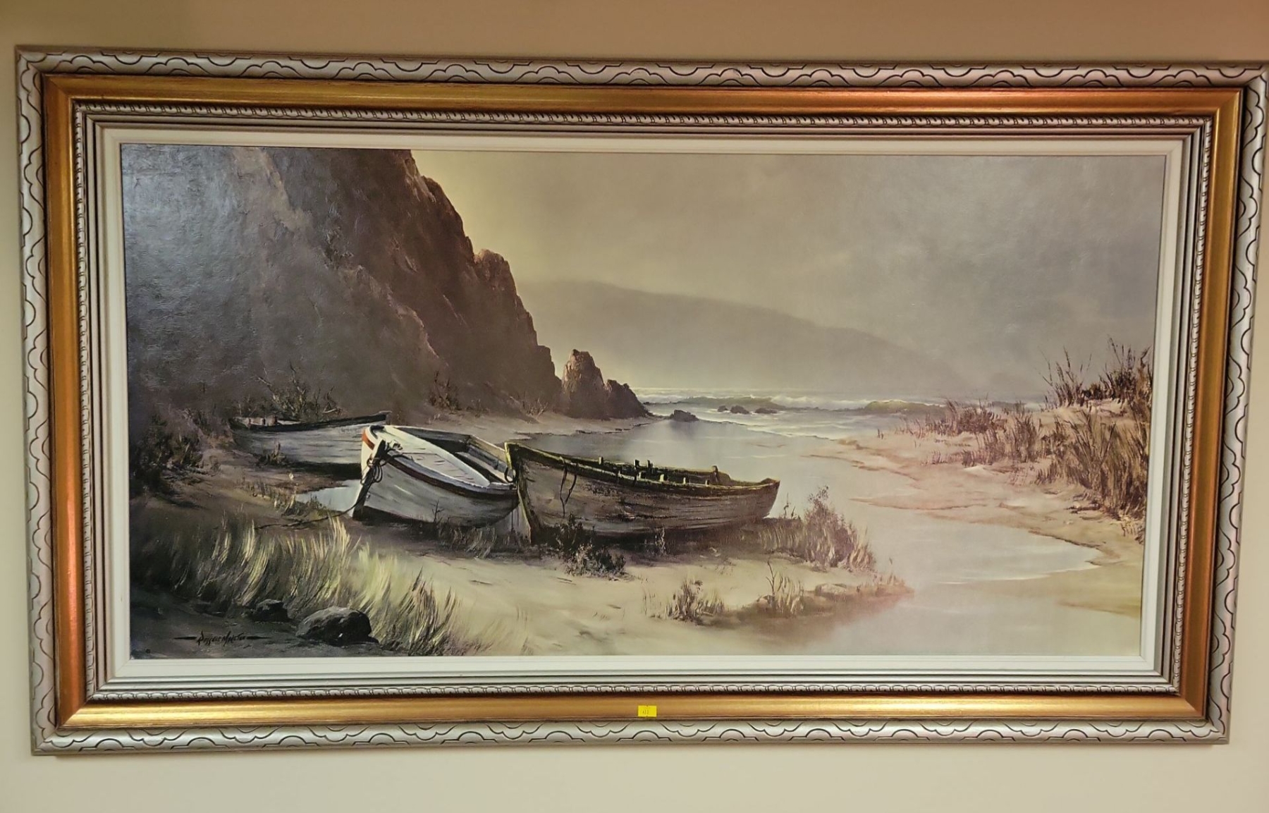 Vintage Oil On Board Seascape Painting of  Beached Boats' By Russel Moreton