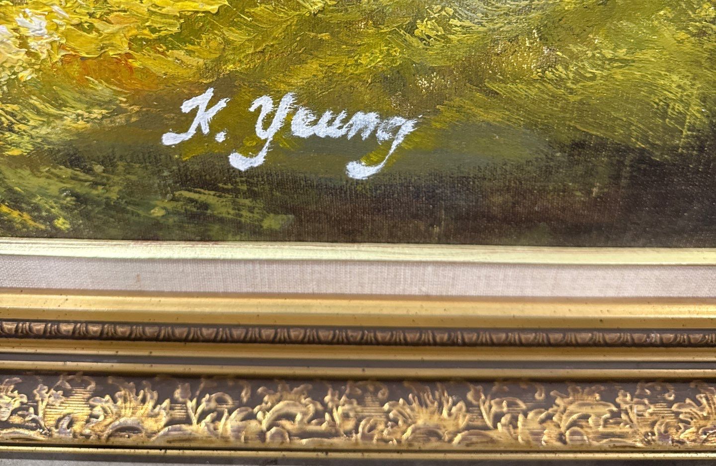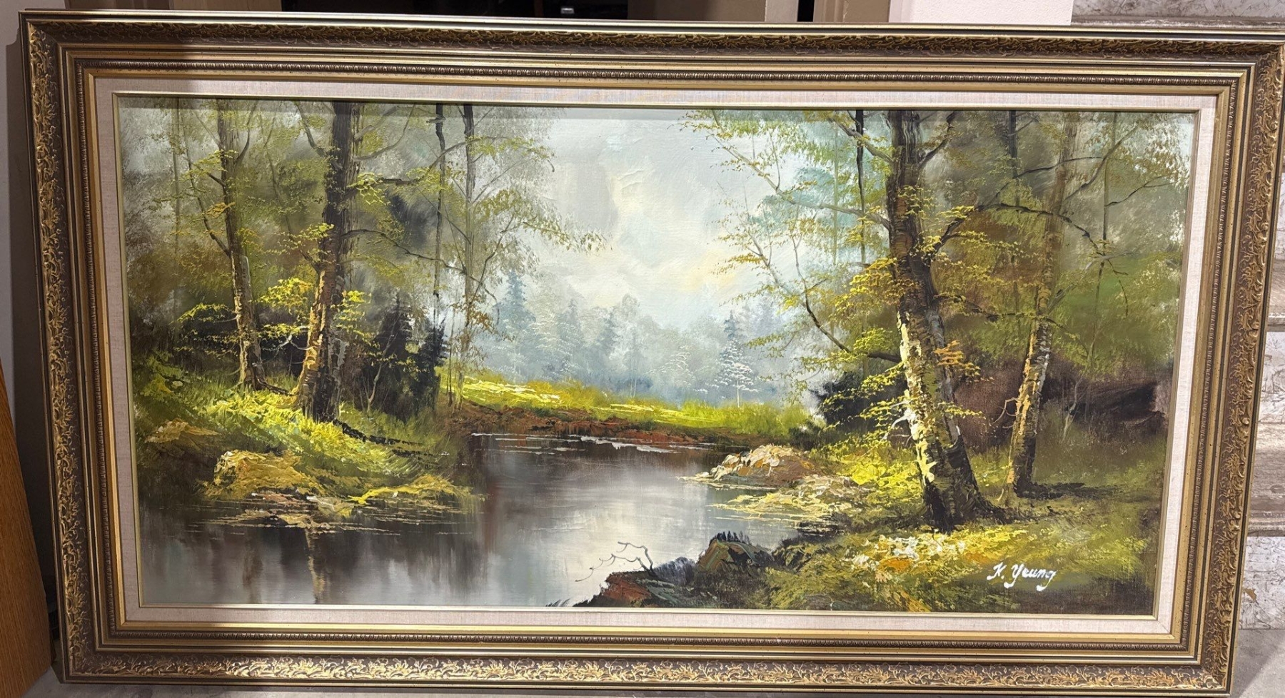 Vintage Oil On Canvas Landscape Painting-Forest & River in Foreground By K.Yeung