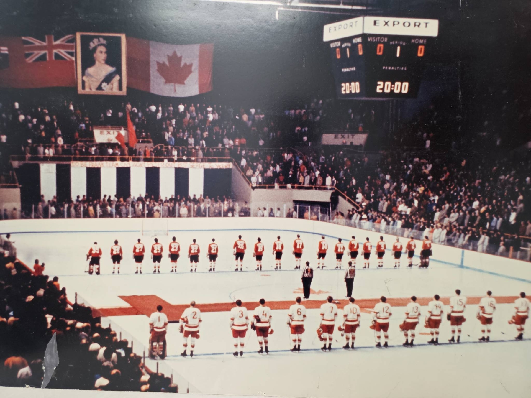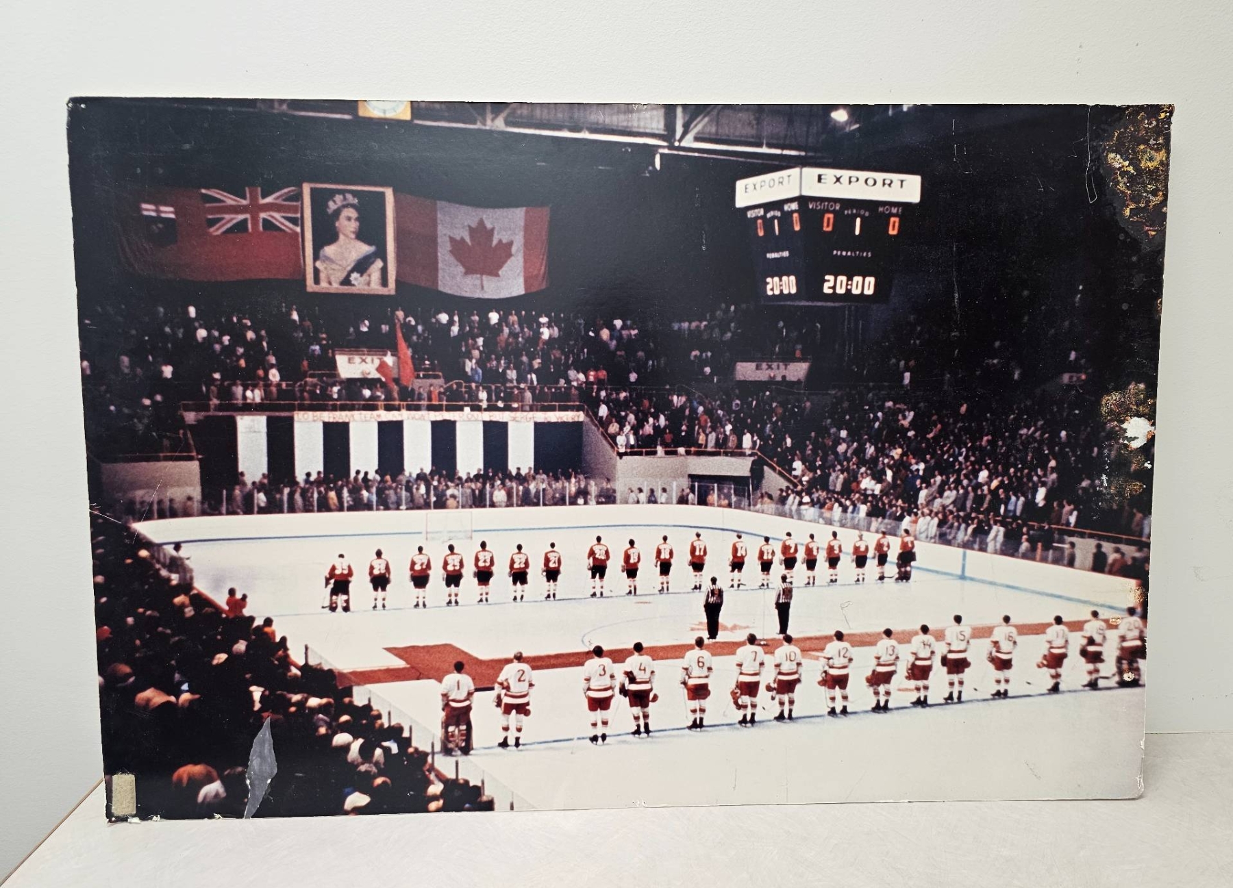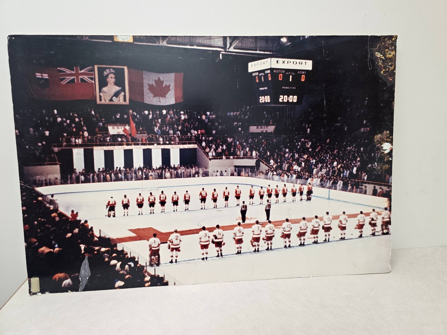 A vintage print depicting a hockey game scene in an indoor arena, likely from an iconic match. The print features the Canadian and Union Jack flags, a portrait of Queen Elizabeth II, and a standout crowd. Visible scoreboard shows a tied score at 0-0. Minor wear on edges, presenting a nostalgic moment in sports history.