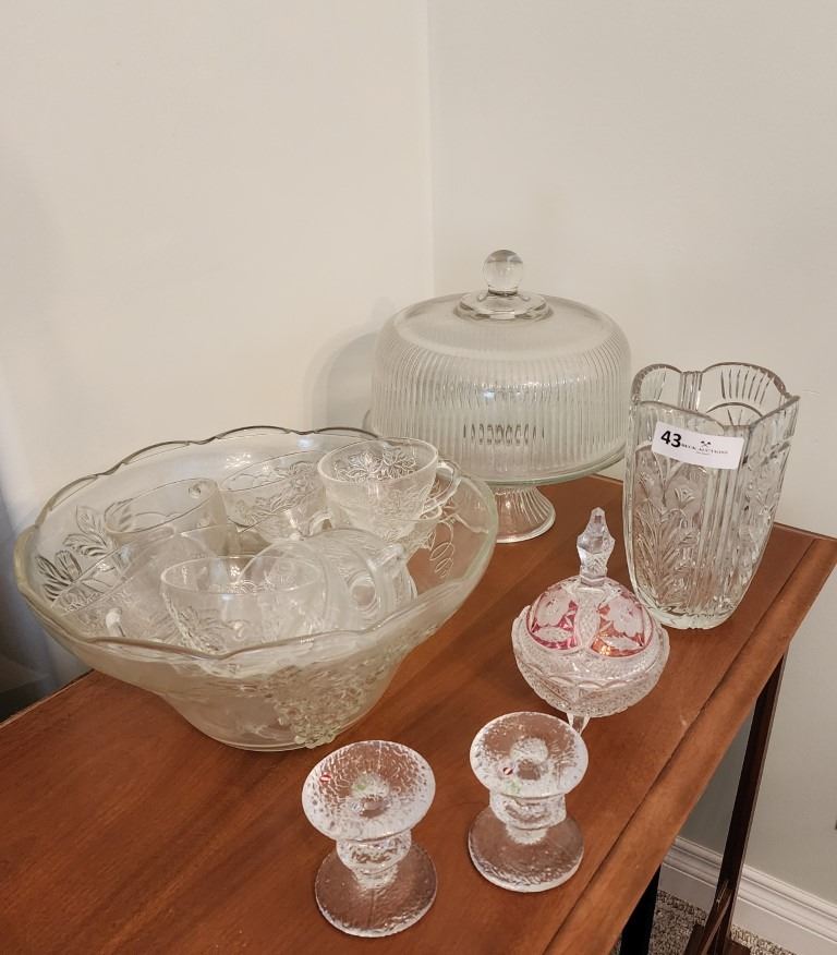 Vintage Punch Bowl with cups, glass cake stand, vase, candle holders, candy dish