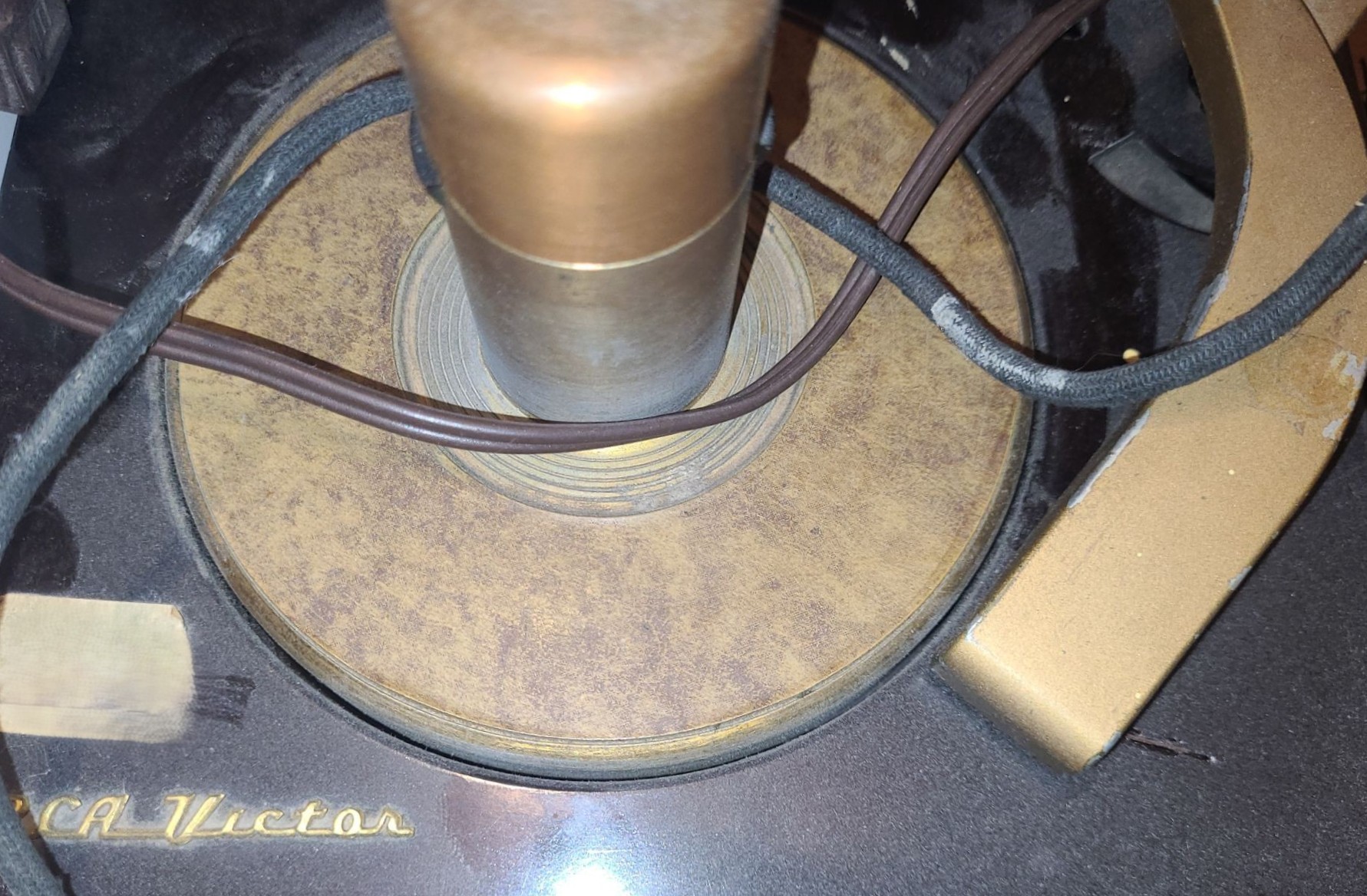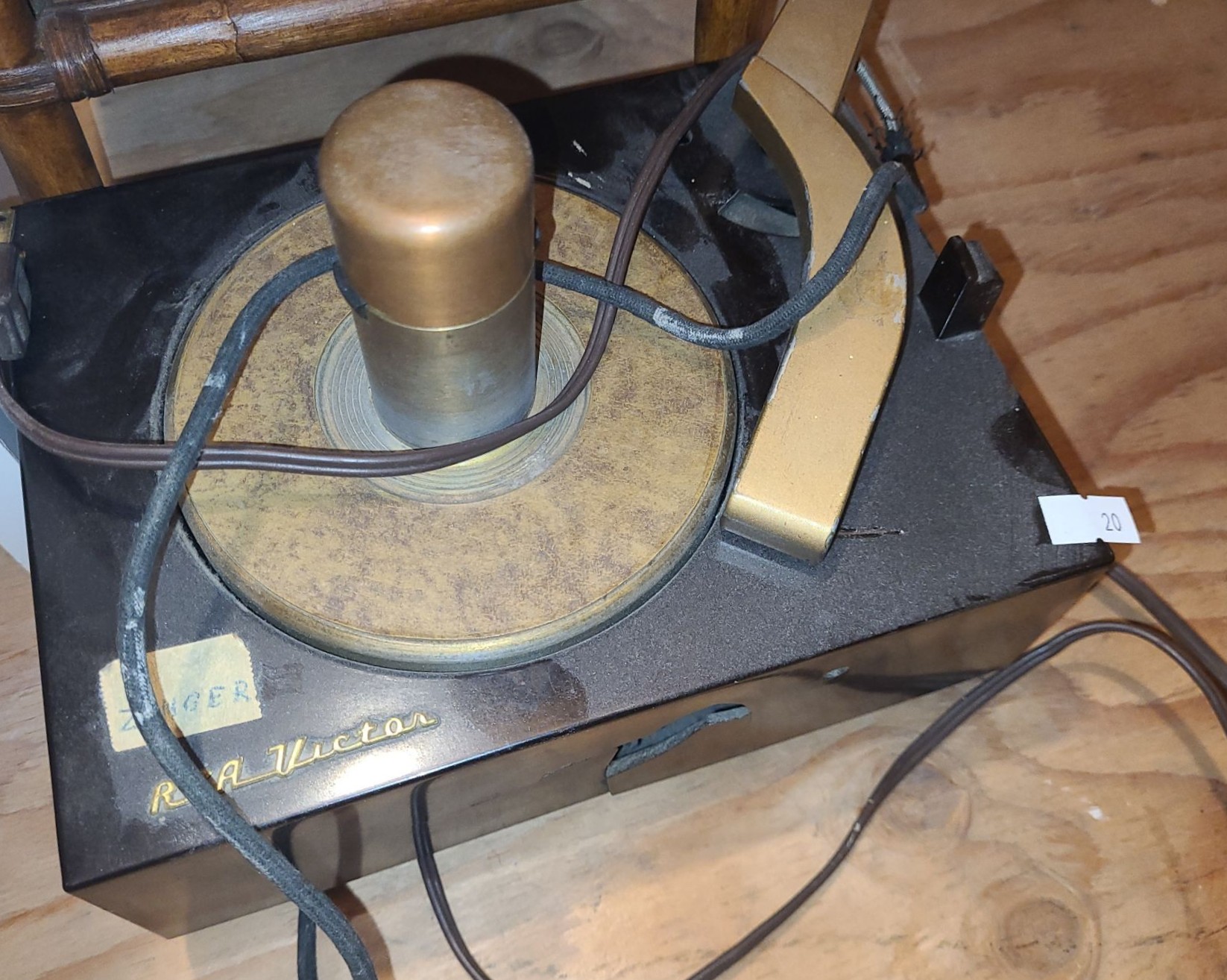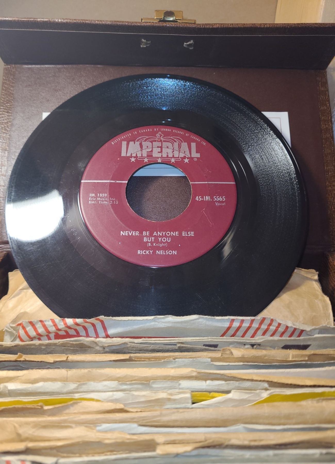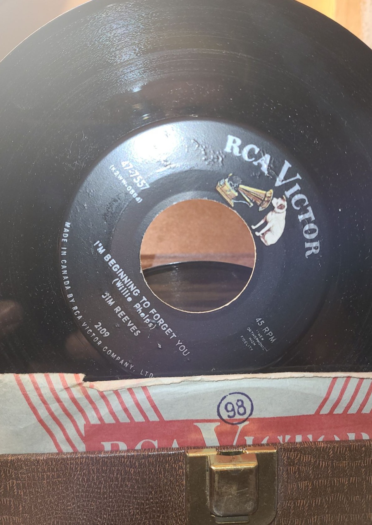 Vintage RCA Victor Record Player, Display Shelf 9 W, 9 D, 32 T and Collection of Vintage 45's