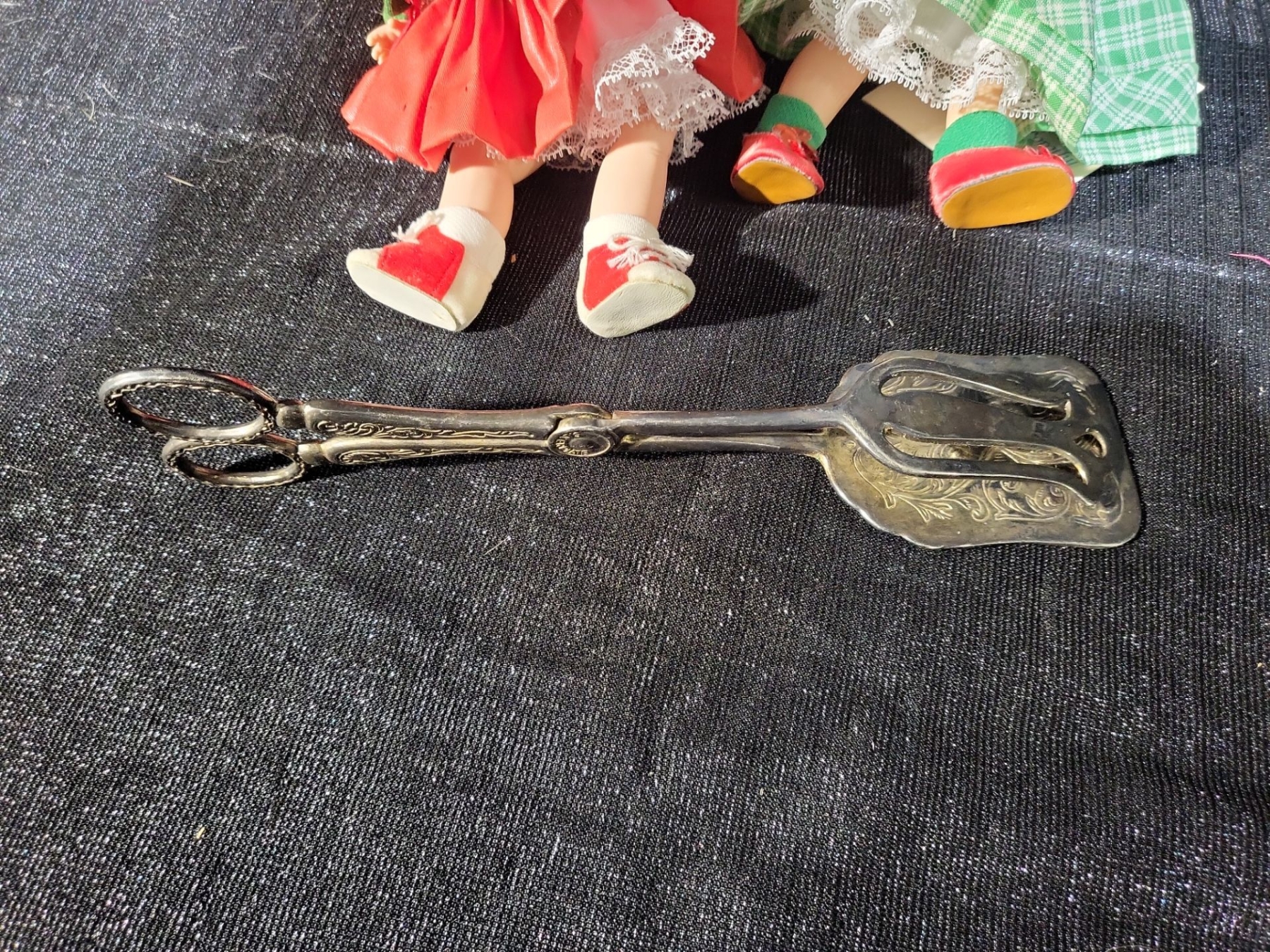 The tongs are made of silver-plated metal and have a scissor-like handle.