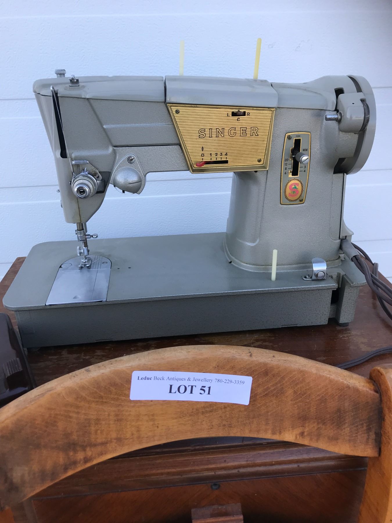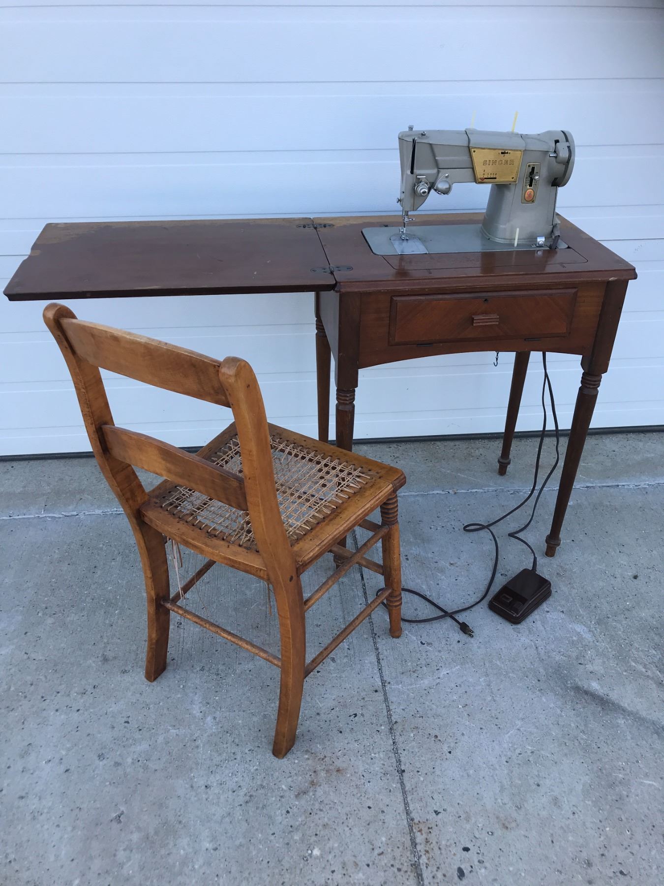 Vintage Singer Sewing Machine & Cabinet, Wood Chair w Caned Seat