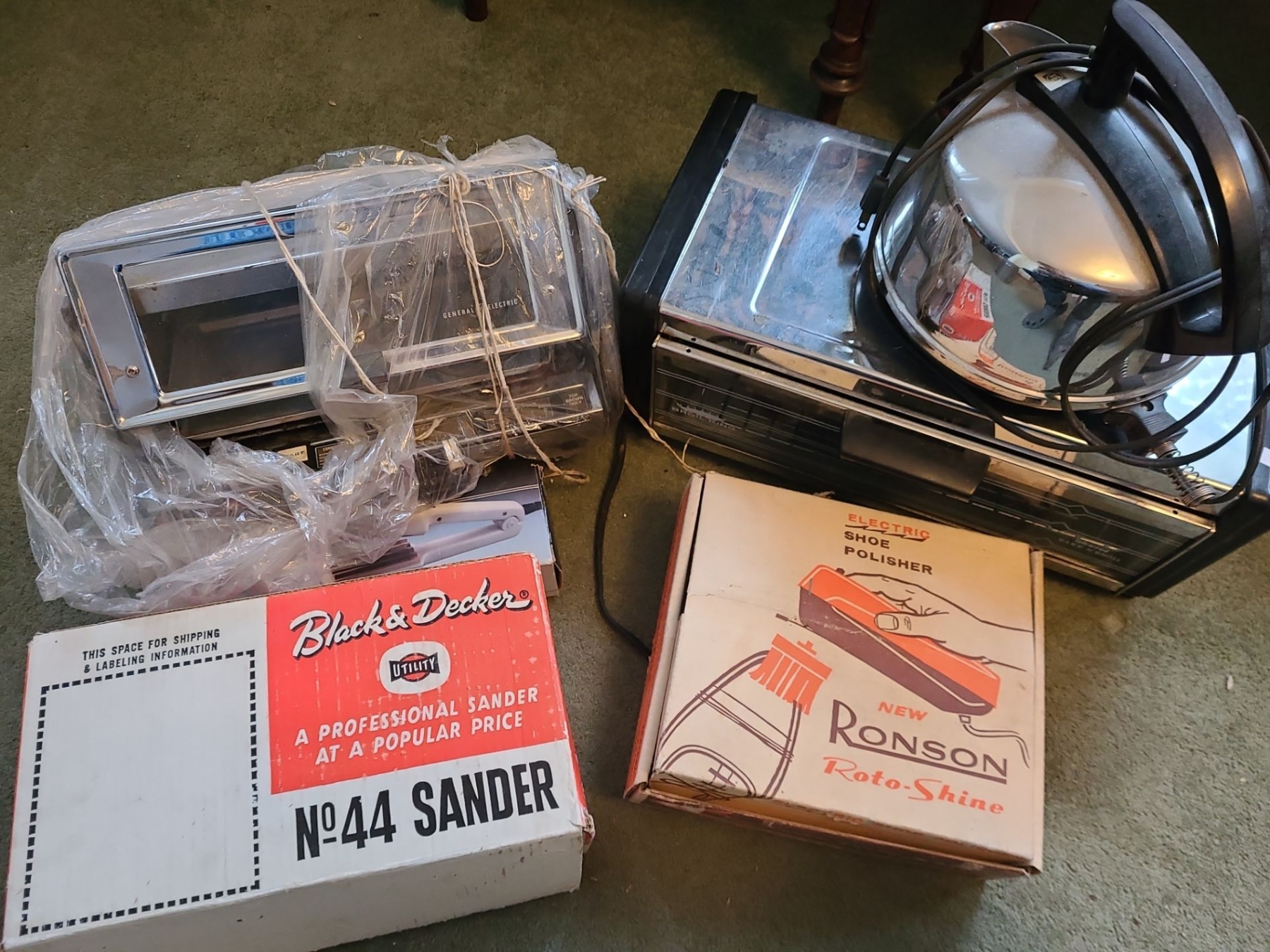 Vintage Small Appliances Including Kettle, Toaster Oven, Sander and Shoe Polisher