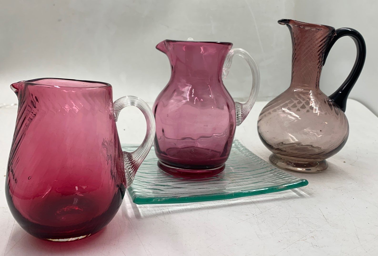 Vintage Small Cranberry Pitcher, Amethyst Creamer, and Purple Green Gradient Ribbed Glass Pitcher