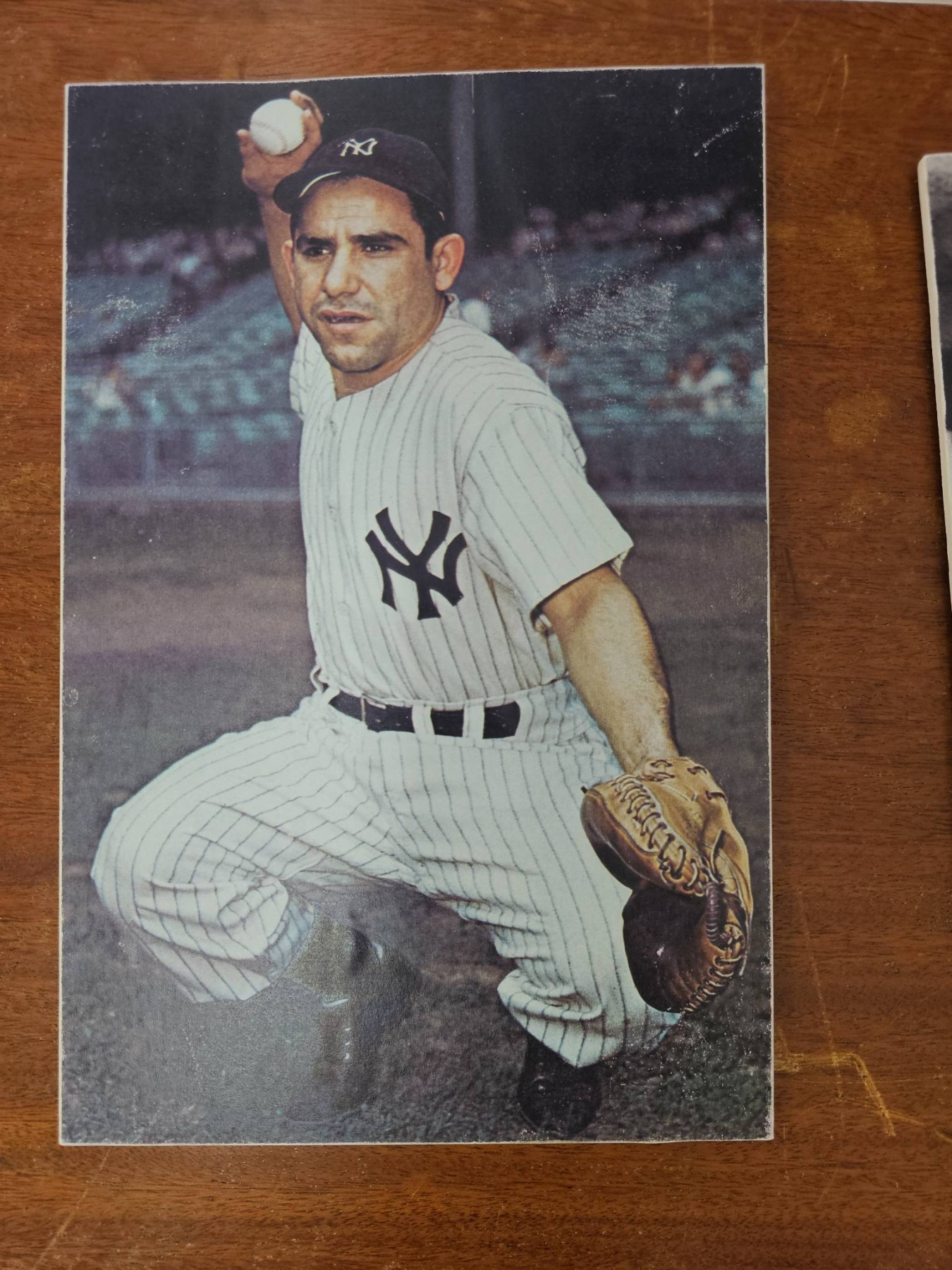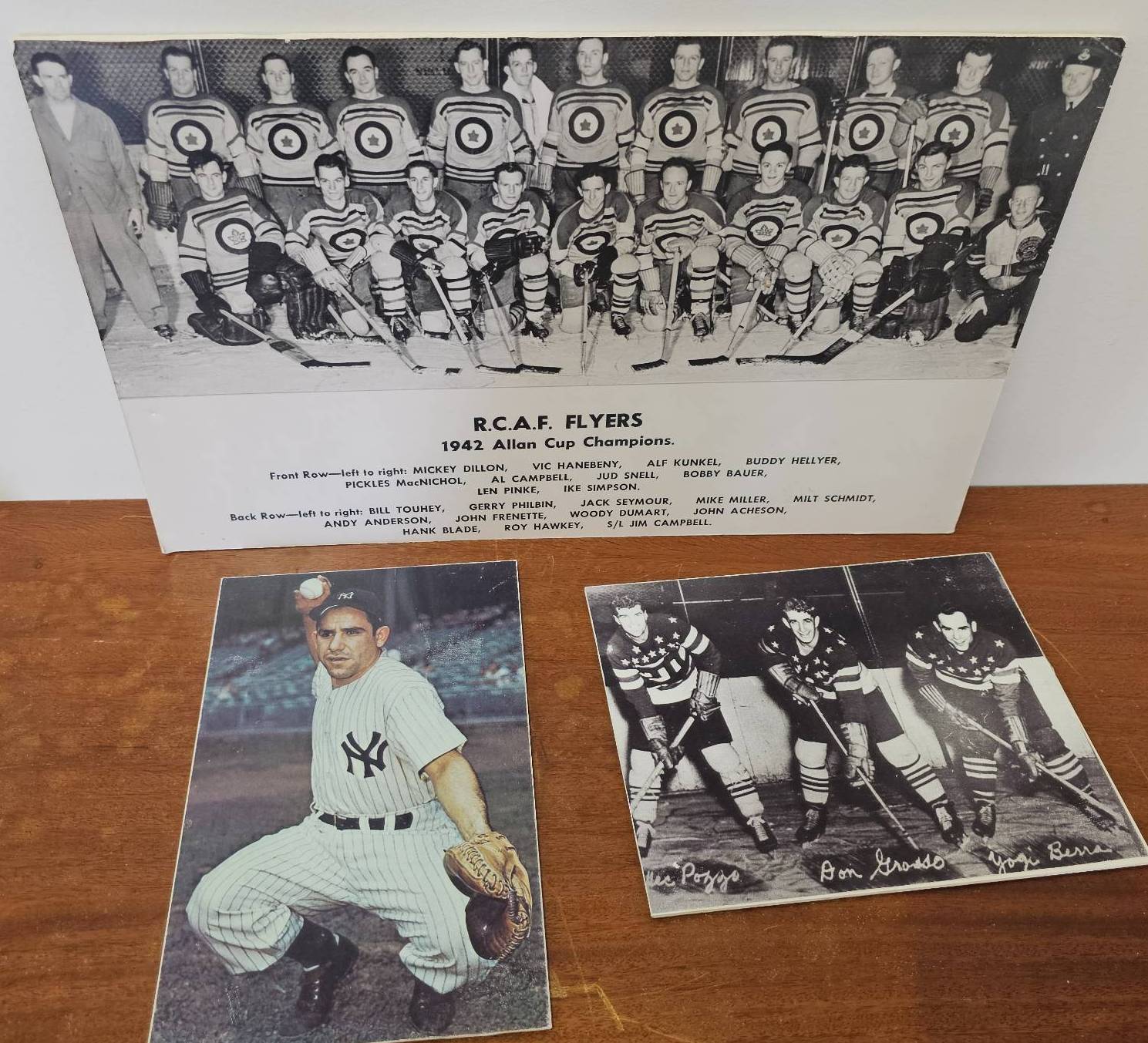 Three sports-related photographs, including a team photograph of the RCAF Flyers 1942 Allan Cup Champions, a color photograph of a New York Yankees player in uniform, and a black-and-white photograph of three hockey players on ice. The images appear to depict iconic sports figures and moments from baseball and hockey history.