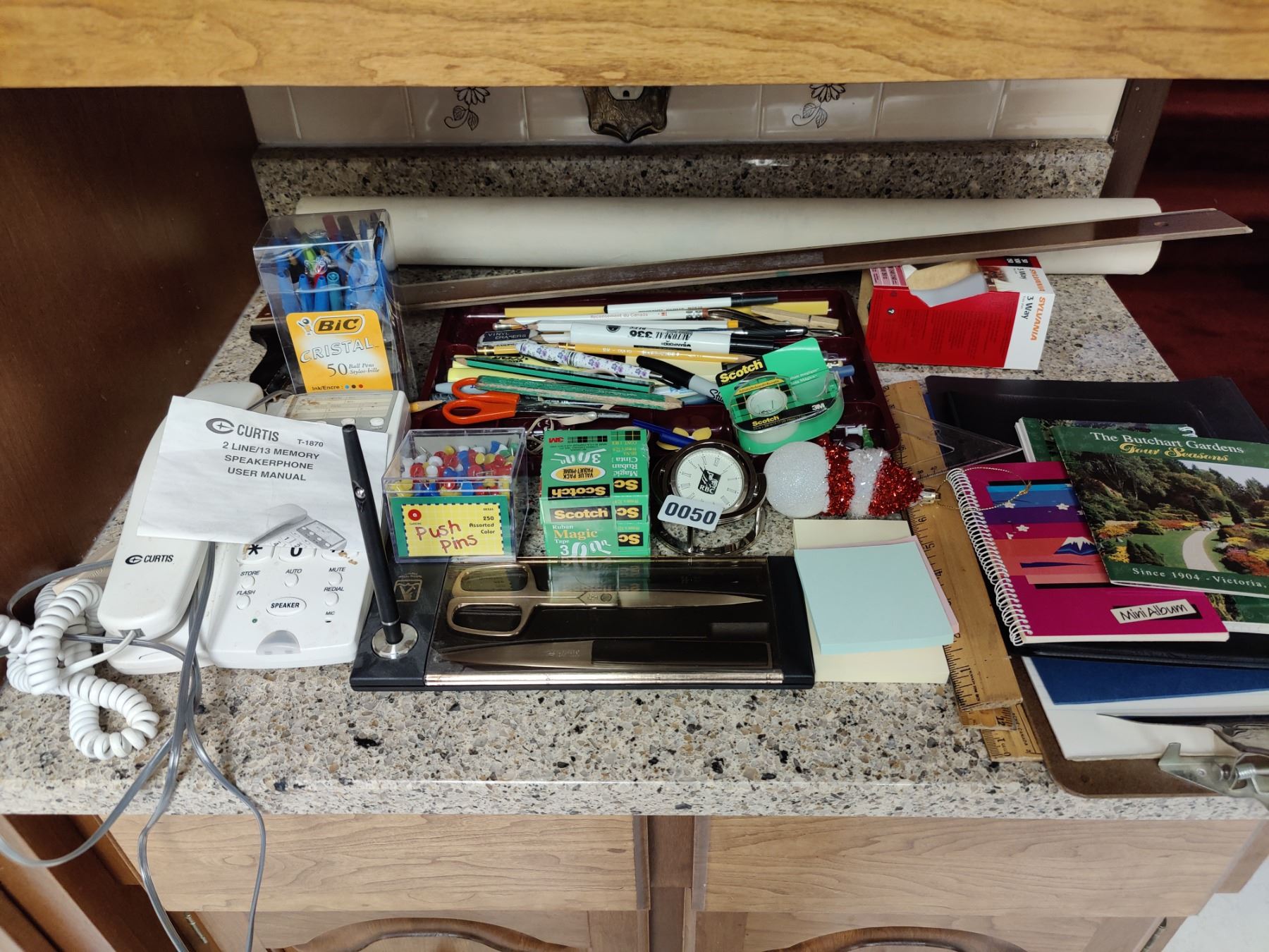 Curtis Speakerphone, Vintage map of Alberta, misc. office supplies & stationary.