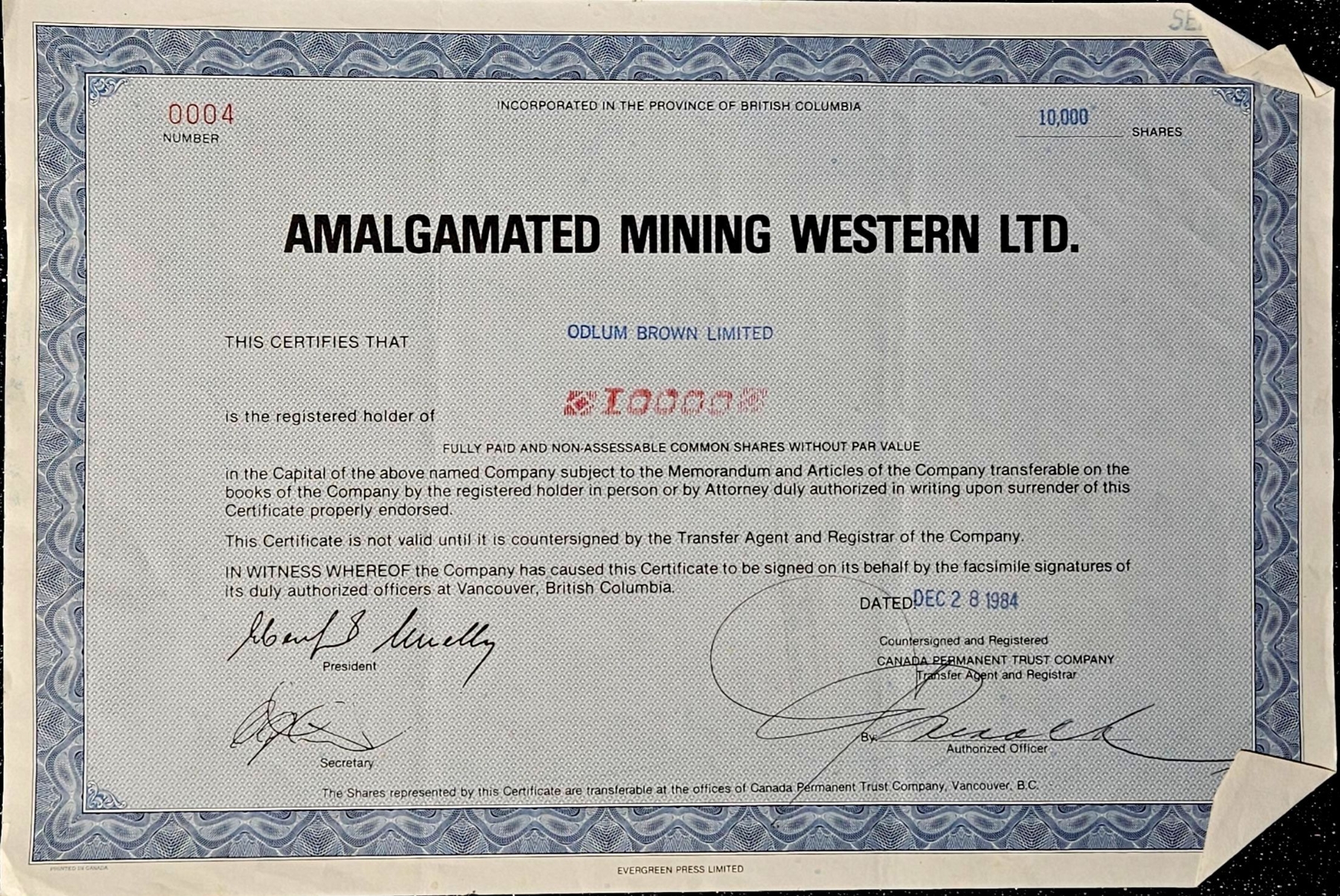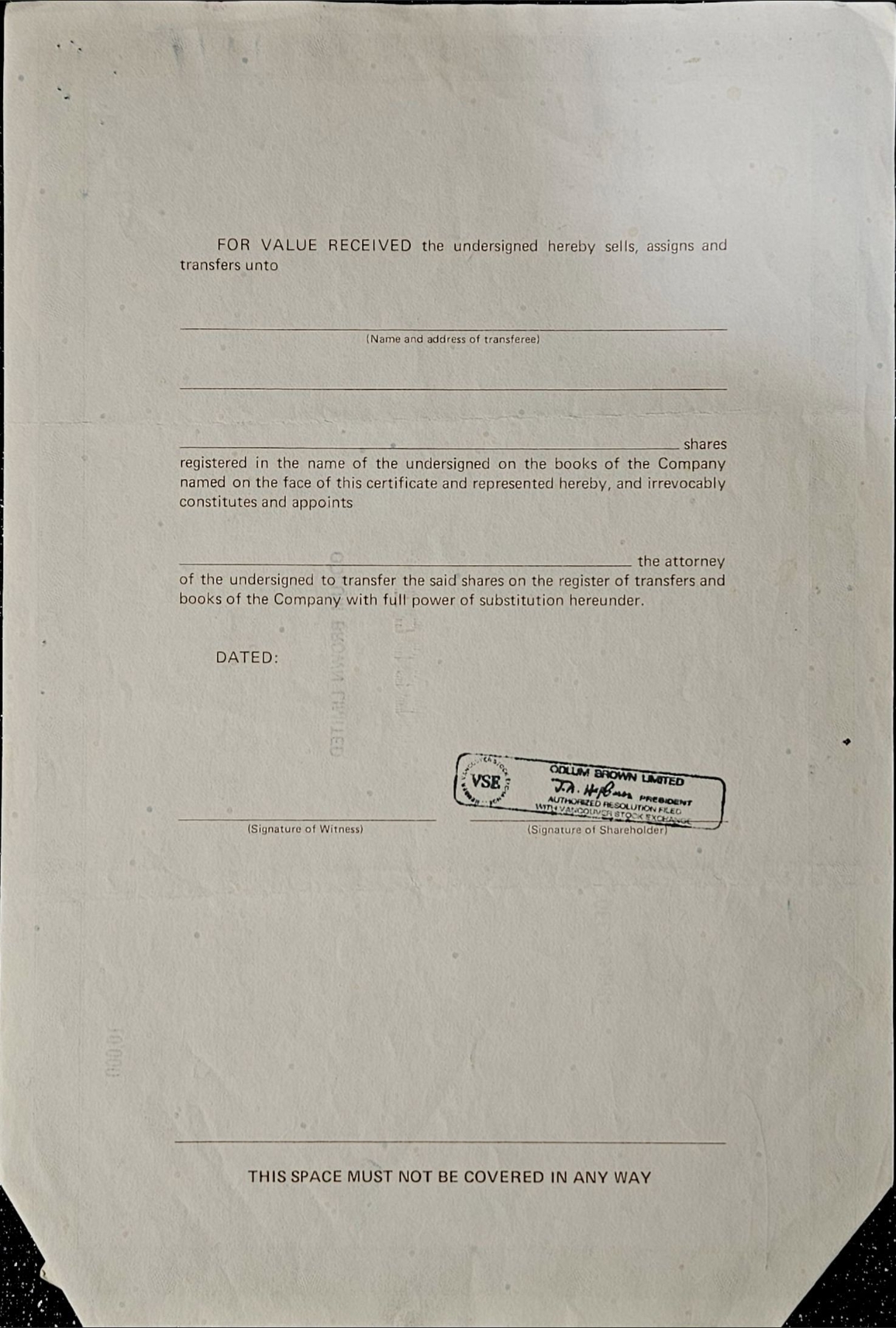 Vintage stock certificate with its authenticity papers.