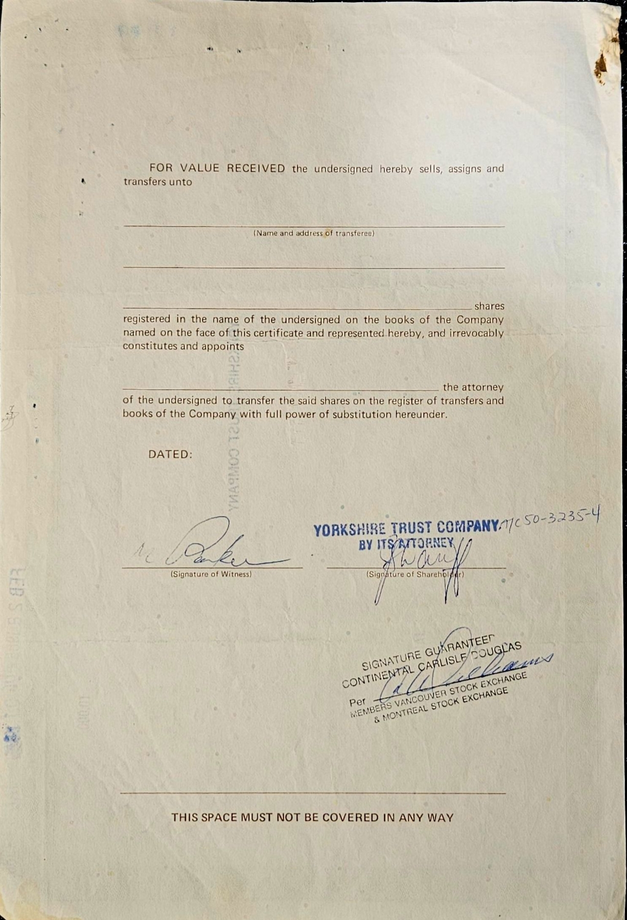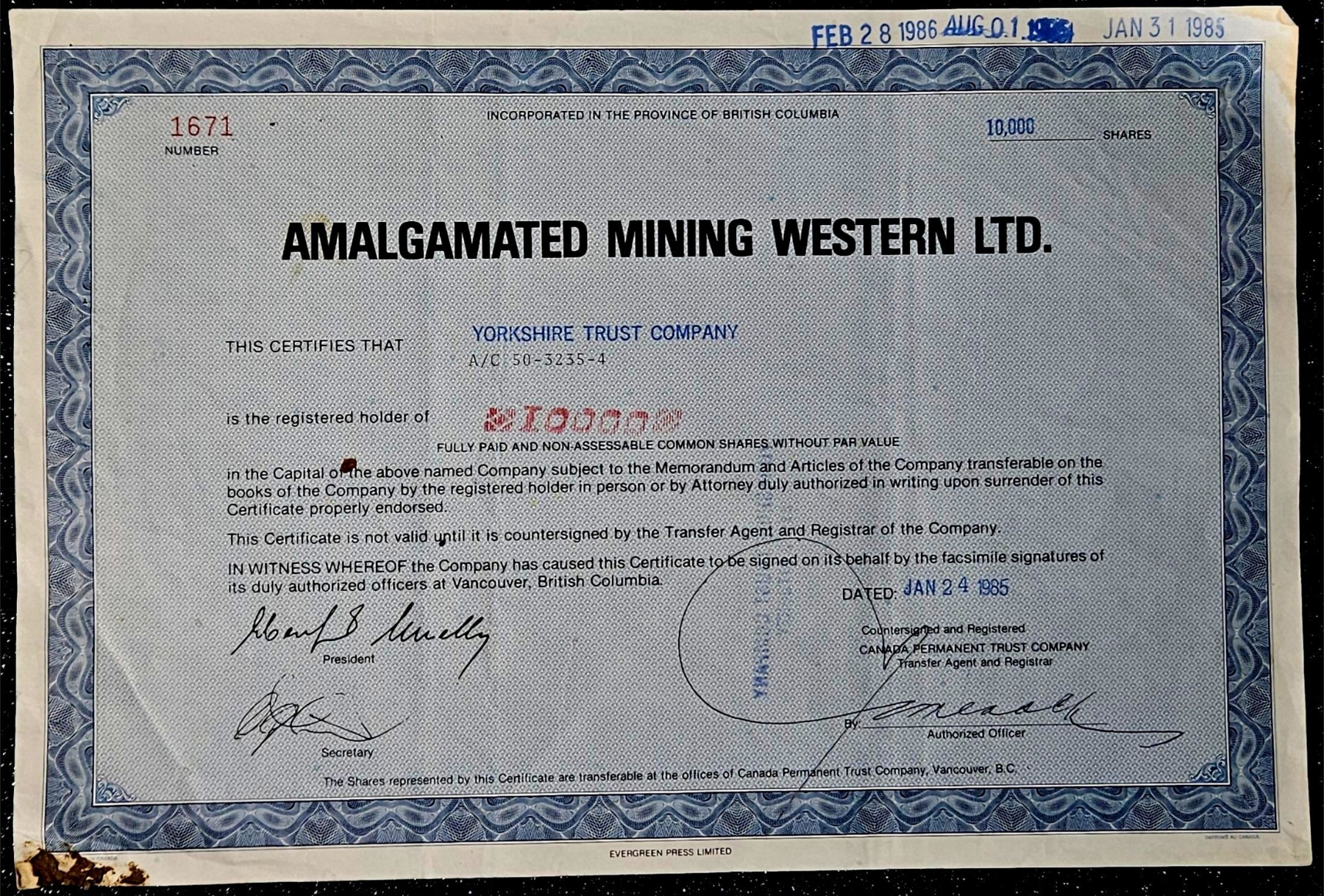 Vintage stock certificate with its authenticity papers.
