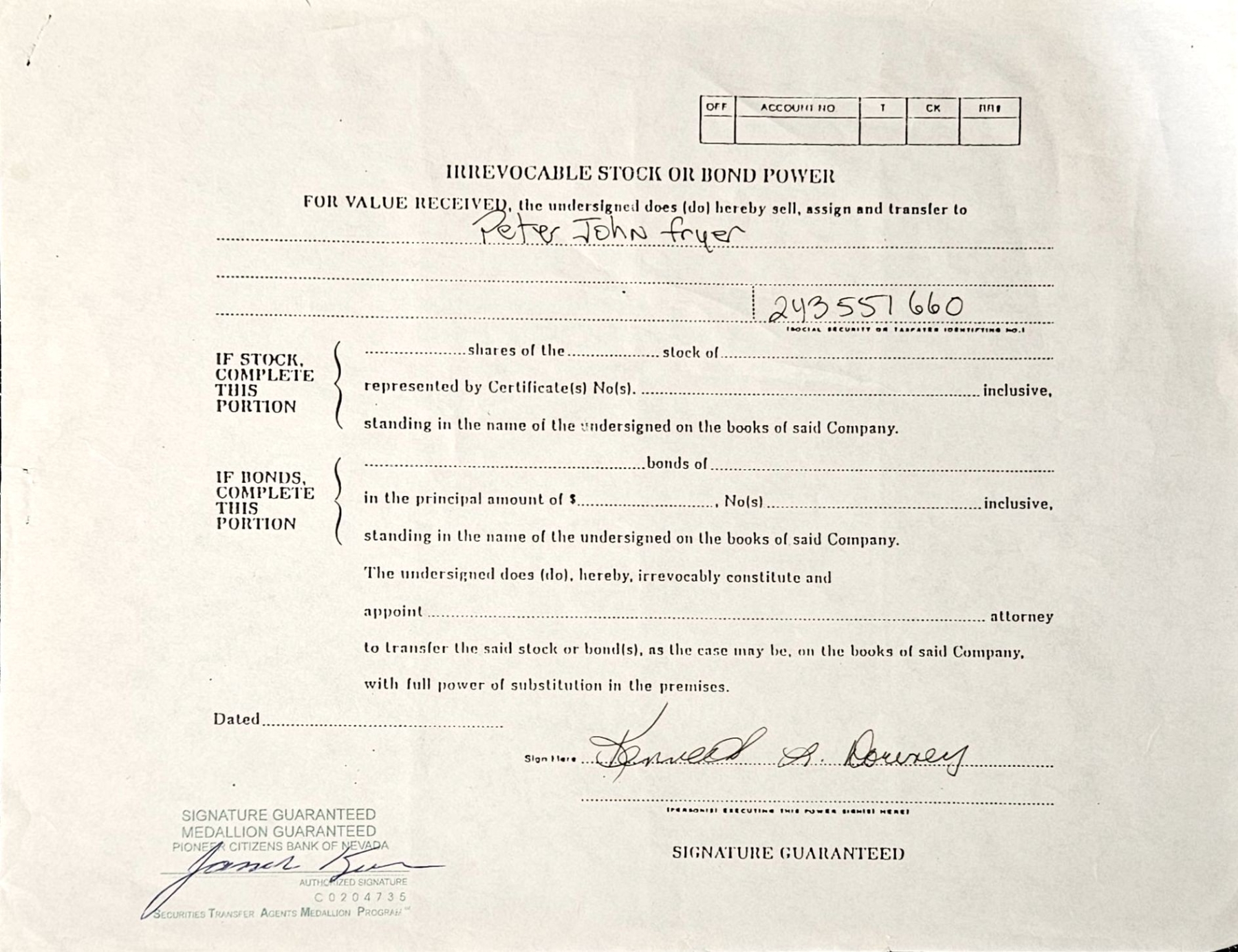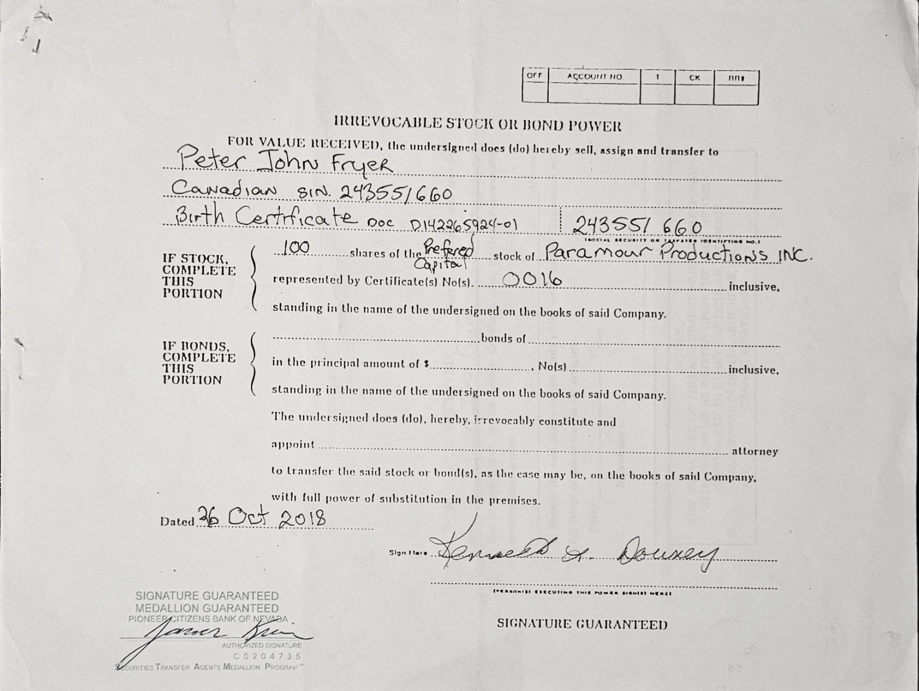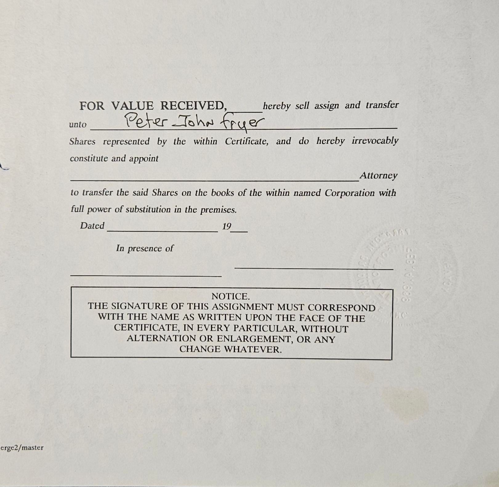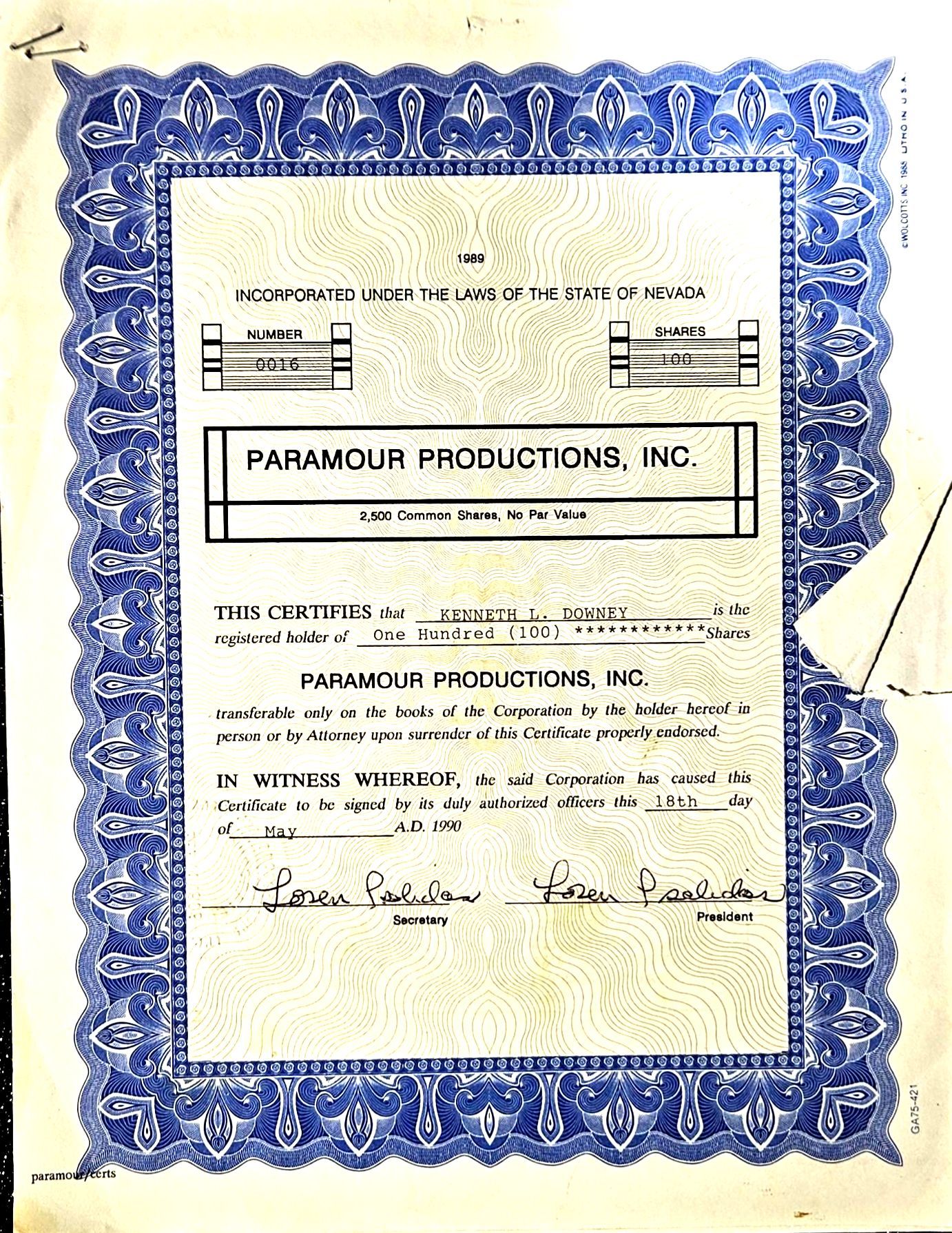 Vintage stock certificate with its authenticity papers.