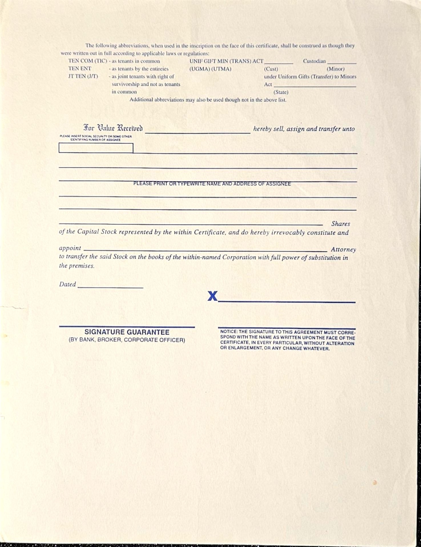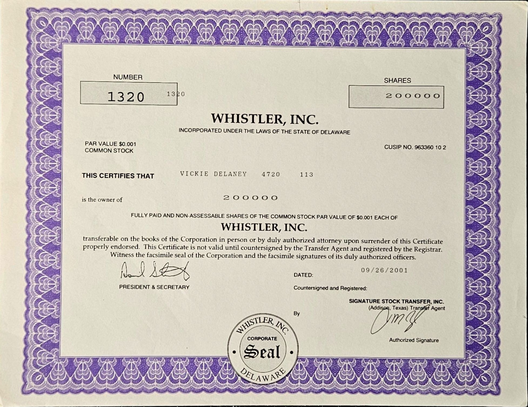 Vintage stock certificate with its authenticity papers.