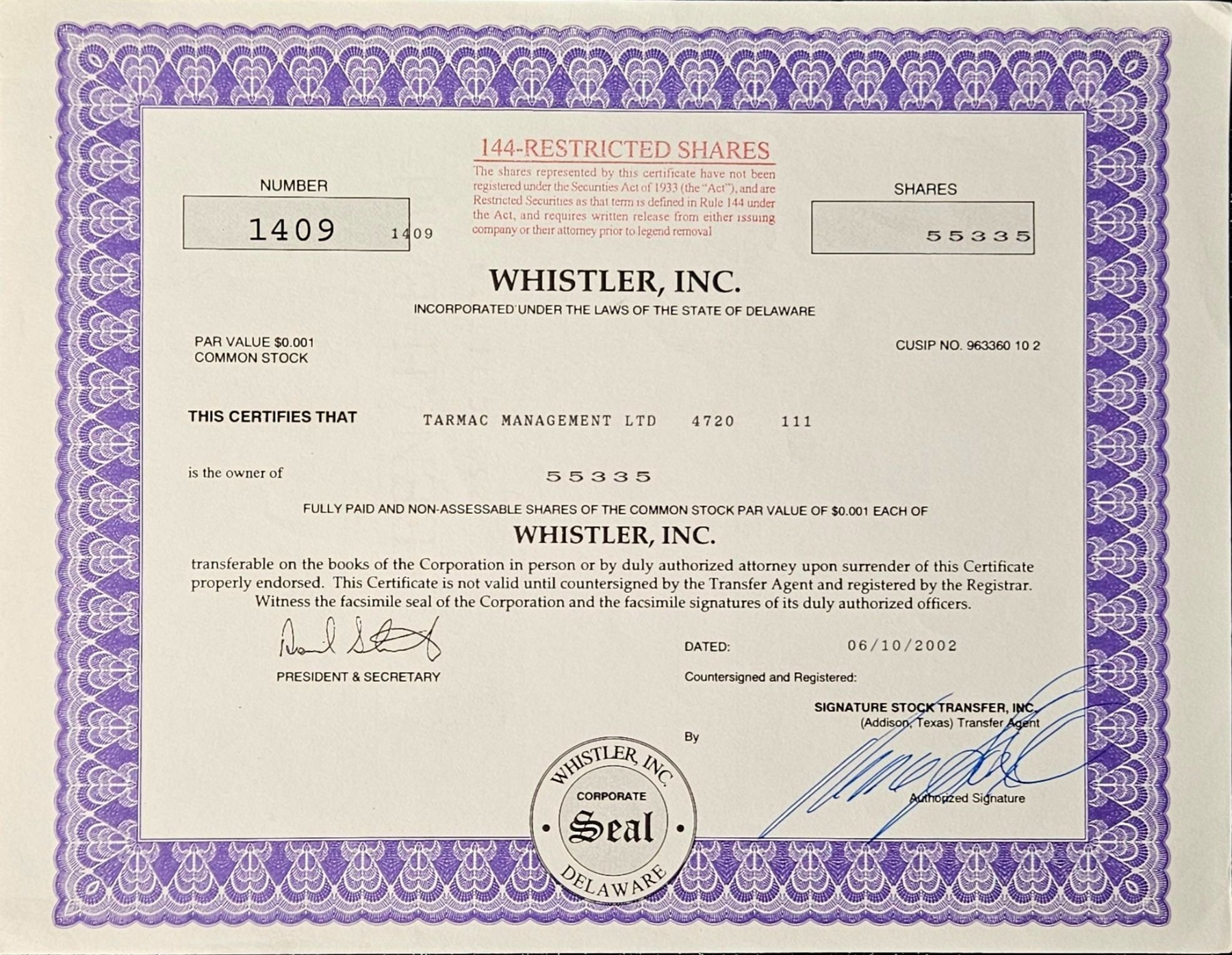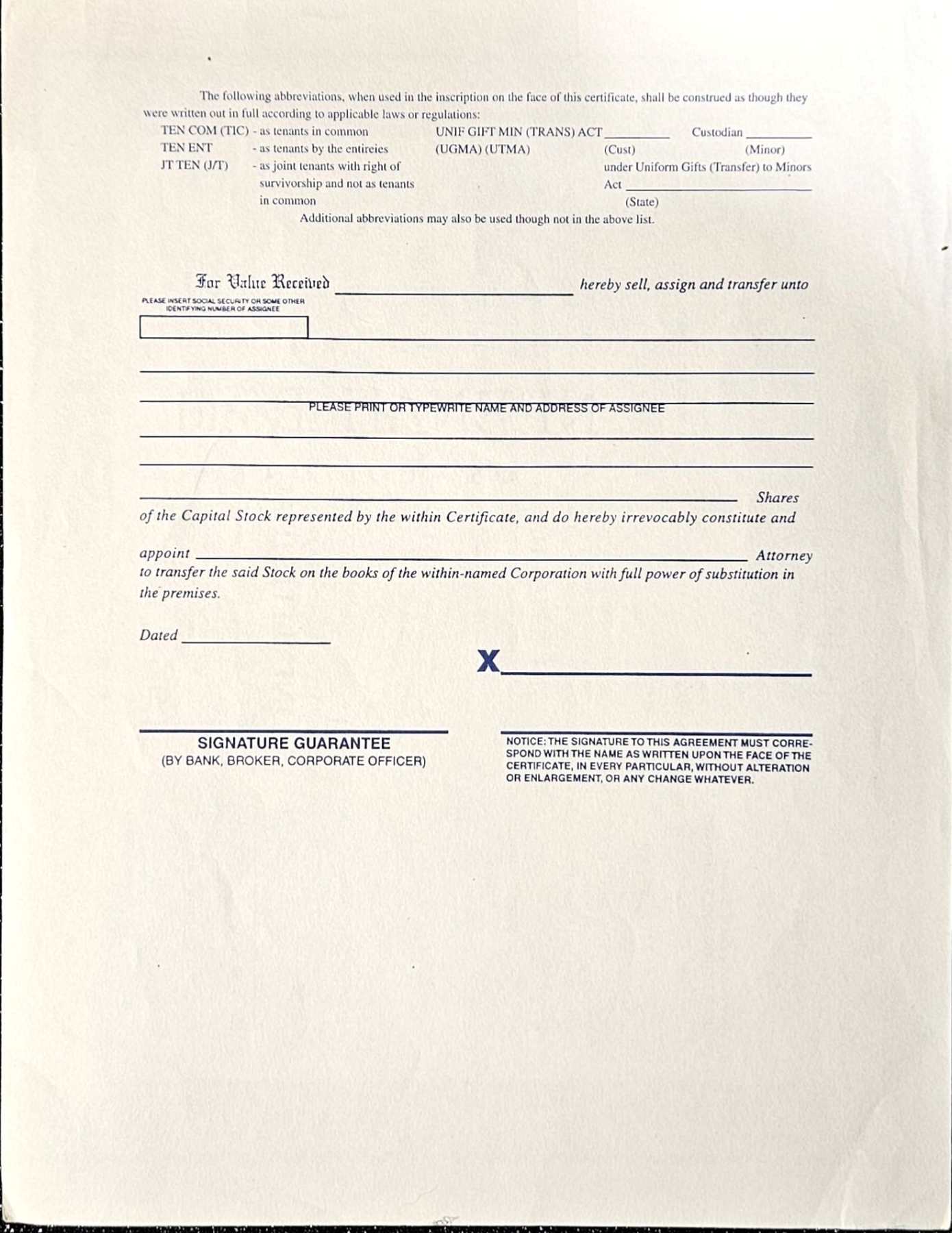 Vintage stock certificate with its authenticity papers.
