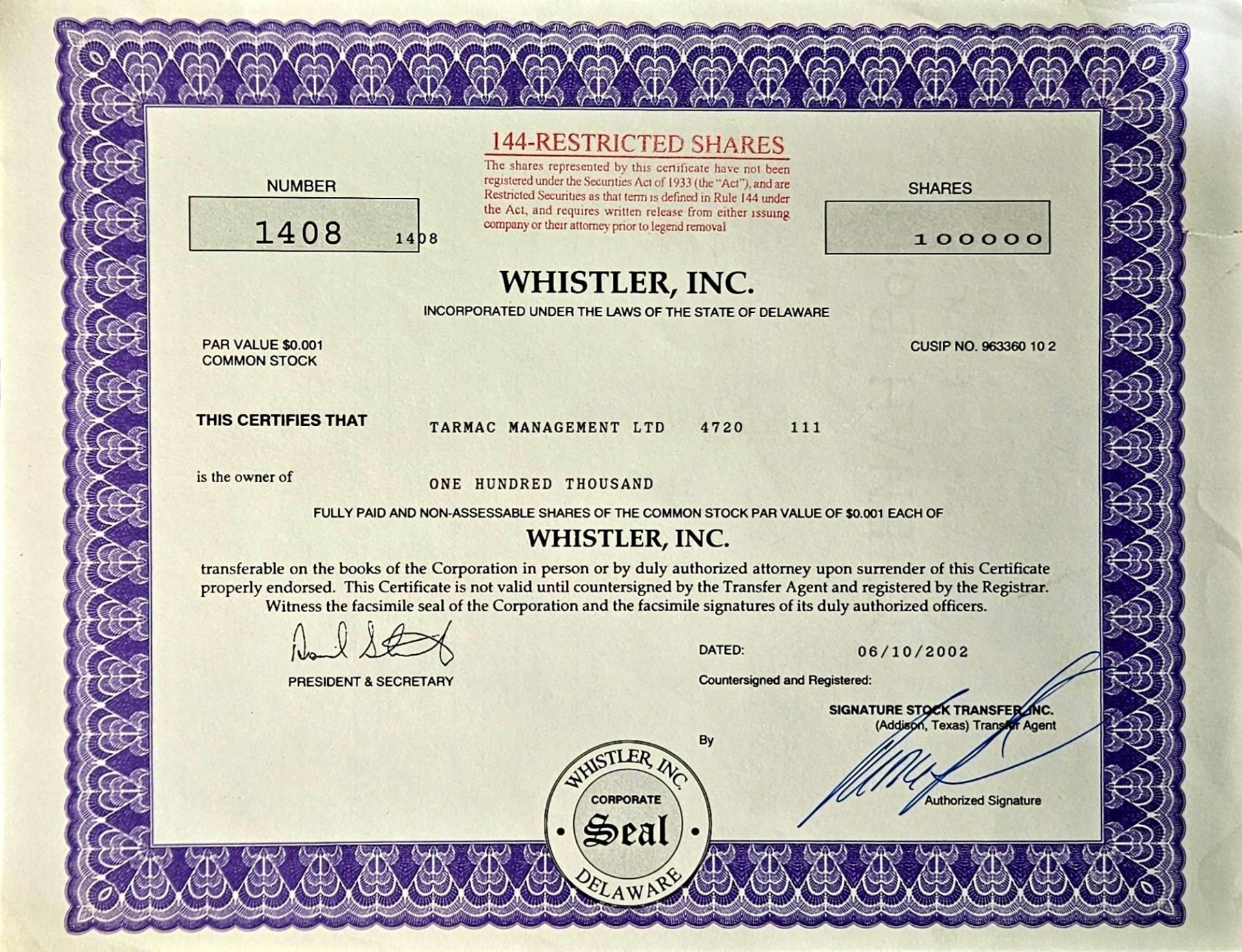 Vintage stock certificate with its authenticity papers.