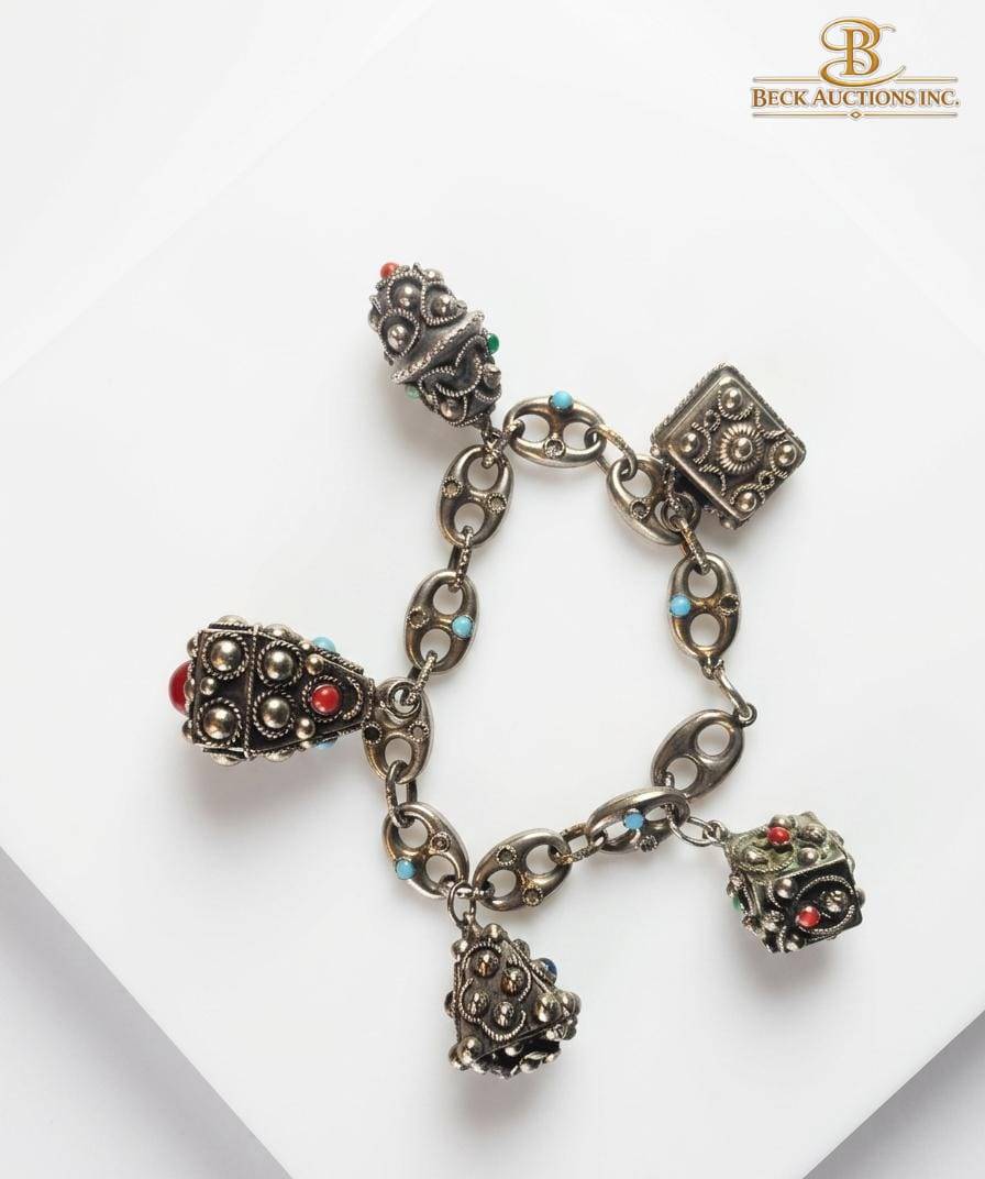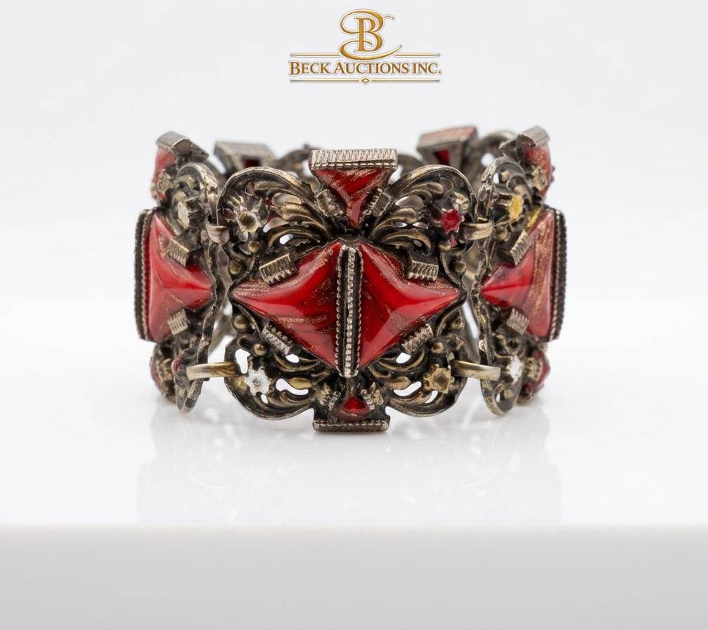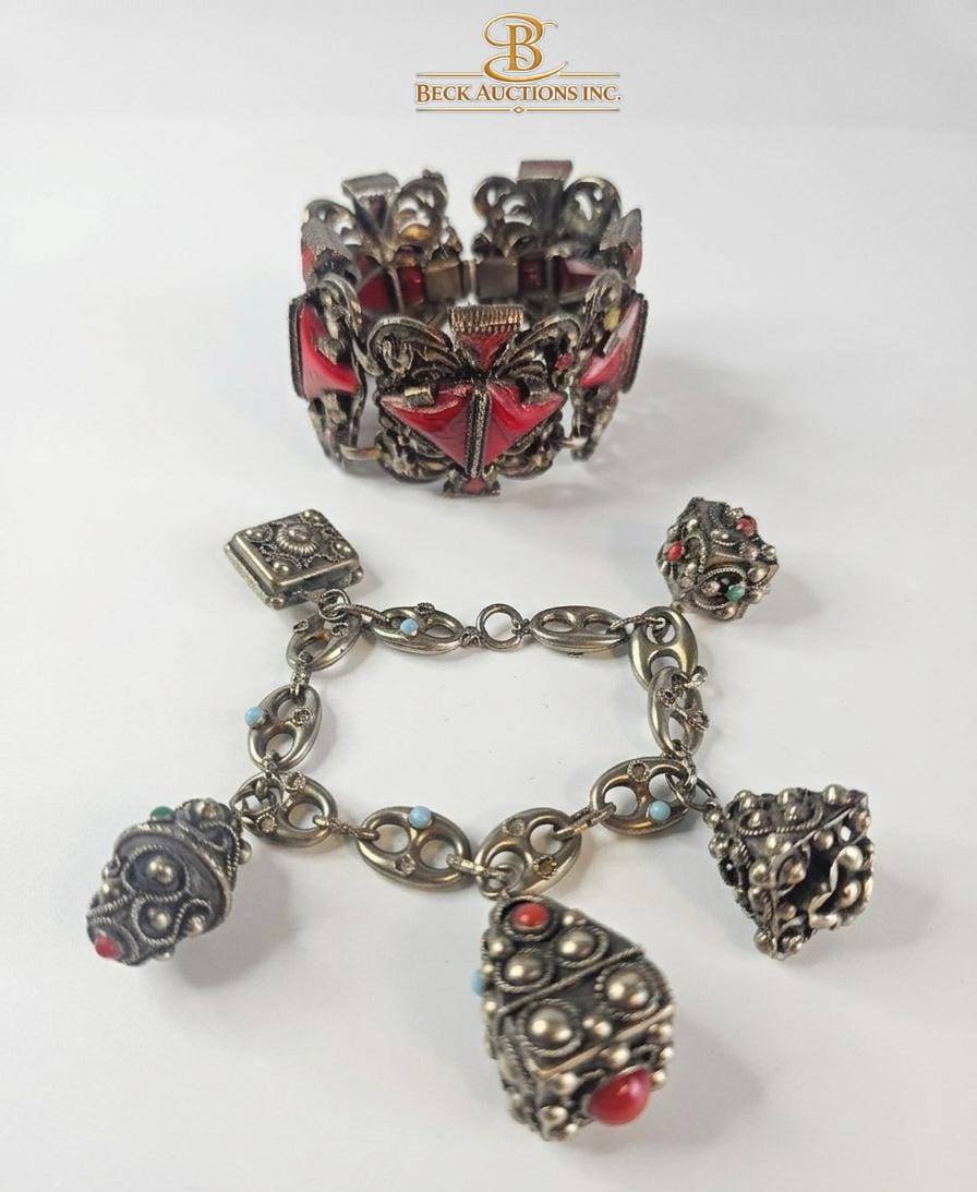 Elegant costume jewelry set including a bold cuff bracelet with red triangular embellishments and intricate silver-toned detailing, paired with a charm bracelet featuring dangling decorative elements accented with red and turquoise stones. Both pieces exude rich design with ornamental patterns, perfect for collectors or statement jewelry enthusiasts. Dimensions not specified.