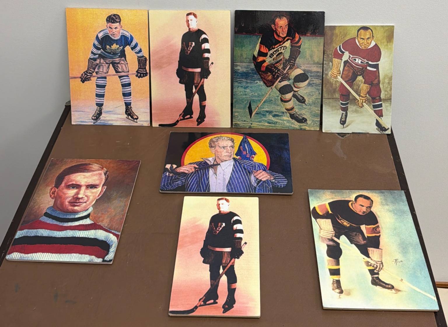9 high-quality prints featuring various historic hockey players in classic team uniforms. These vibrant images capture the essence of early hockey history, showcasing players from teams like the Boston Bruins, New York Rangers, and Montreal Canadiens. Each print highlights the details of vintage hockey gear and team logos, offering a unique glimpse into the sport's past. Ideal for hockey enthusiasts or collectors of sports memorabilia.