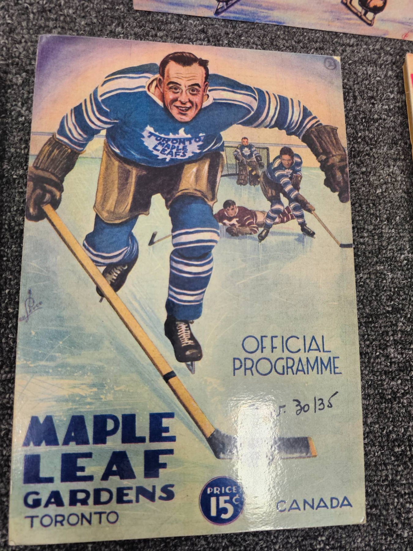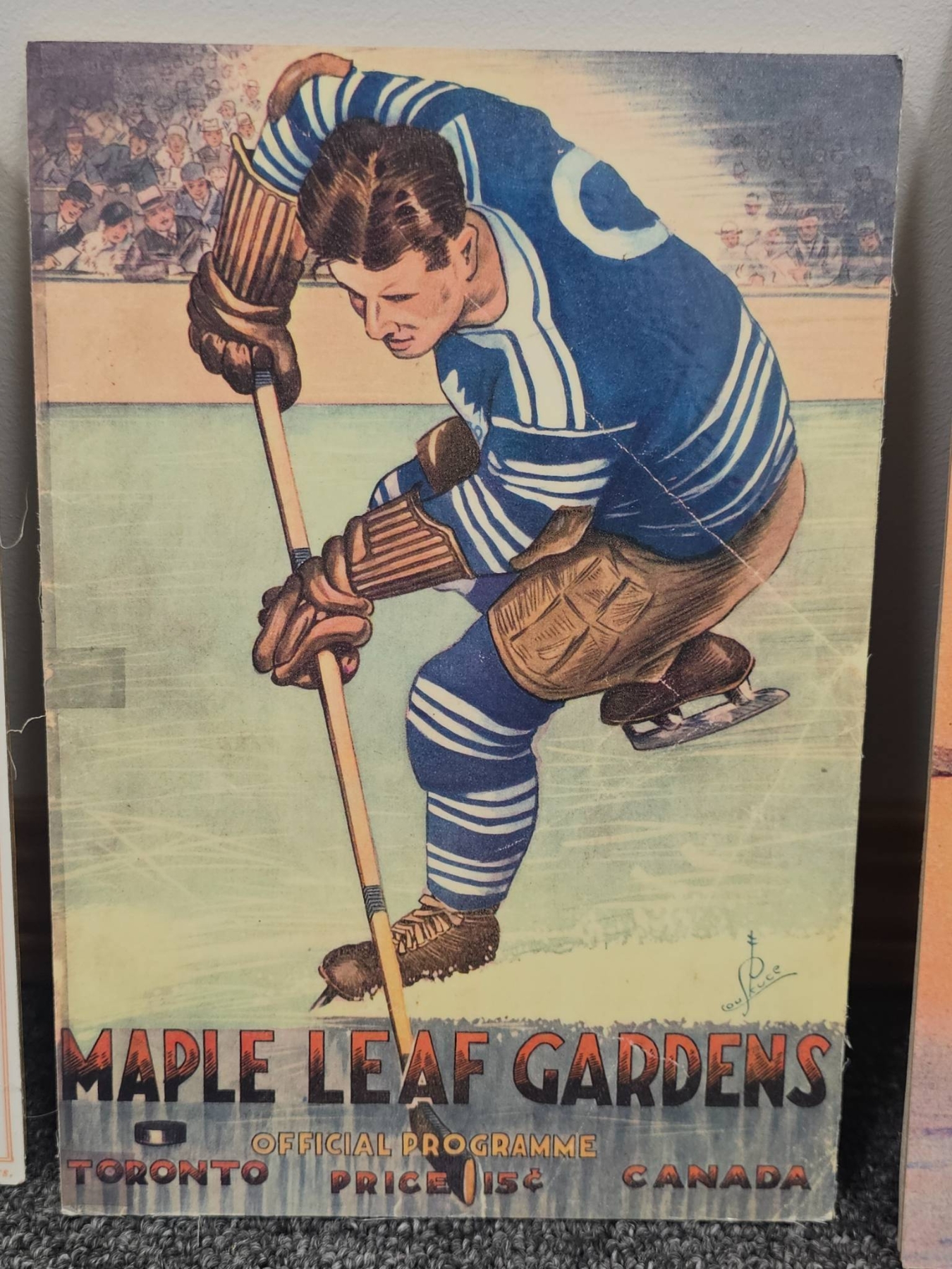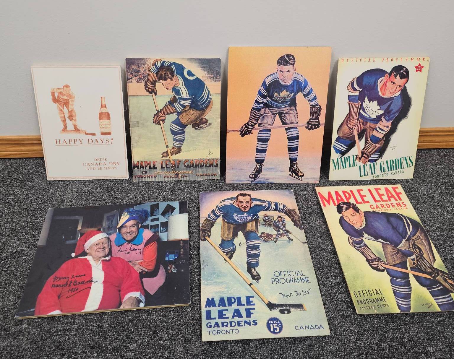 A unique lot featuring vintage Toronto Maple Leaf Gardens official programs, promotional posters, and memorabilia. These collectibles showcase colorful illustrations, hockey nostalgia, and historical details linked to one of the most iconic NHL franchises. Includes rare ephemera such as Canada Dry advertisements and festive signed items. A perfect addition for hockey enthusiasts, collectors, and sports historians.
