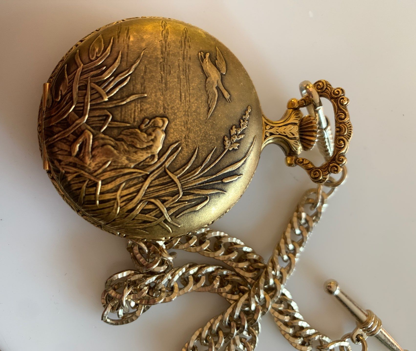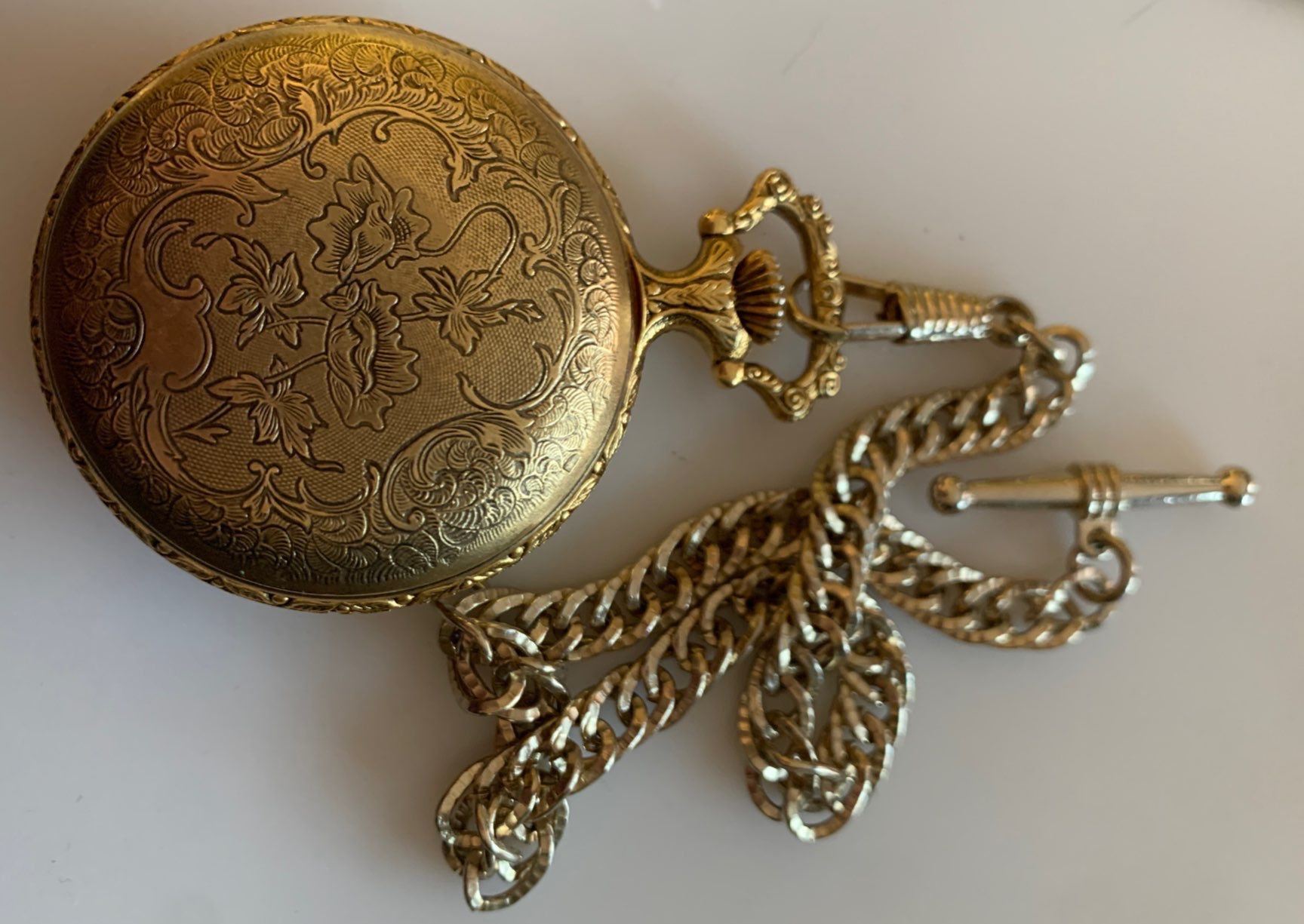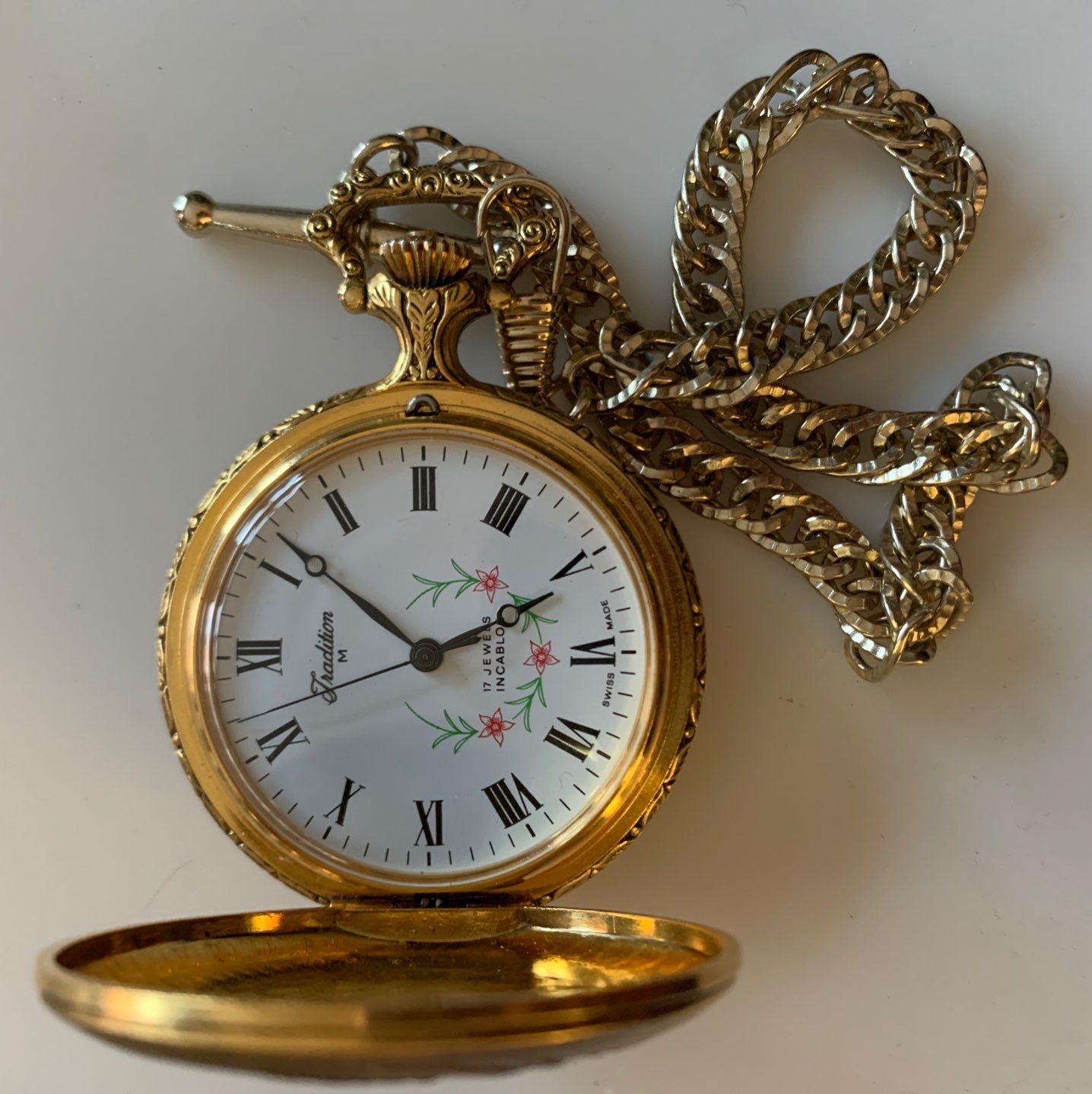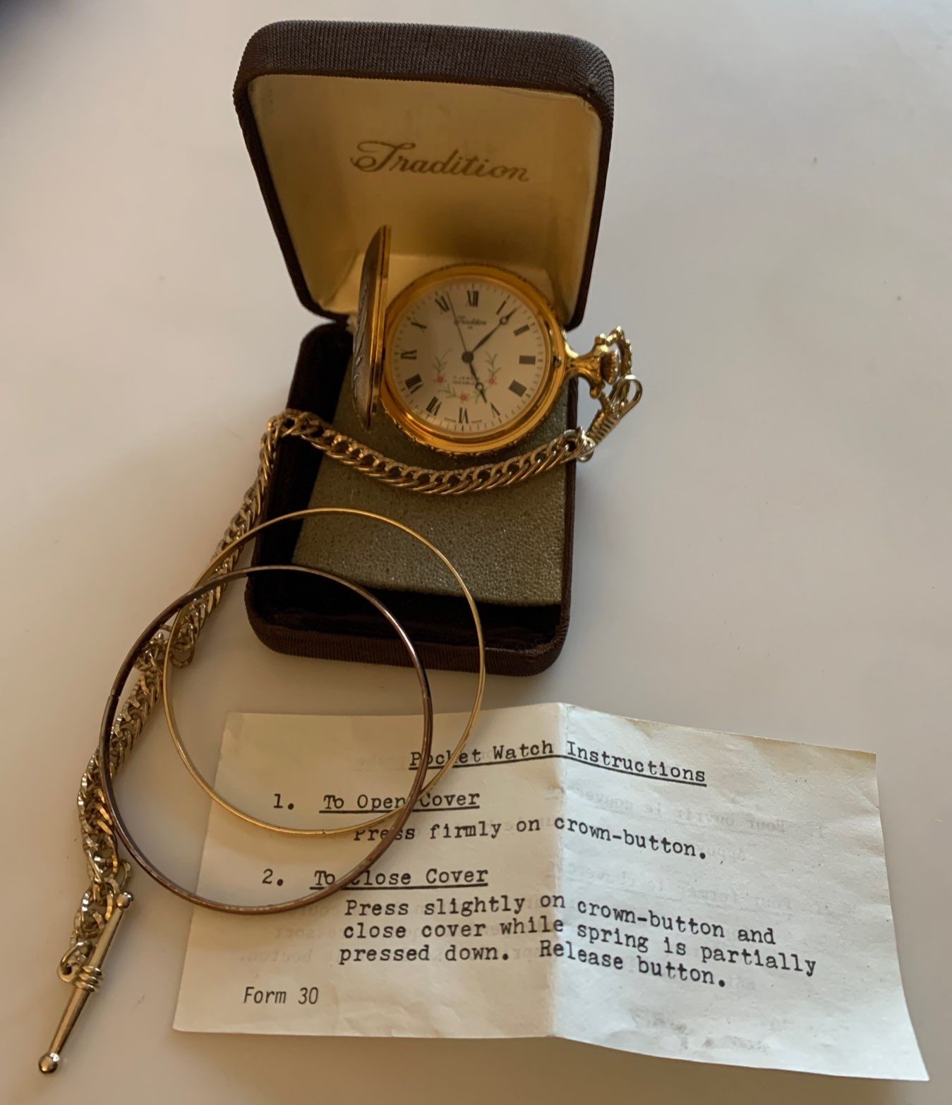 Vintage Tradition 17 Jeweled Incabloc Metal Pocket Watch in Case w/ Gold + Dark Colored Bangles