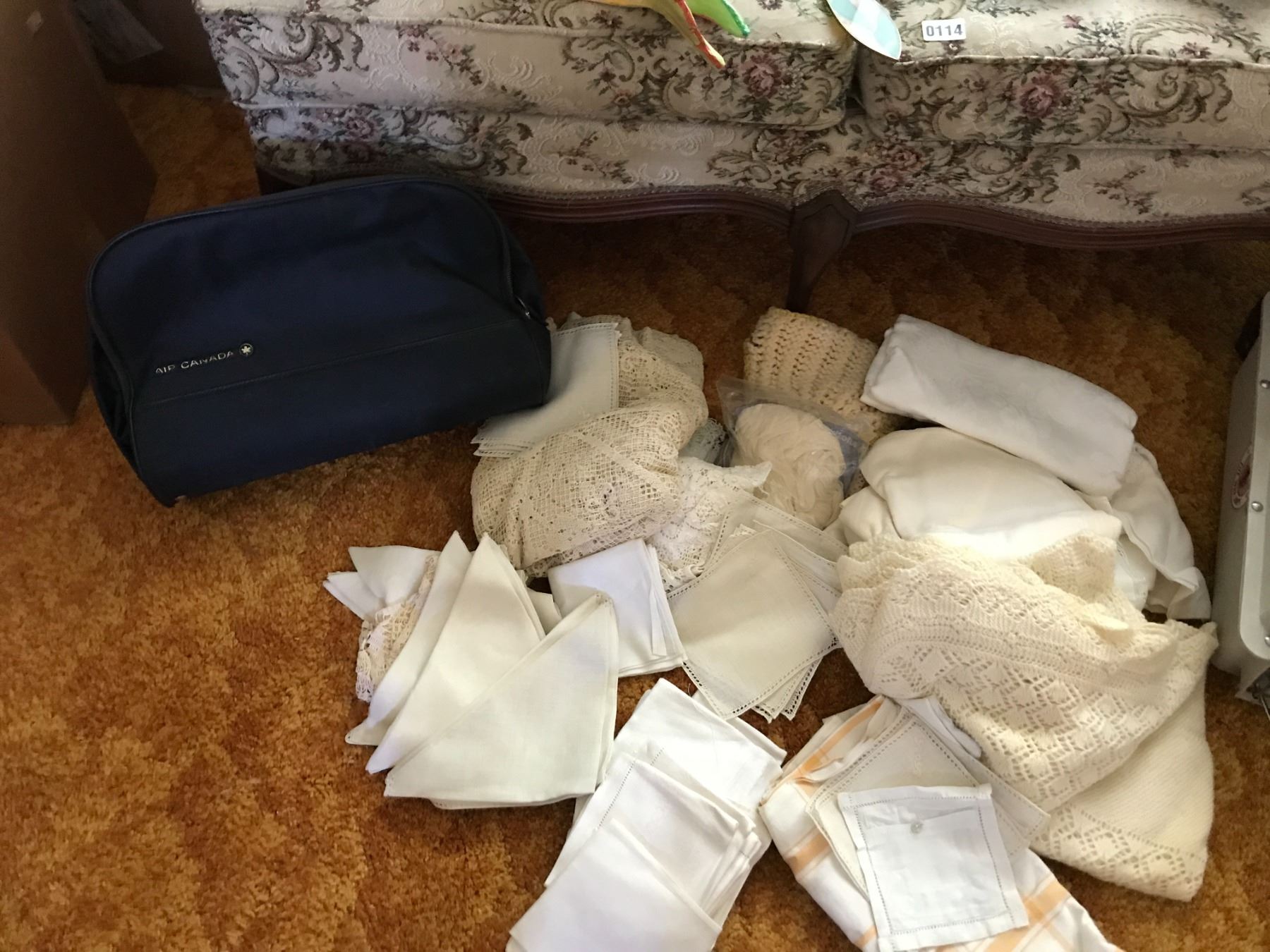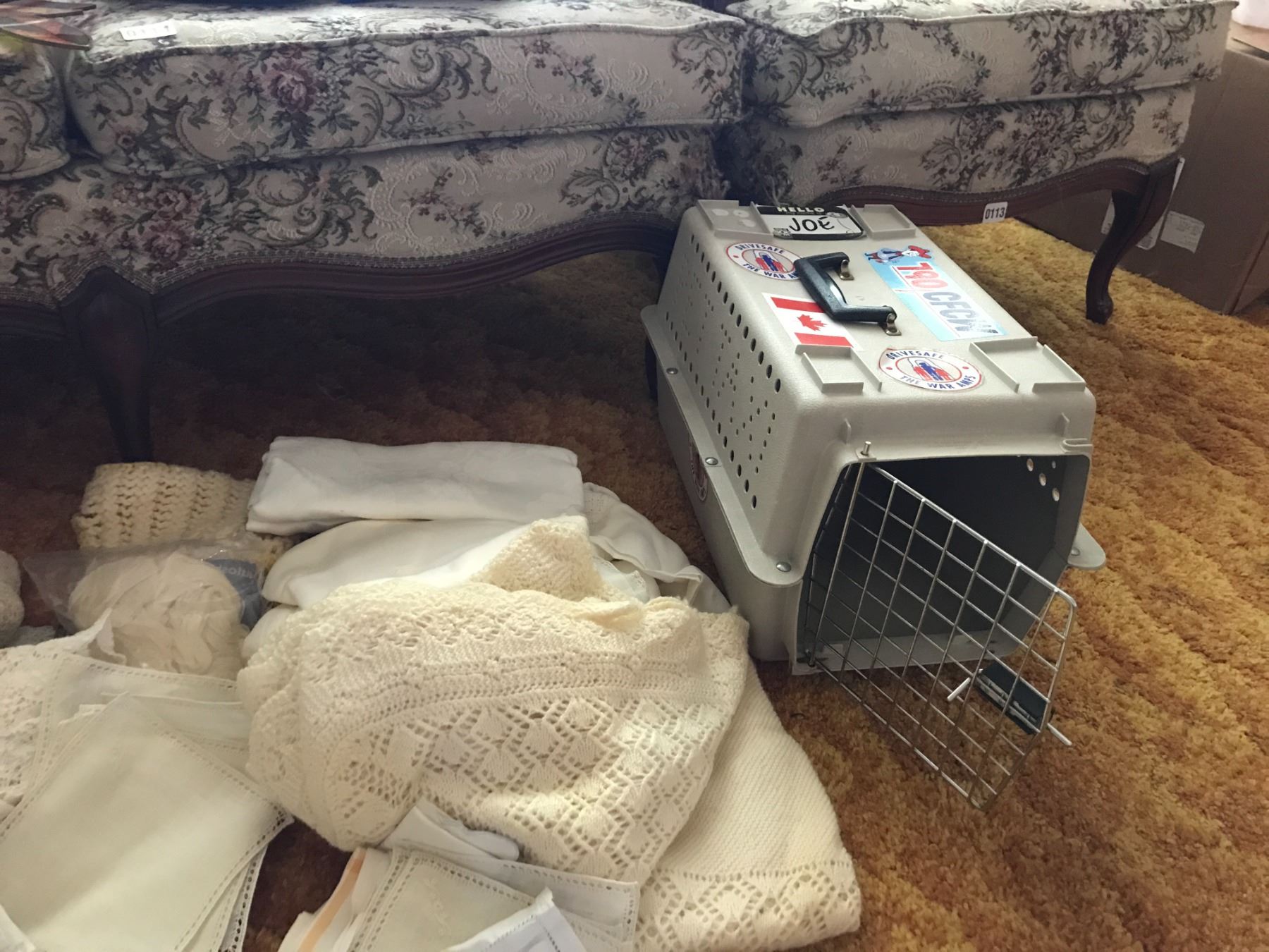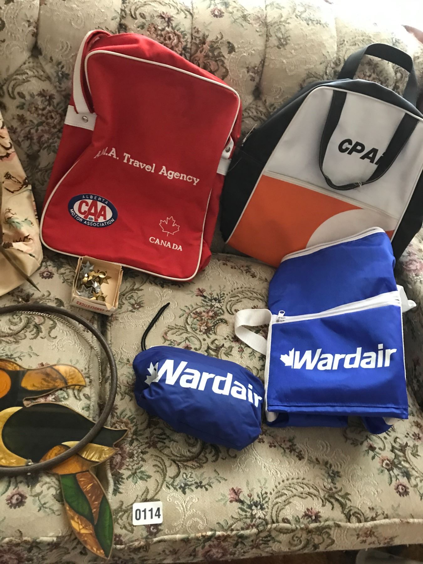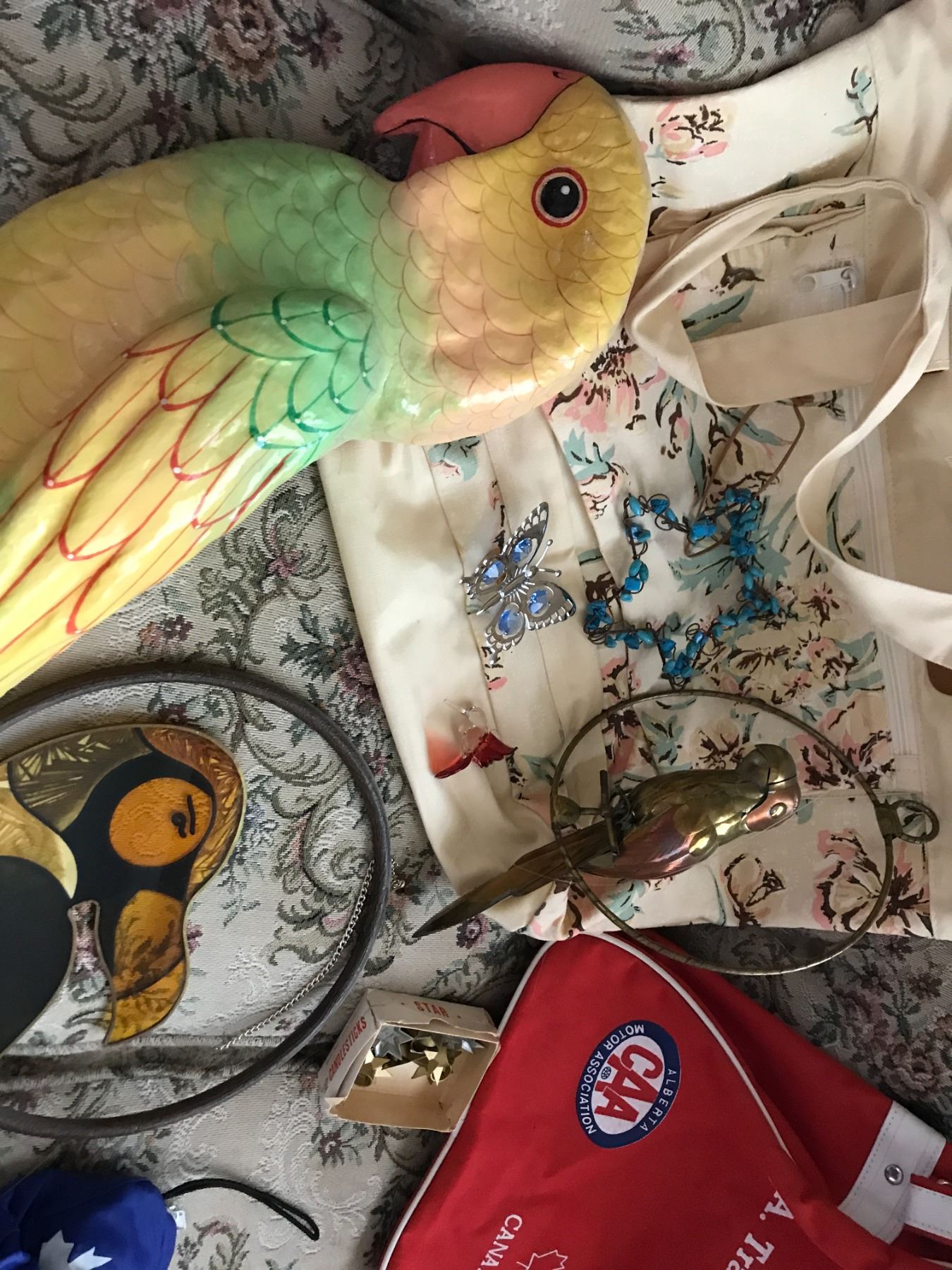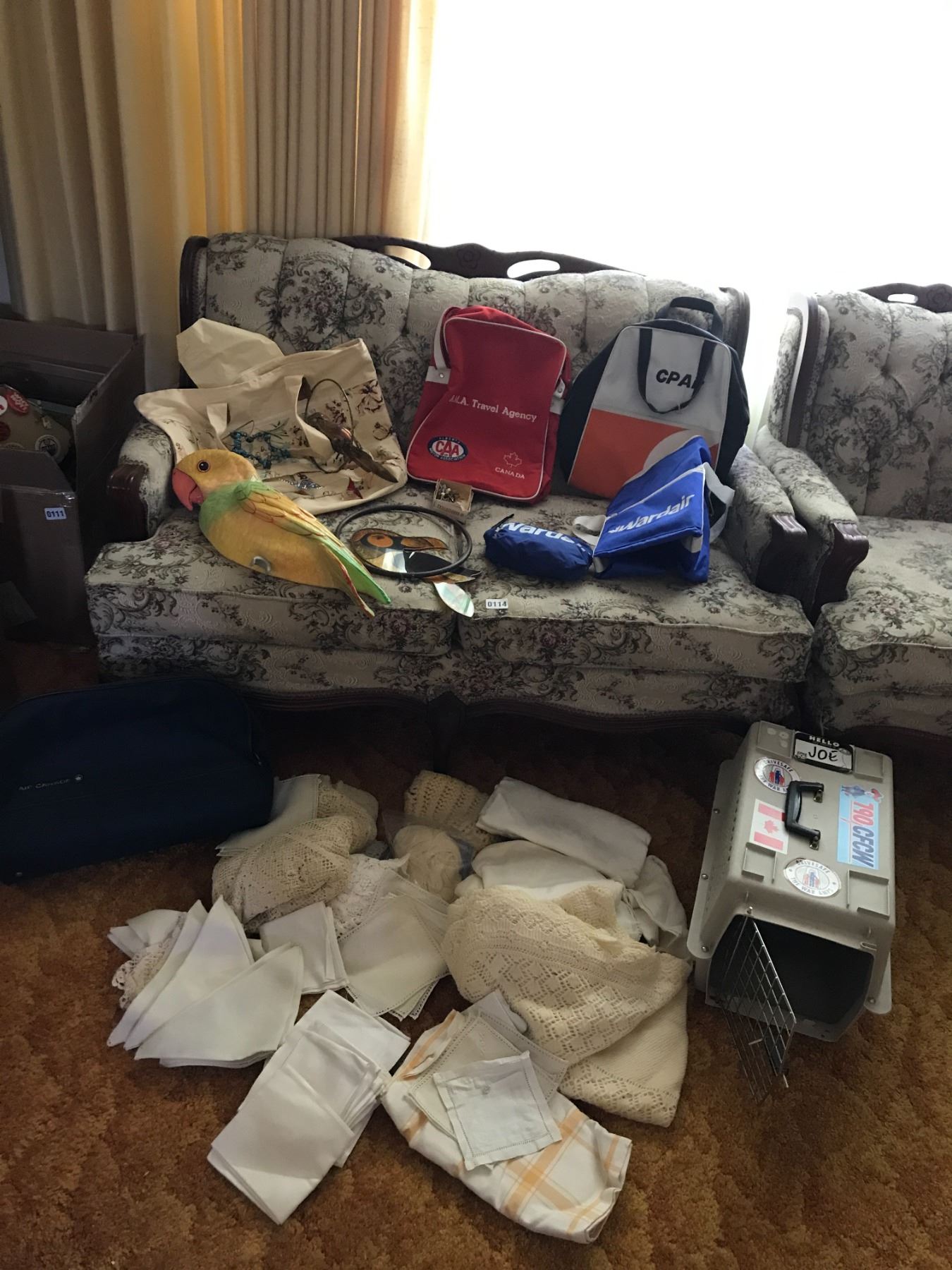 Vintage Travel Bags, Assorted Linen, Small Pet Carrier & Parrot Decoration