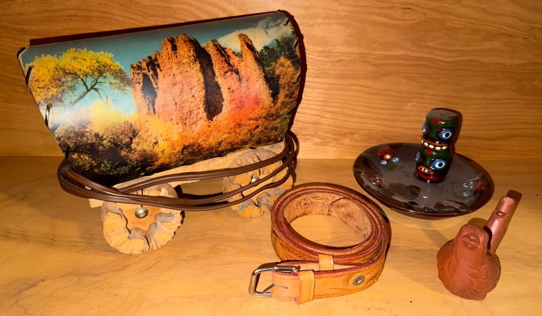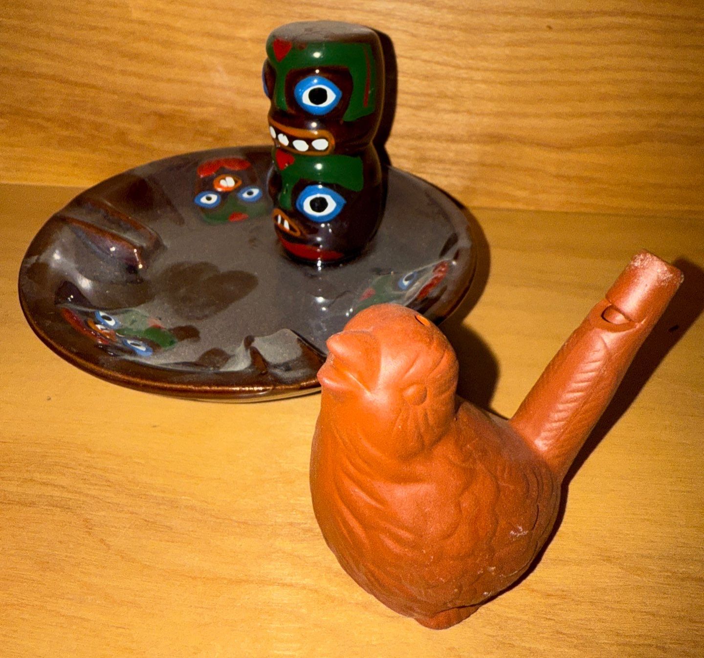 Vintage Wagon Lamp Terracotta Bird Calling Whistle Aztek Trinket Dish & leather Belt