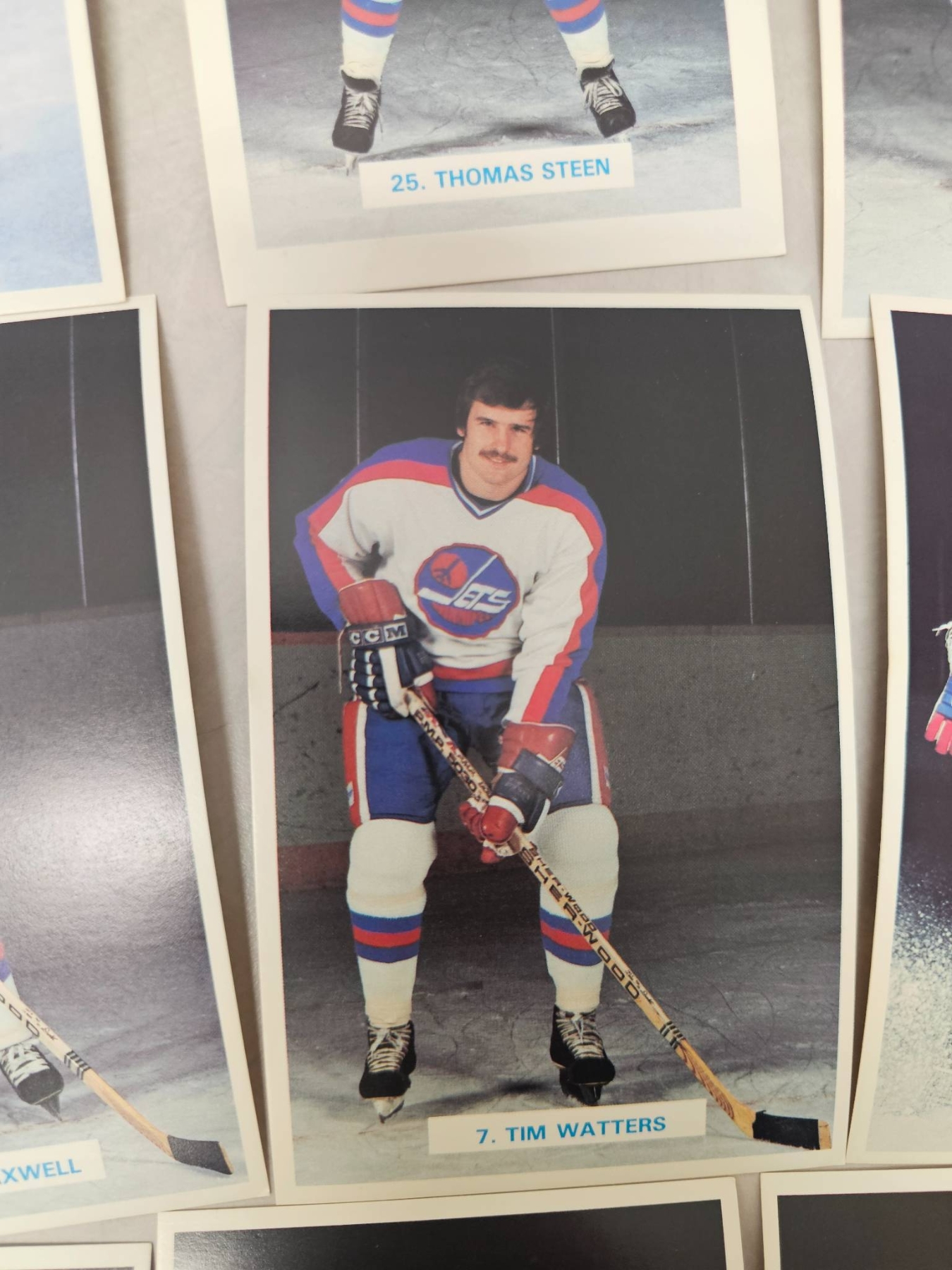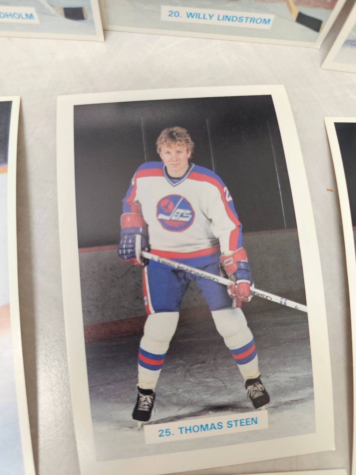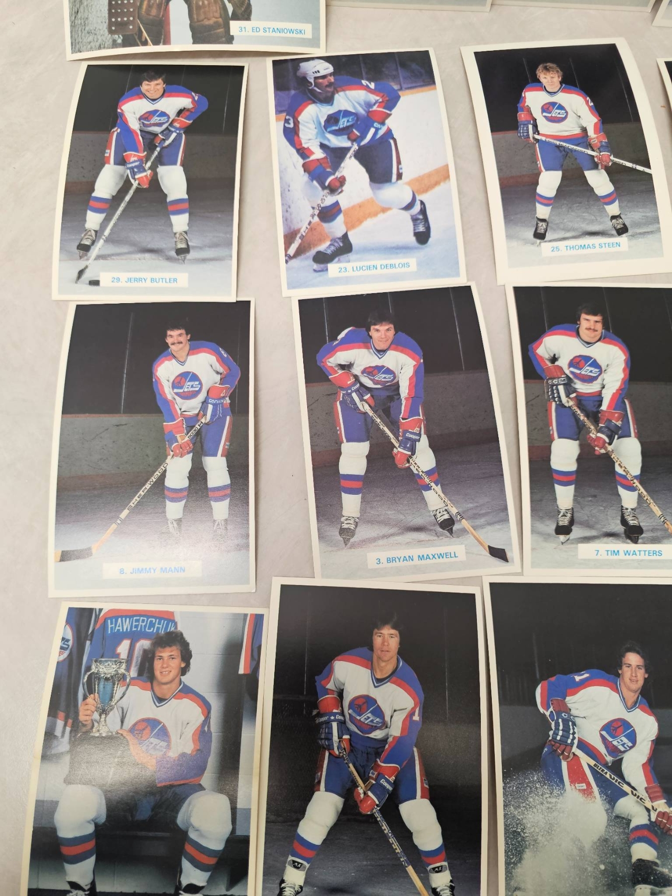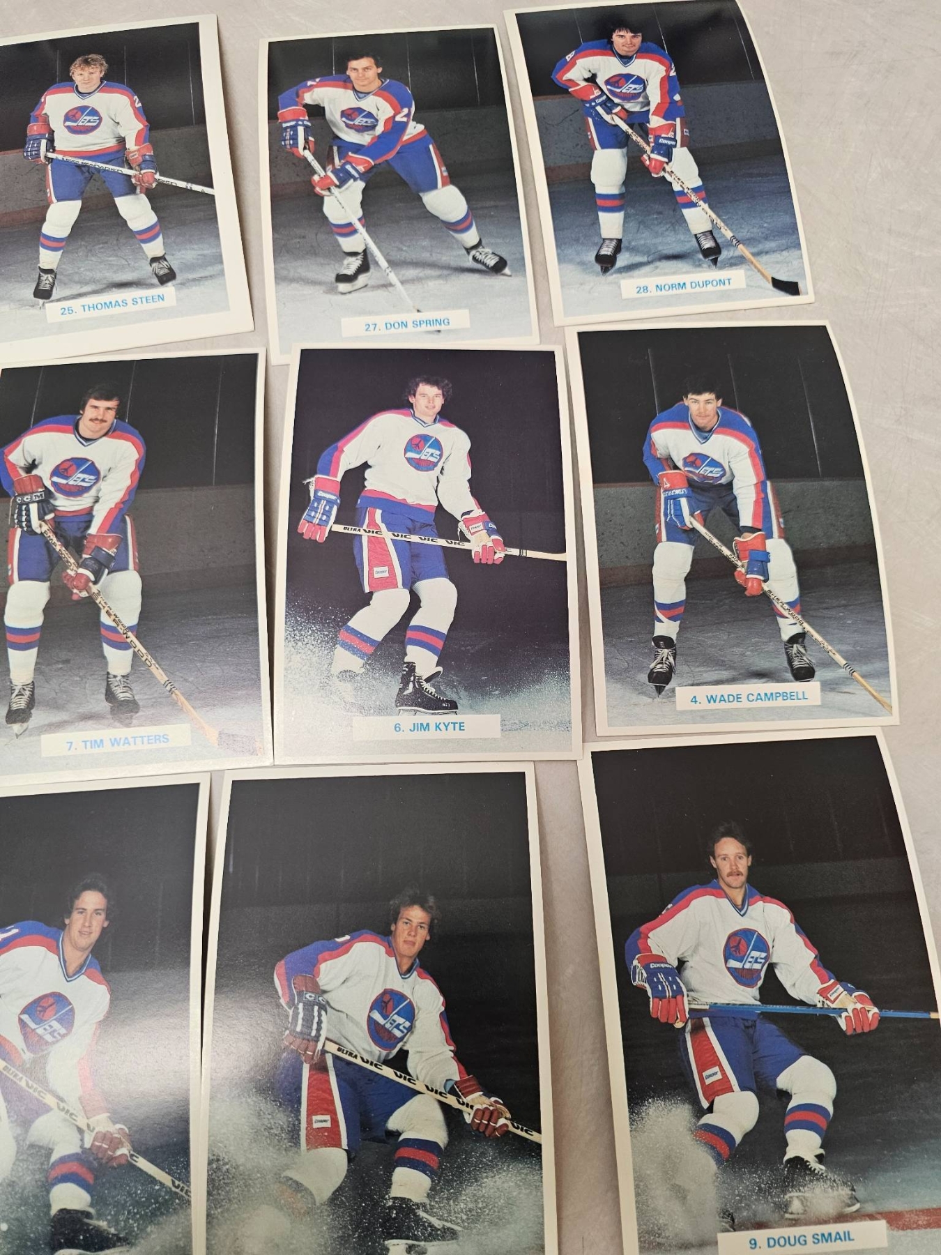 Winnipeg Jets hockey player trading cards, featuring detailed player images and names. Includes goalie and skater cards, with individual player names such as Ed Stanowski, Thomas Steen, and Tim Watters. A great addition for any hockey enthusiast or trading card collector. Cards are displayed in good condition, enhancing their collectible appeal.