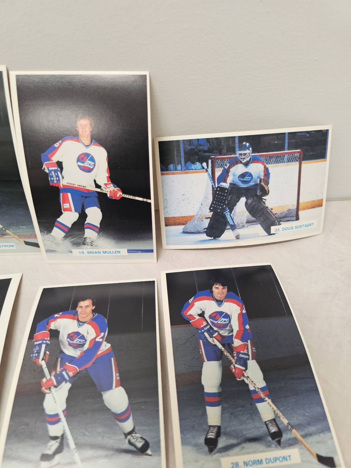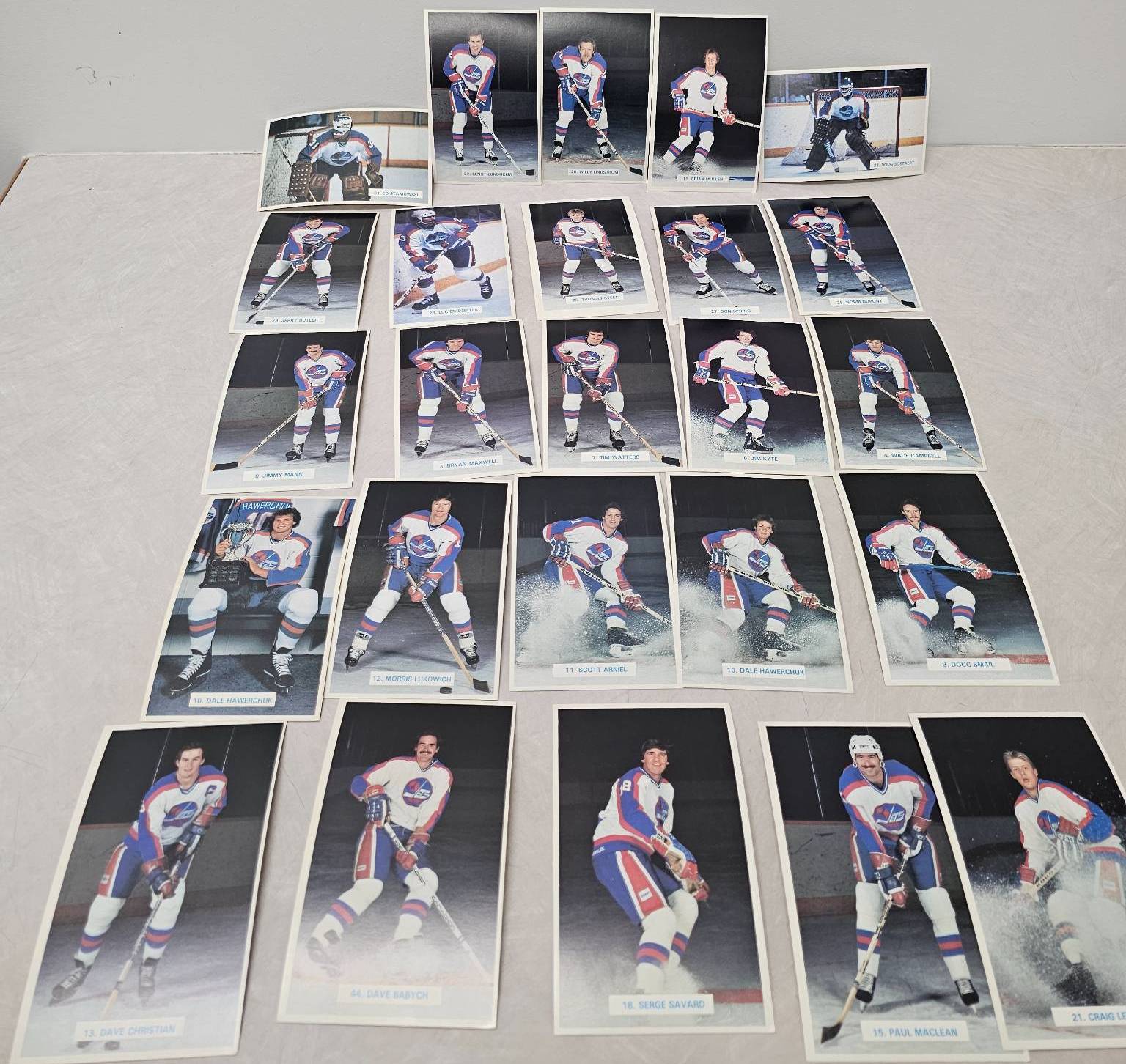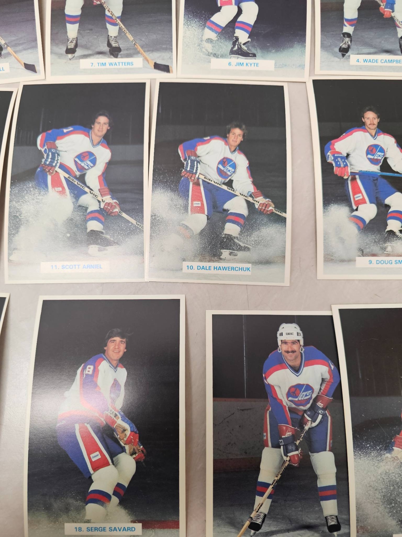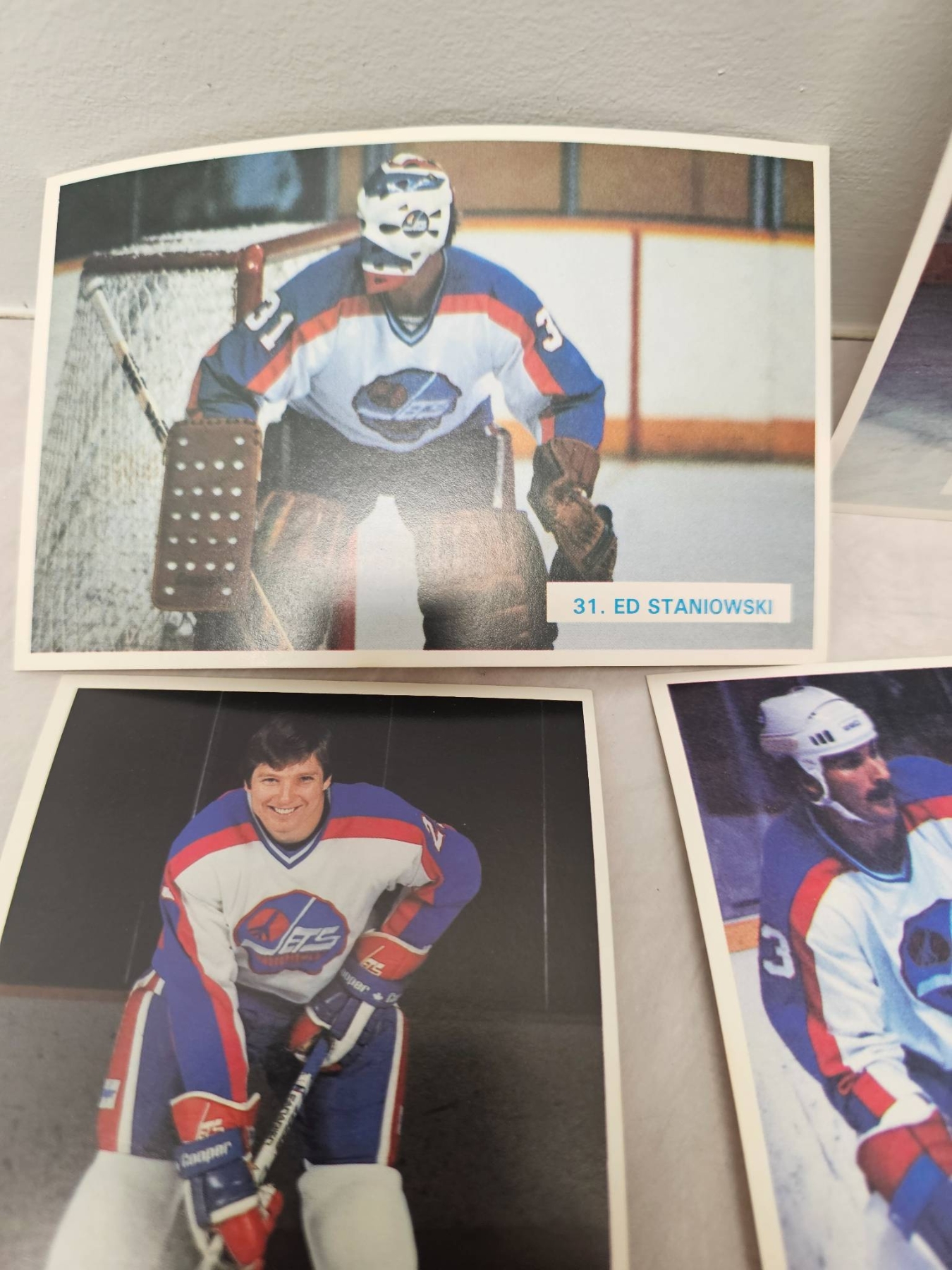 Winnipeg Jets hockey player trading cards, featuring detailed player images and names. Includes goalie and skater cards, with individual player names such as Ed Stanowski, Thomas Steen, and Tim Watters. A great addition for any hockey enthusiast or trading card collector. Cards are displayed in good condition, enhancing their collectible appeal.