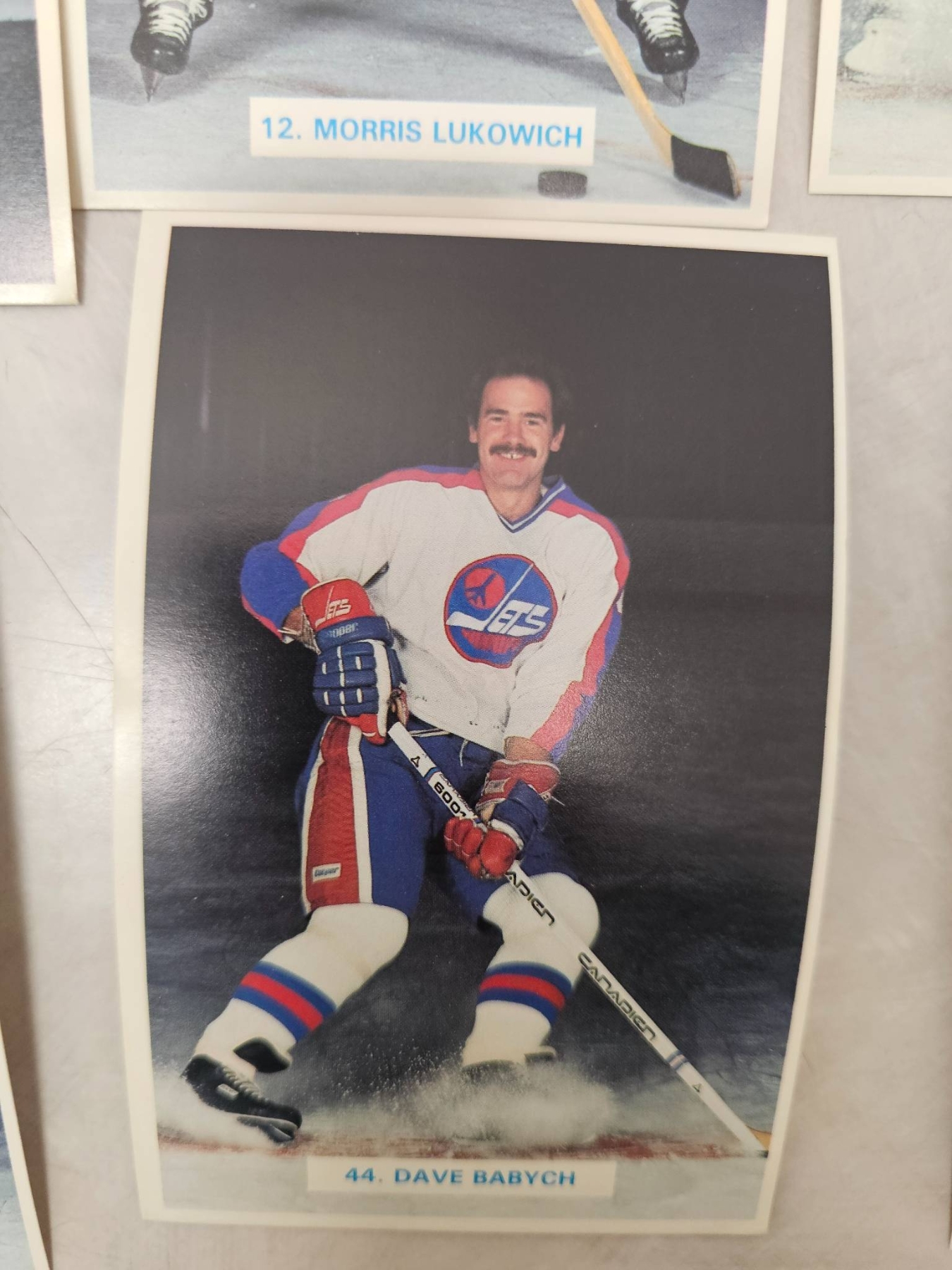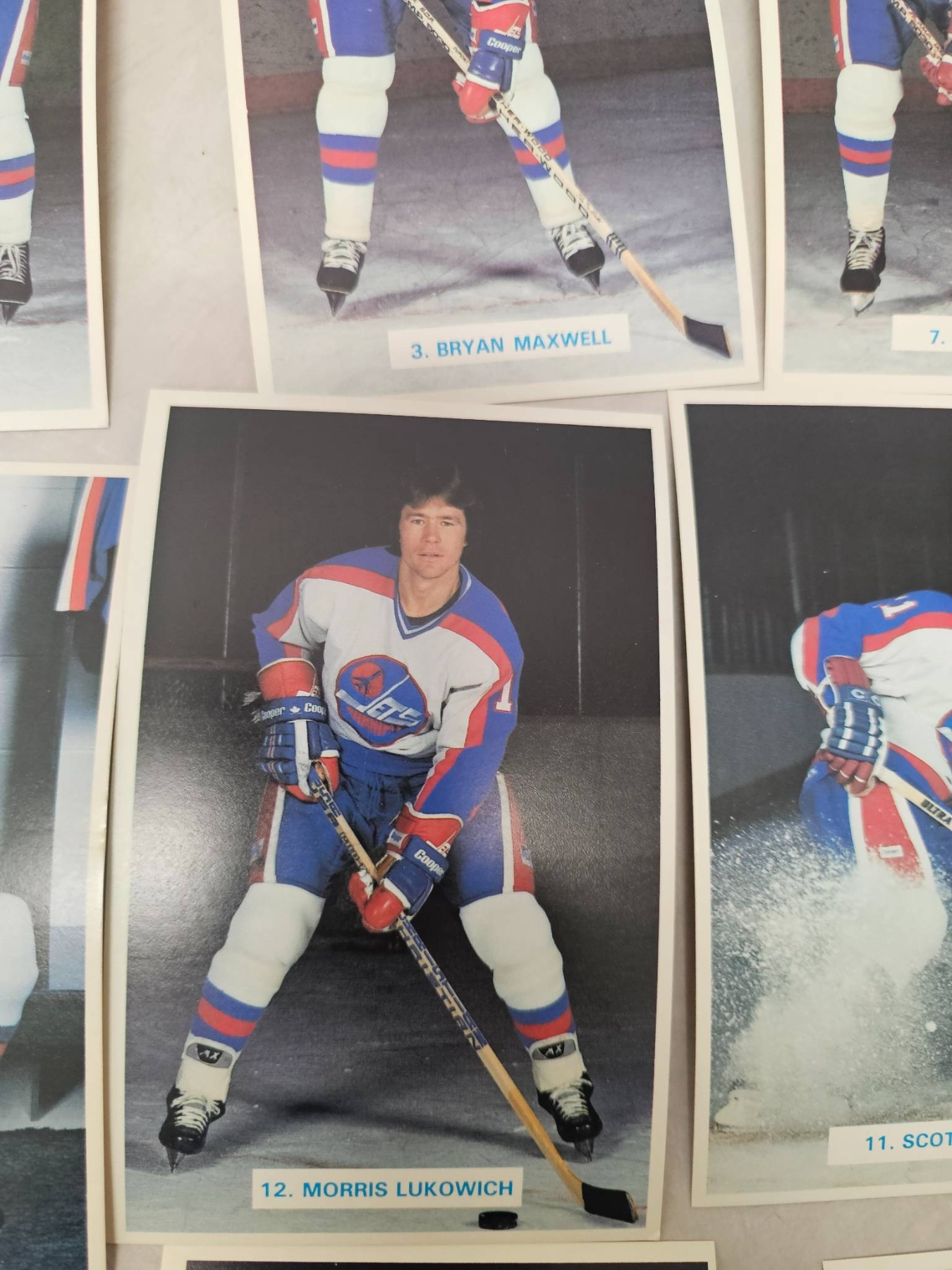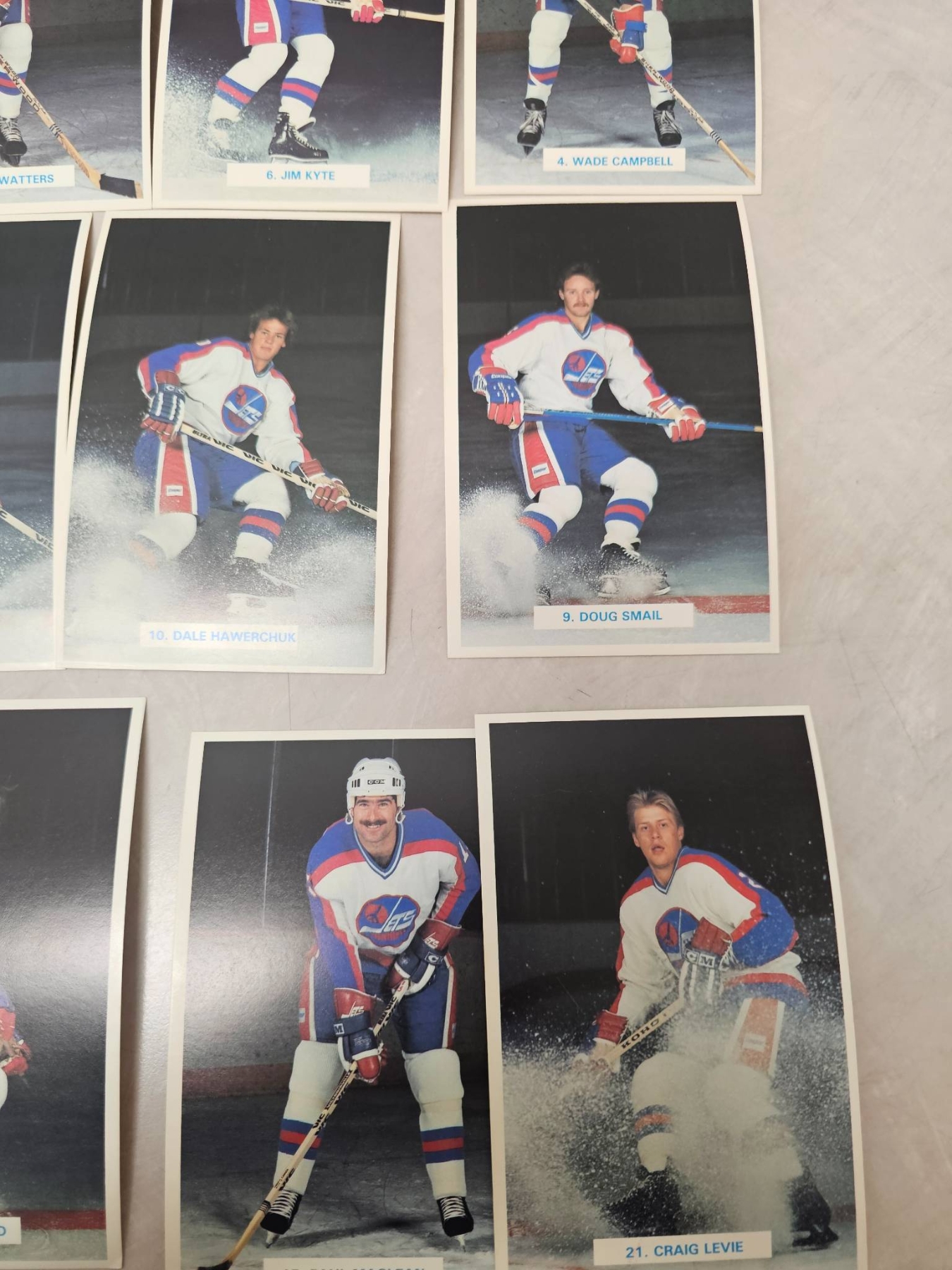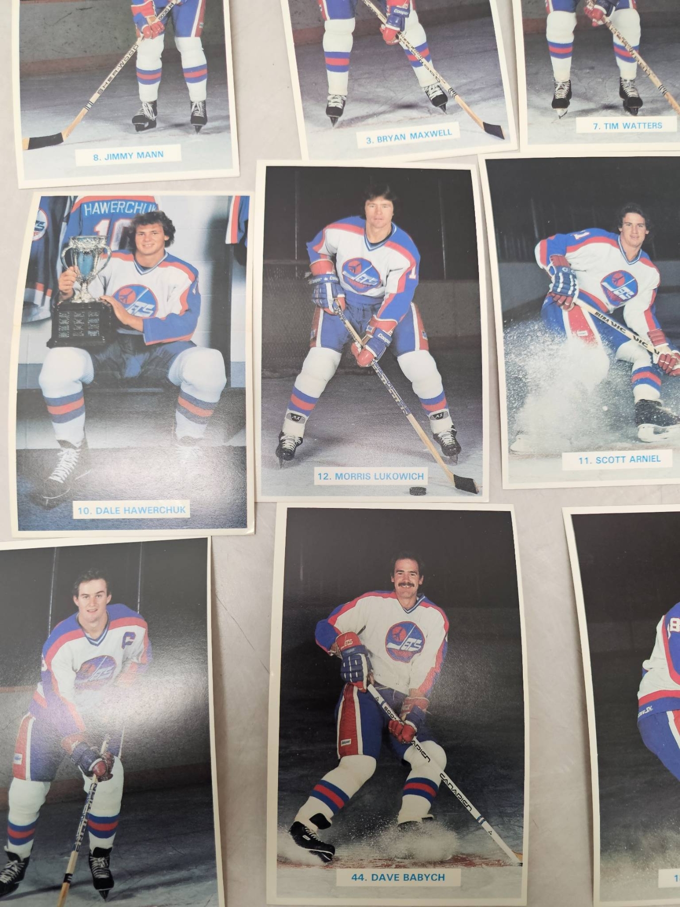 Winnipeg Jets hockey player trading cards, featuring detailed player images and names. Includes goalie and skater cards, with individual player names such as Ed Stanowski, Thomas Steen, and Tim Watters. A great addition for any hockey enthusiast or trading card collector. Cards are displayed in good condition, enhancing their collectible appeal.