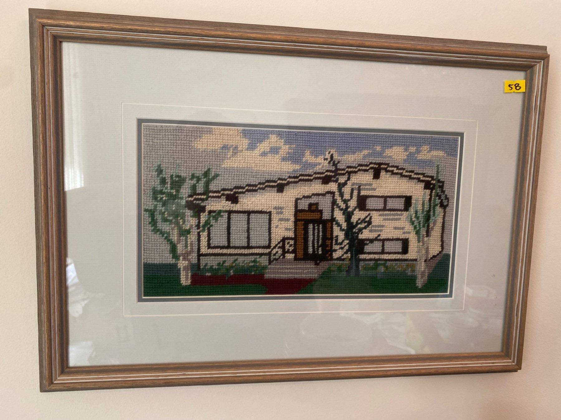 Vintage Wood Ashtray 2 Feet Tall and Framed Wall Hanging Needle Point 20W x 14T