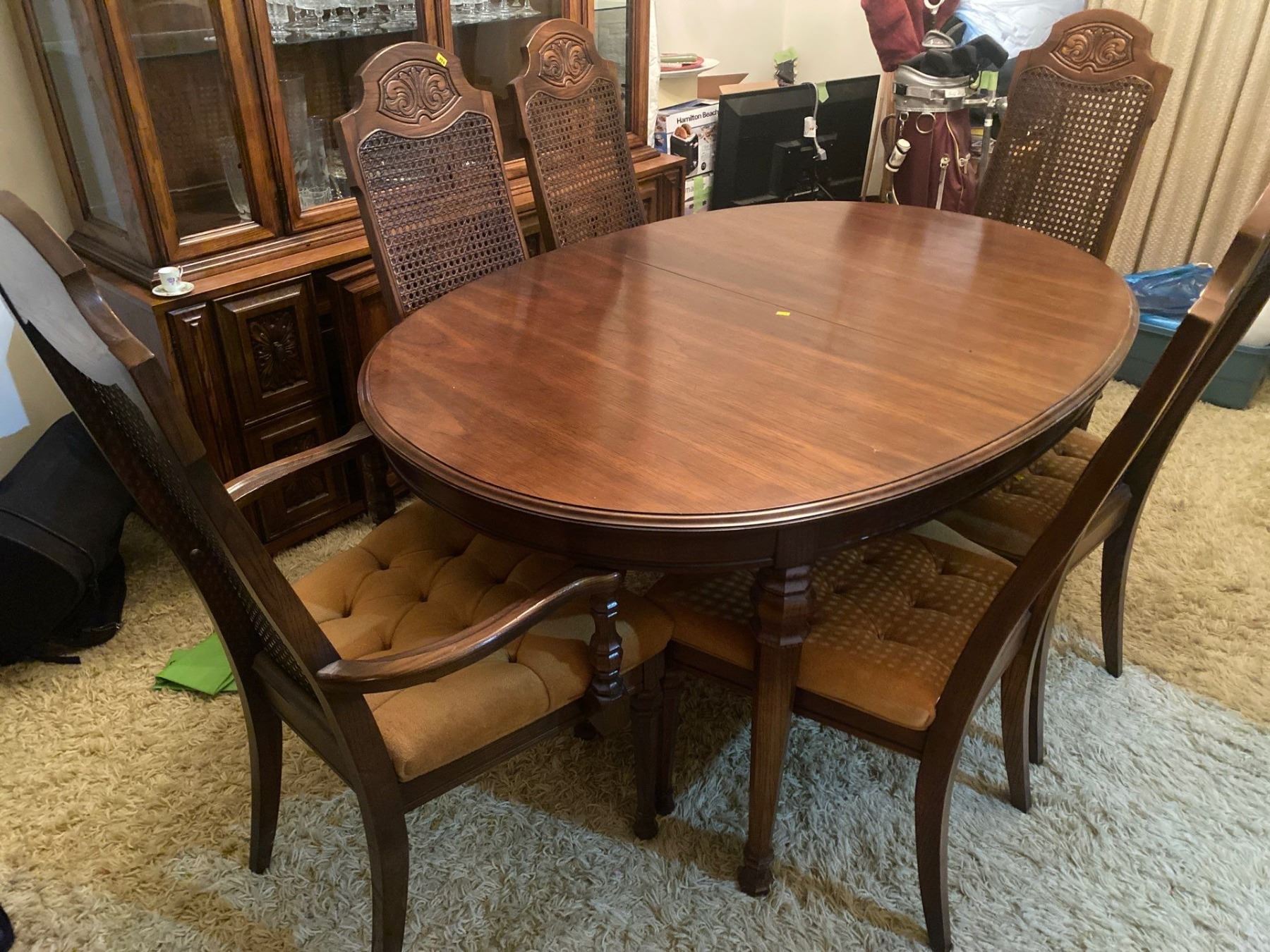Vintage Wood Dining Table w/ 6 Wood & Velvet Dining Chairs