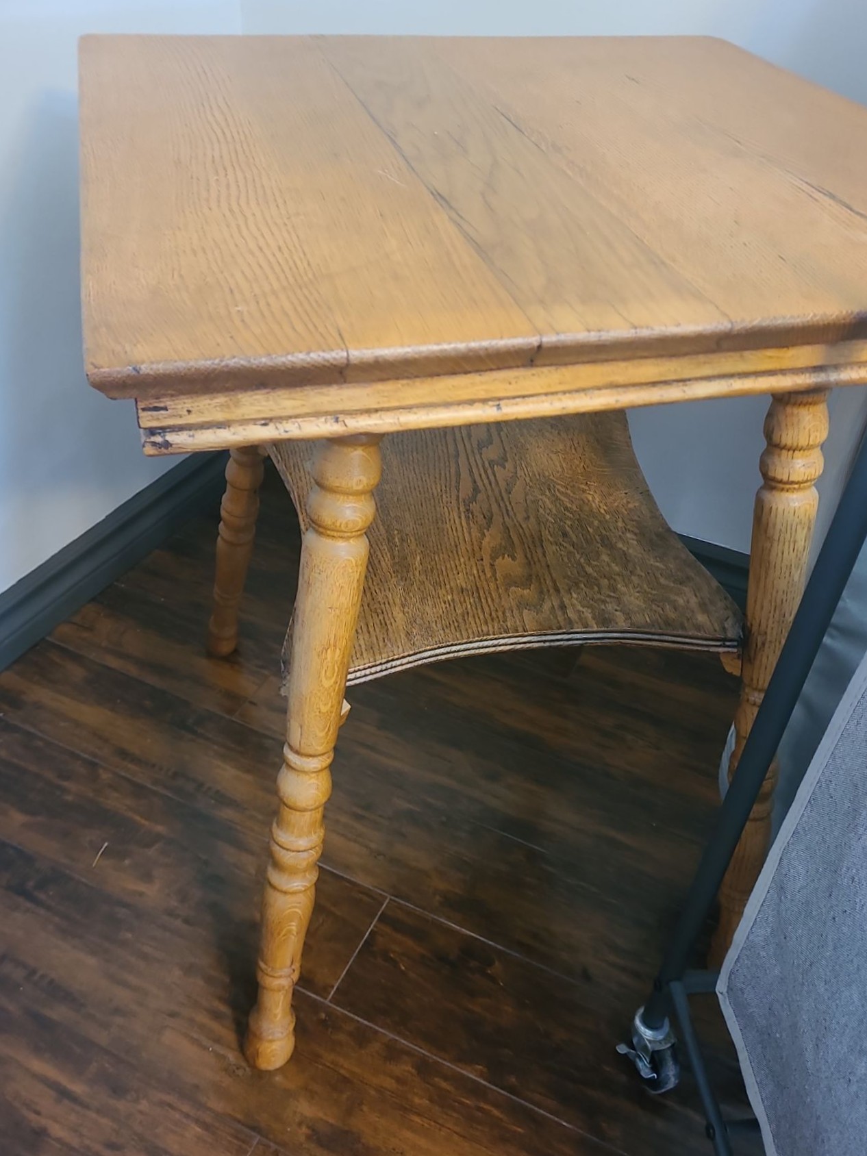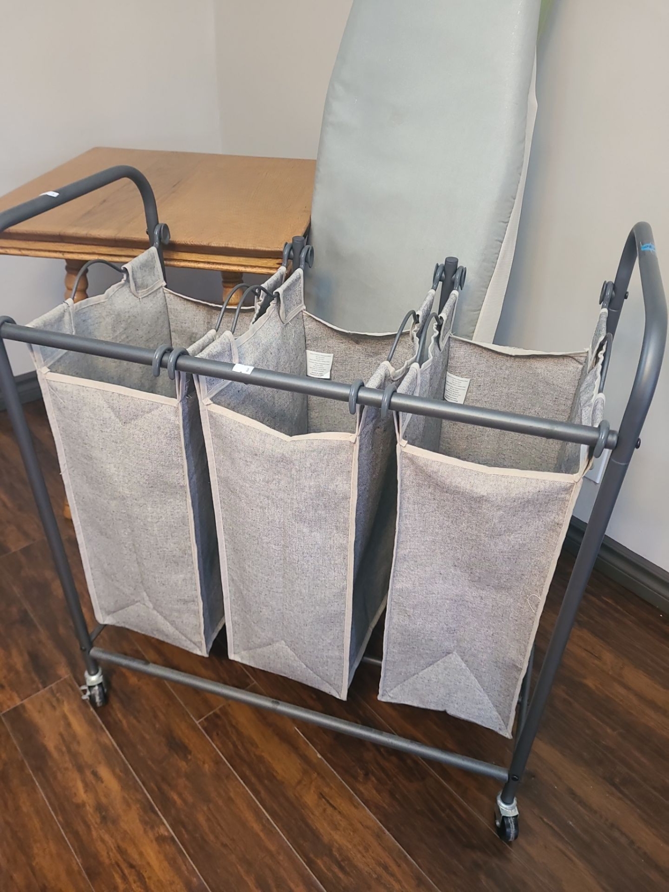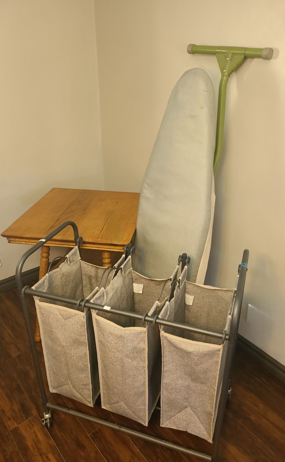 Vintage Wooden Side Table 24 W, 24 D, 28 T, Ironing Board, Laundry Sorting Cart 30 W, 16 D, 34 T