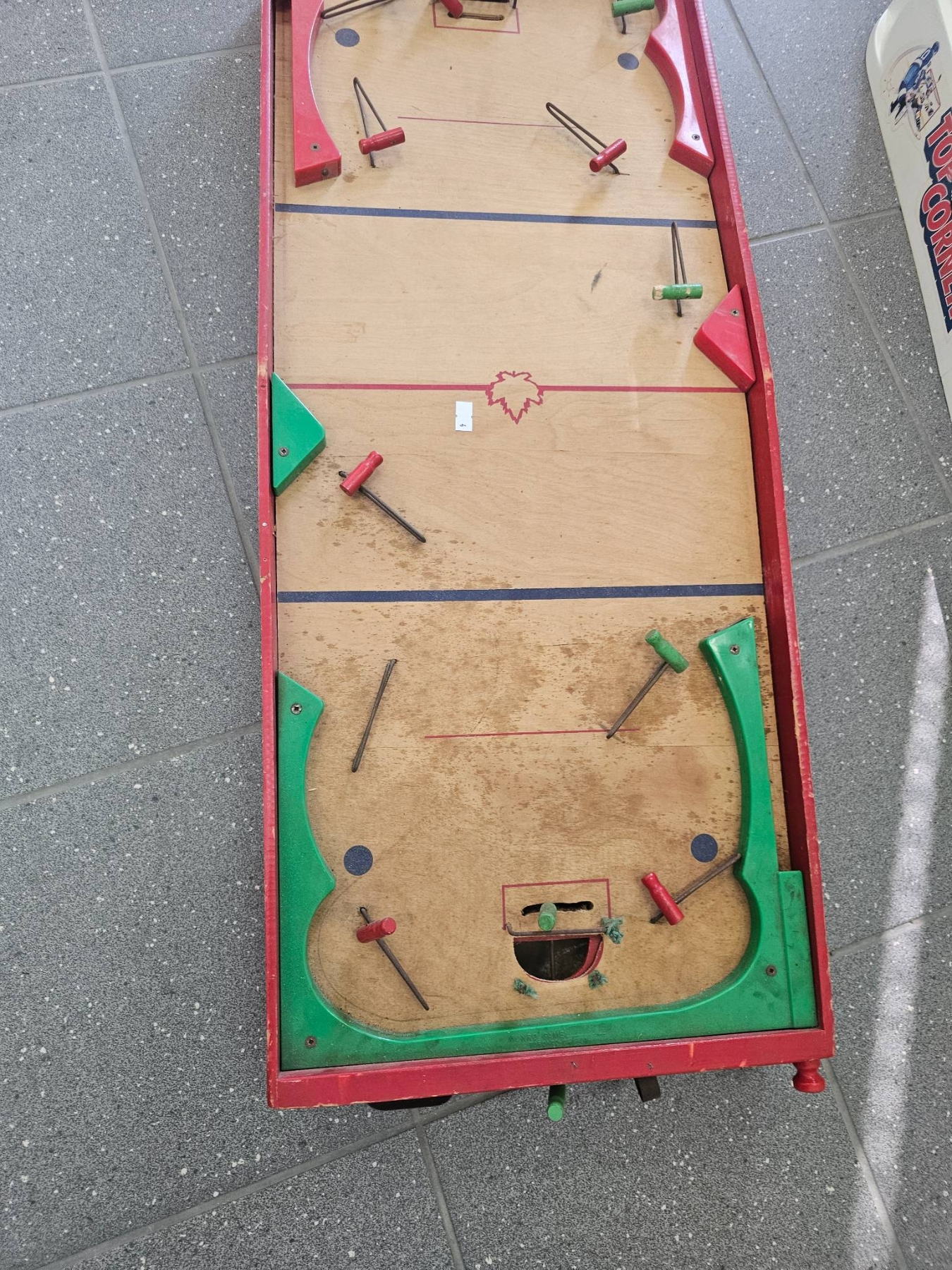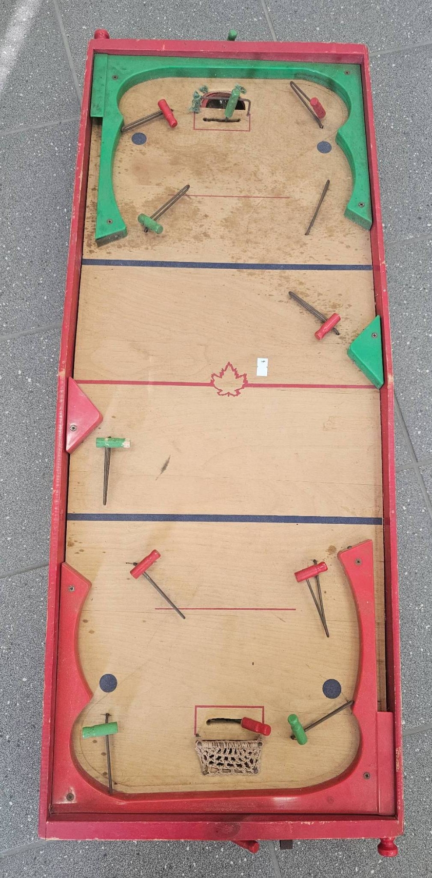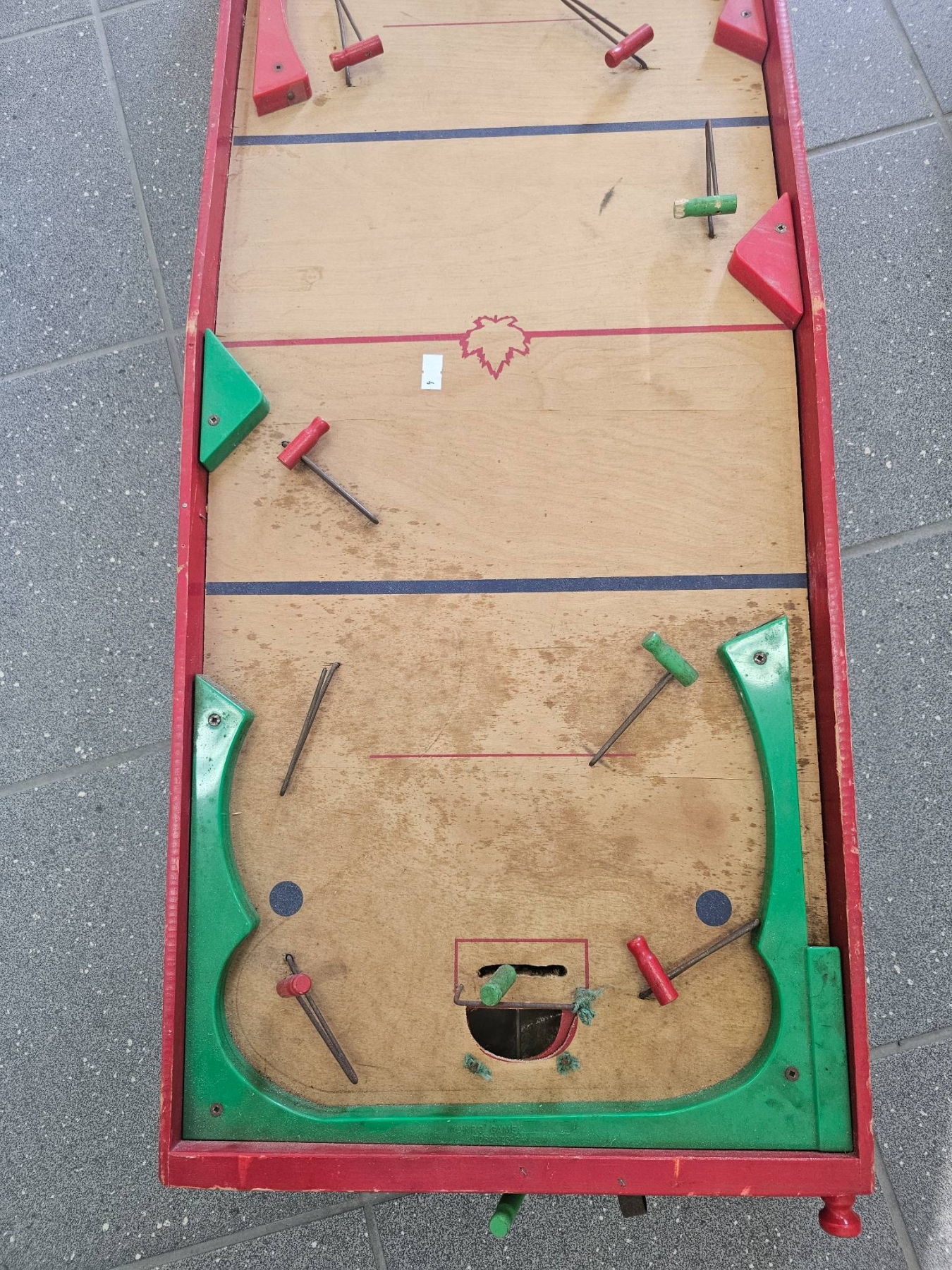 Vintage handcrafted wooden tabletop hockey game featuring a rectangular playing surface divided into two sections. Includes colorful red and green wooden fixtures, player rods, and goals at each end. The board shows visible wear, consistent with age and use. The center bears a maple leaf emblem, indicating Canadian origin. Untested for operational functionality.