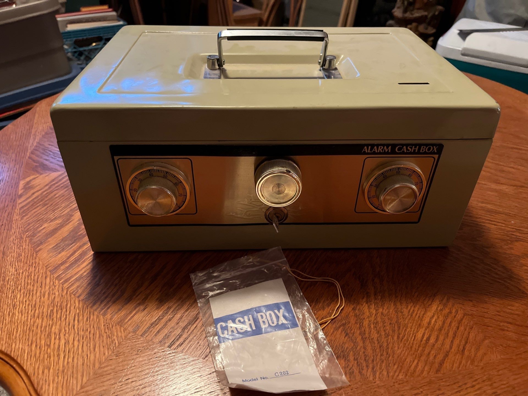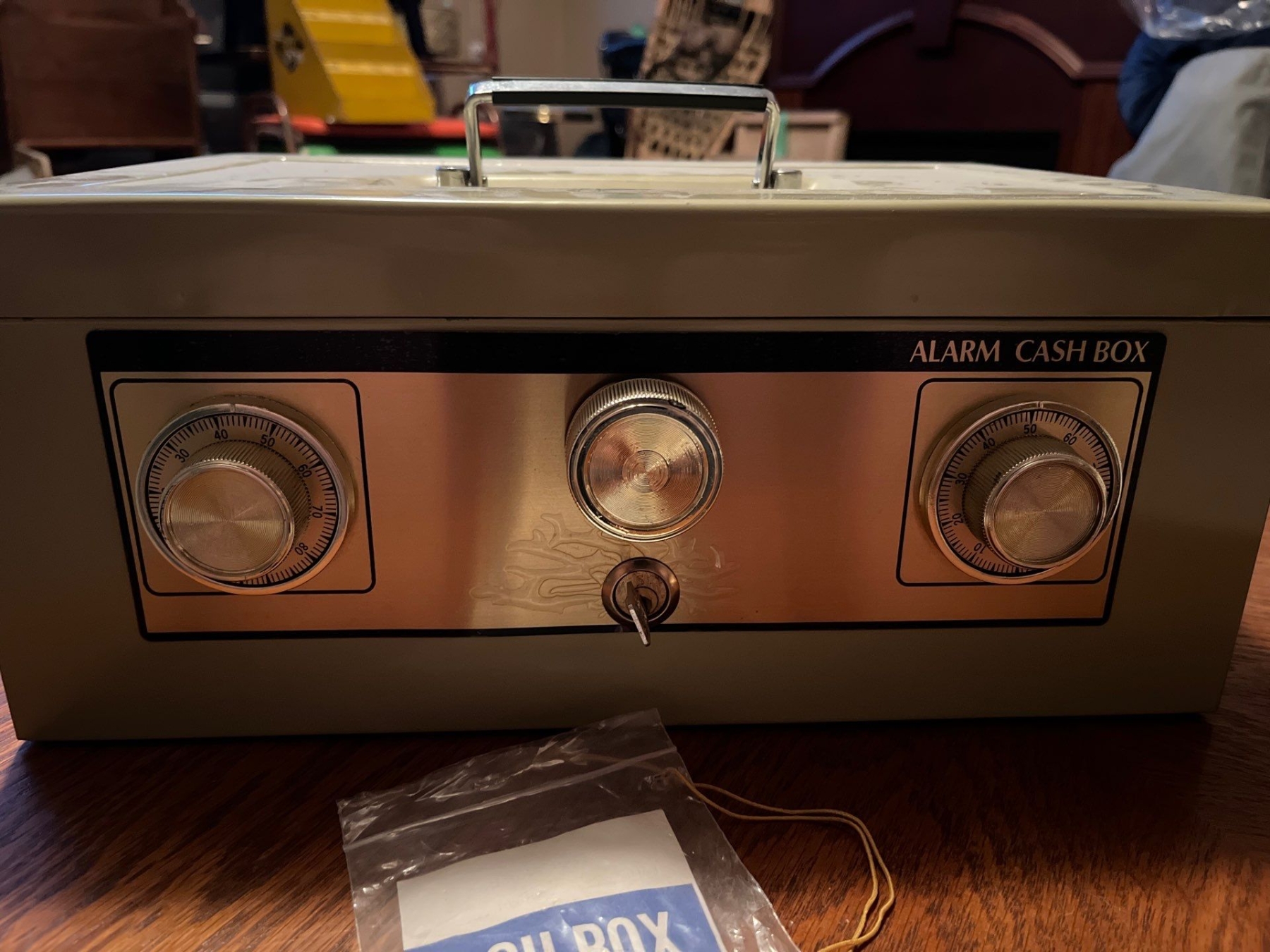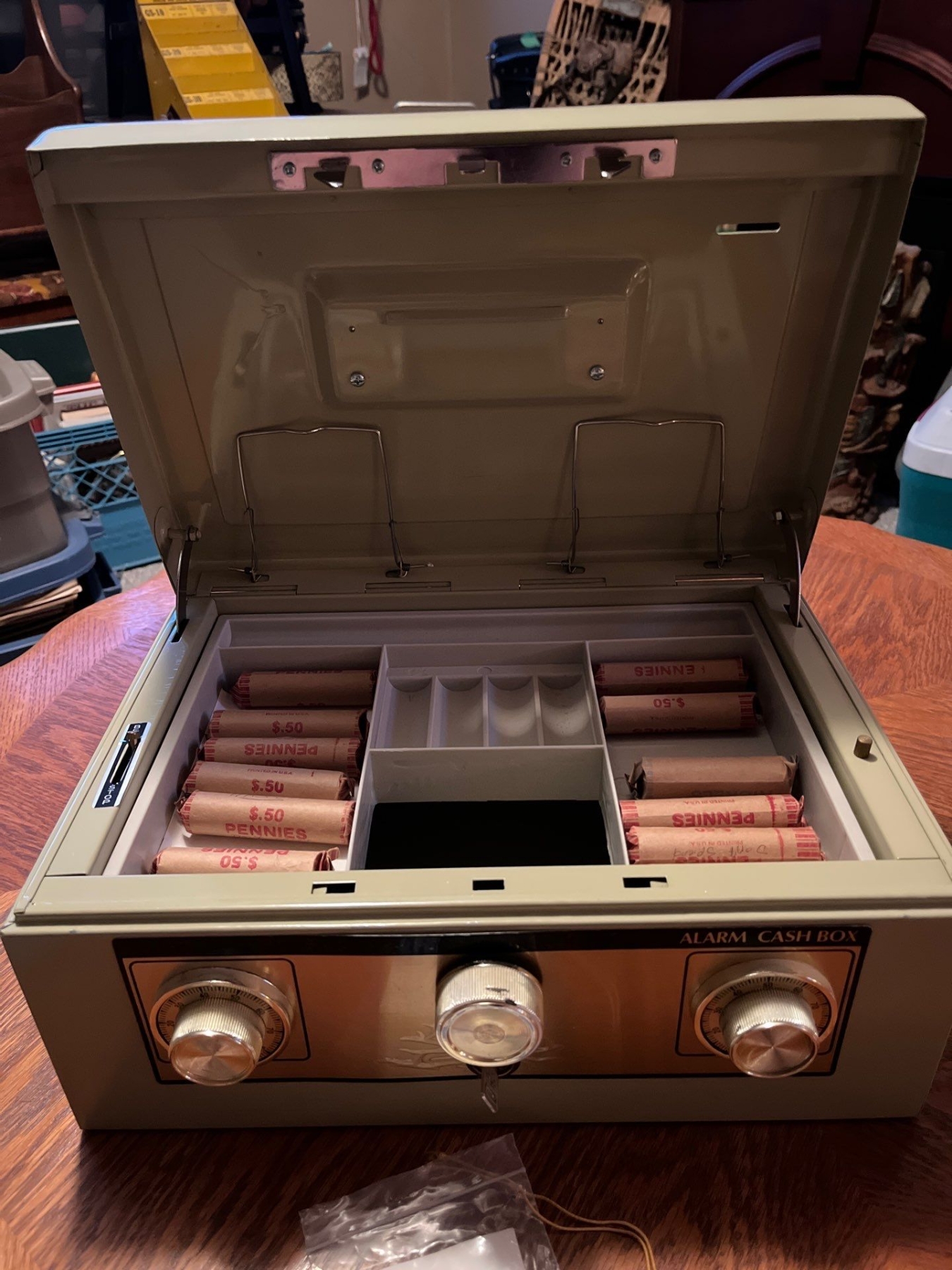 Vintage alarm cash box safe with 10 rolls of un researched pennies