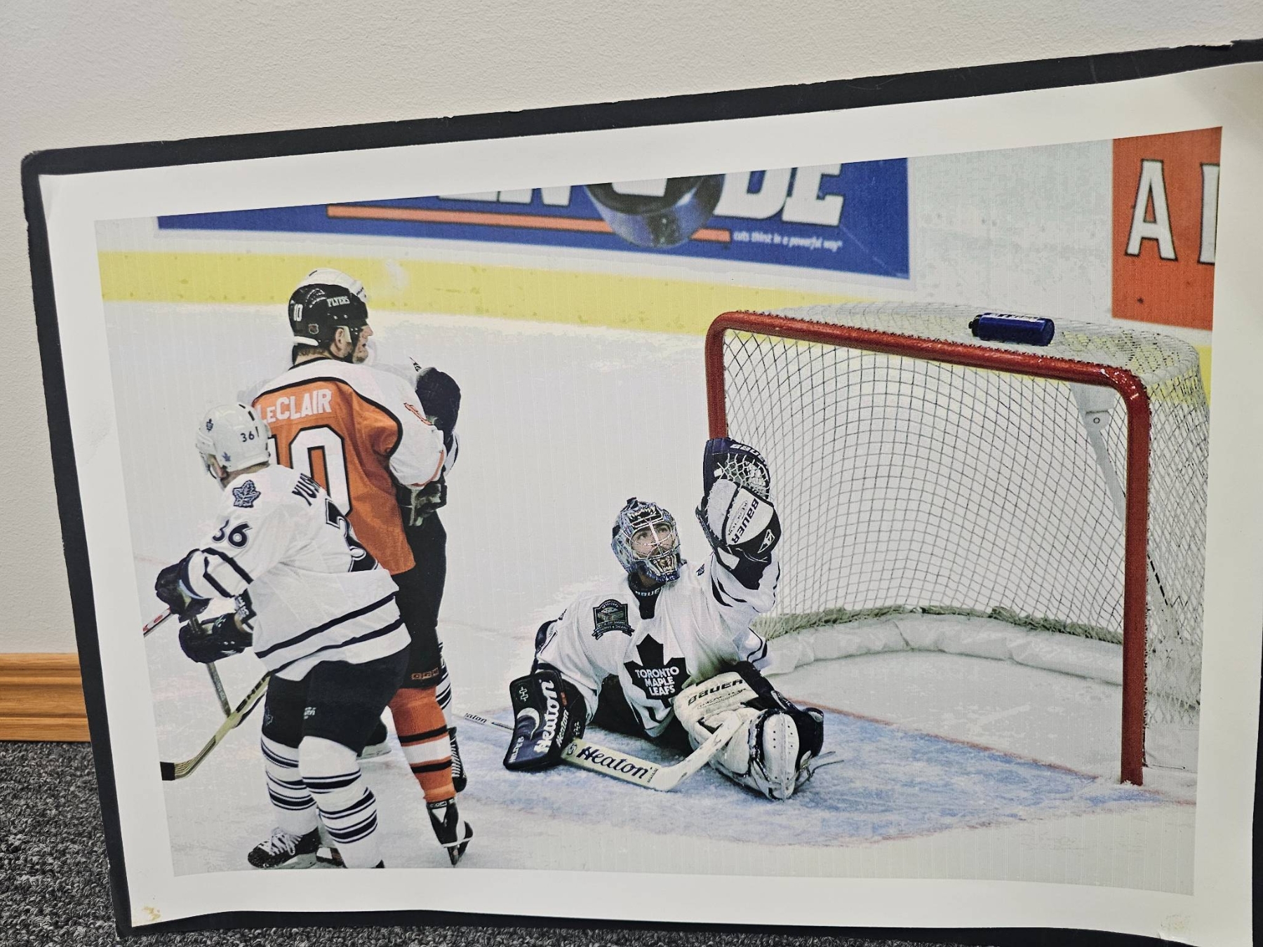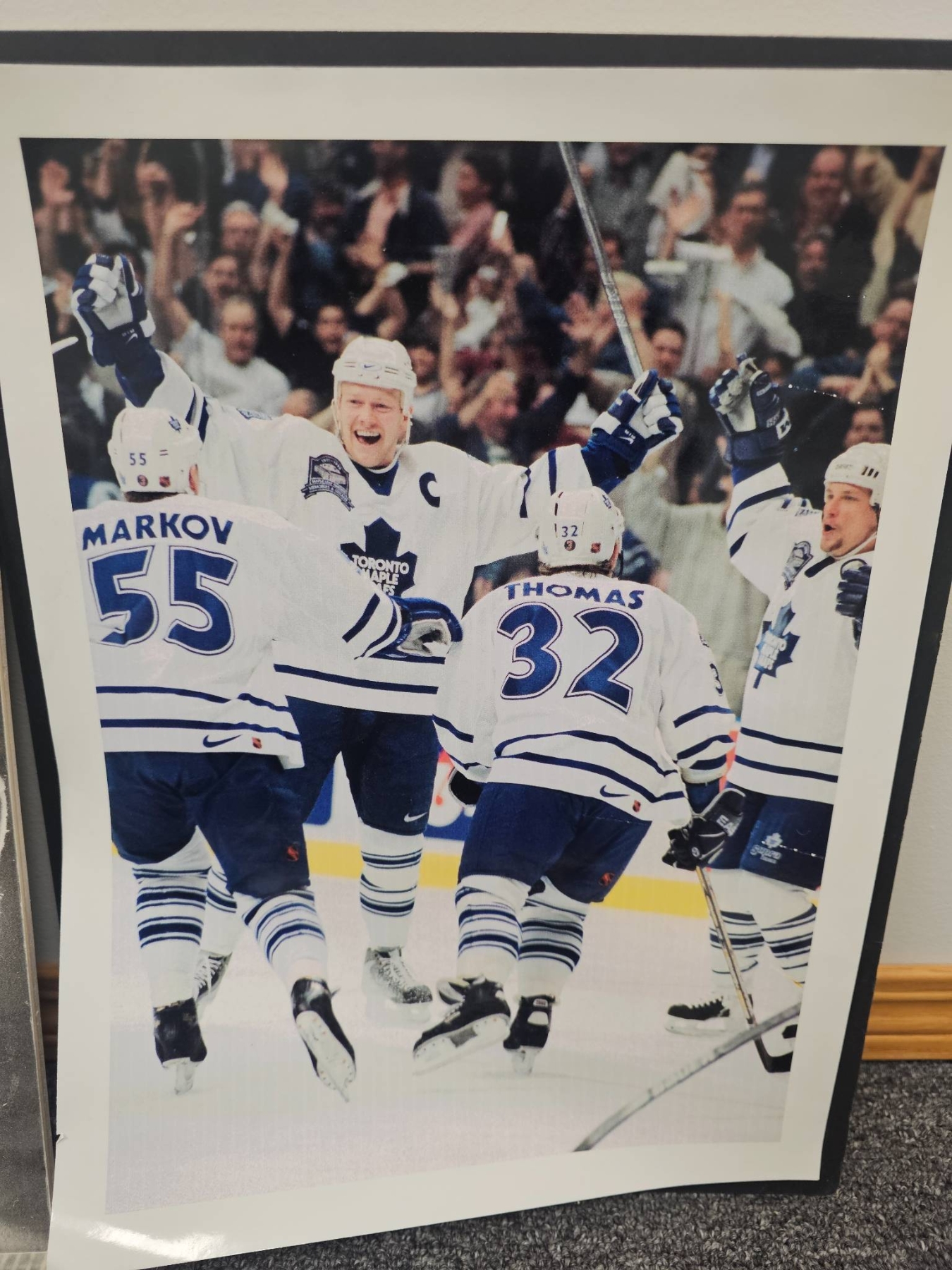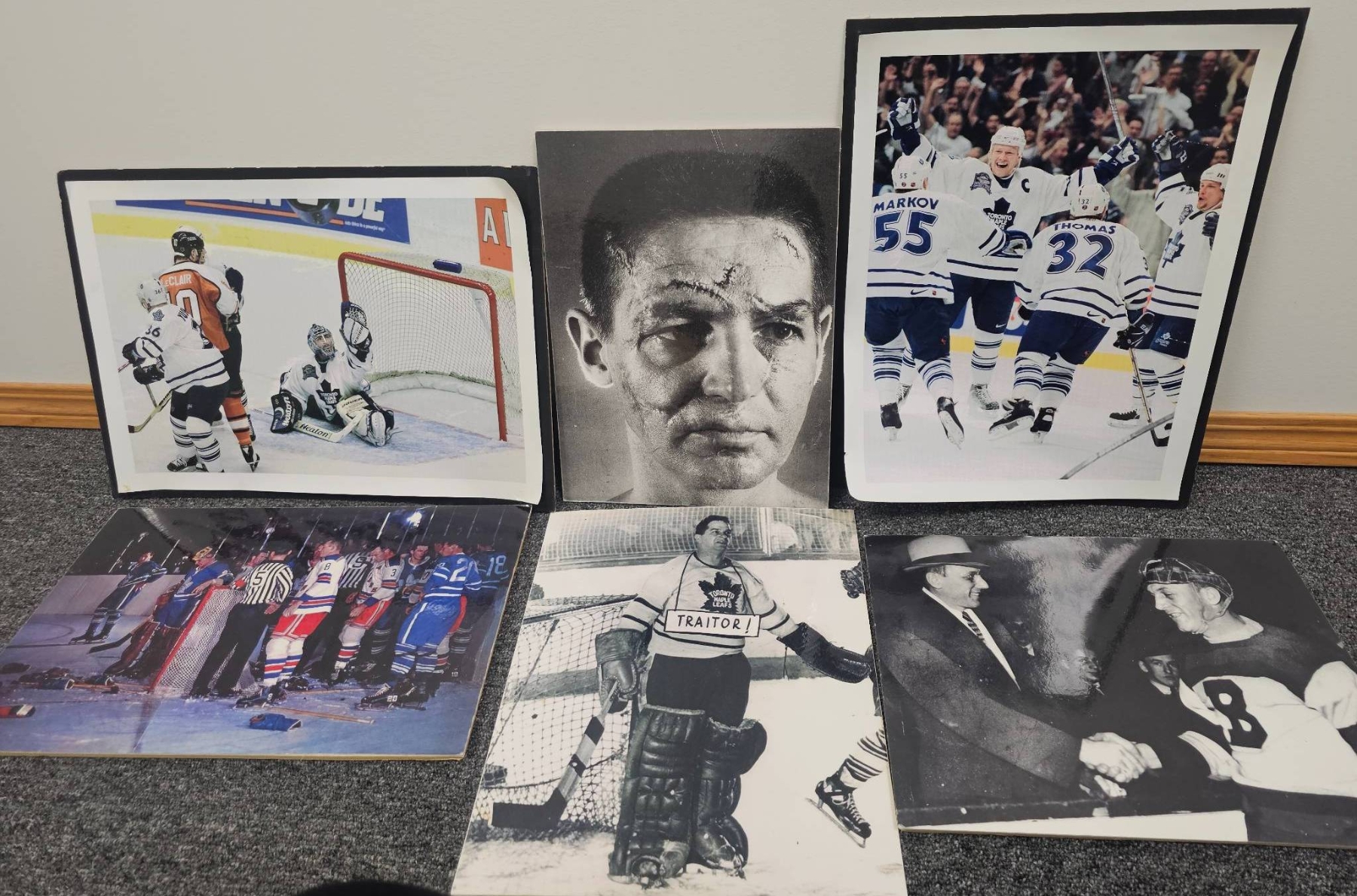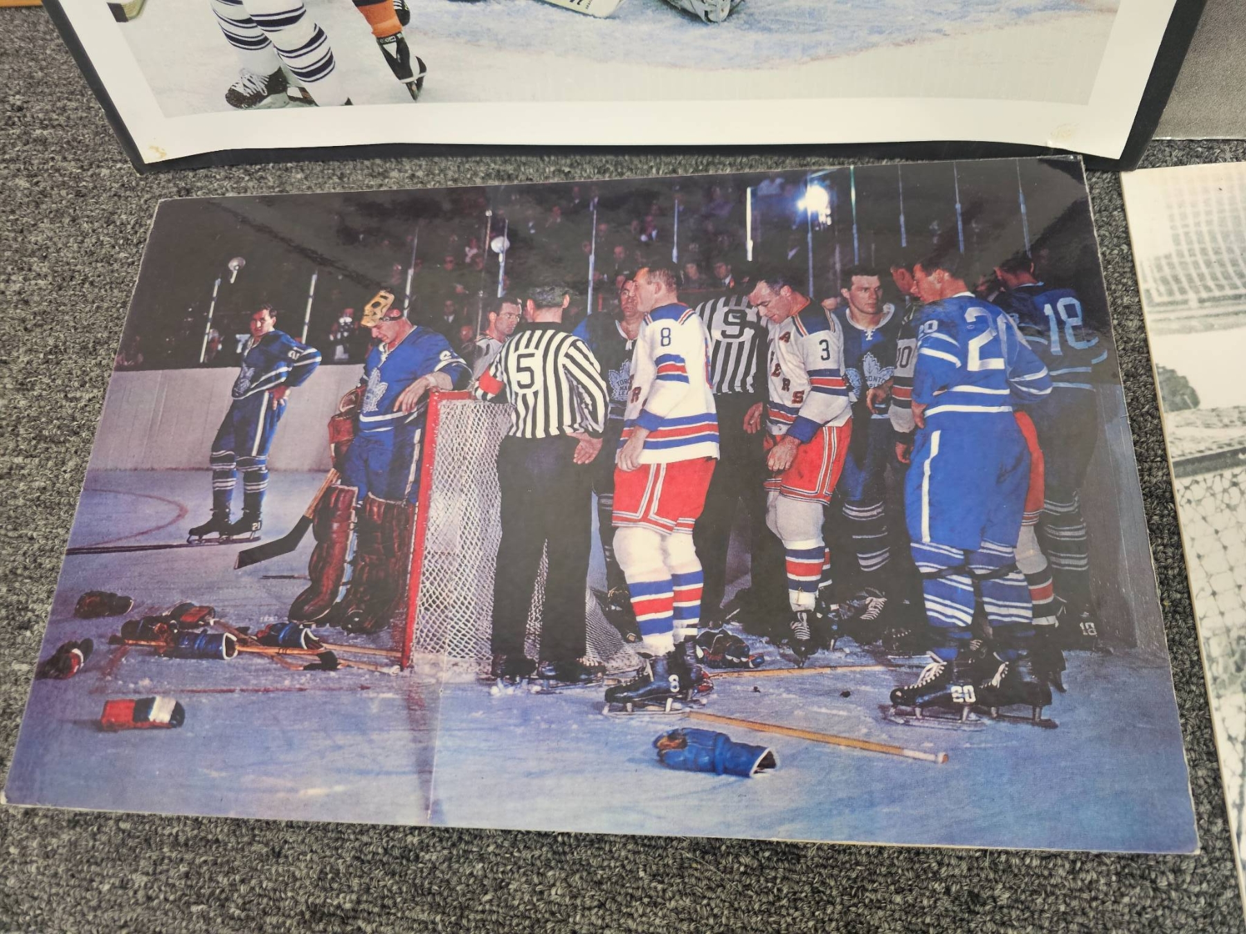 Hockey photographs, both vintage and modern, celebrating iconic hockey moments and players. Includes black-and-white and color images, featuring team celebrations, dramatic action shots, and compelling portraits. Subjects include players in Toronto Maple Leafs gear and historical highlights. Ideal for hockey enthusiasts and collectors seeking unique memorabilia.