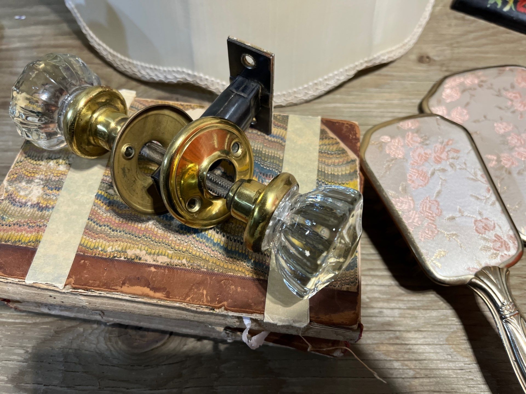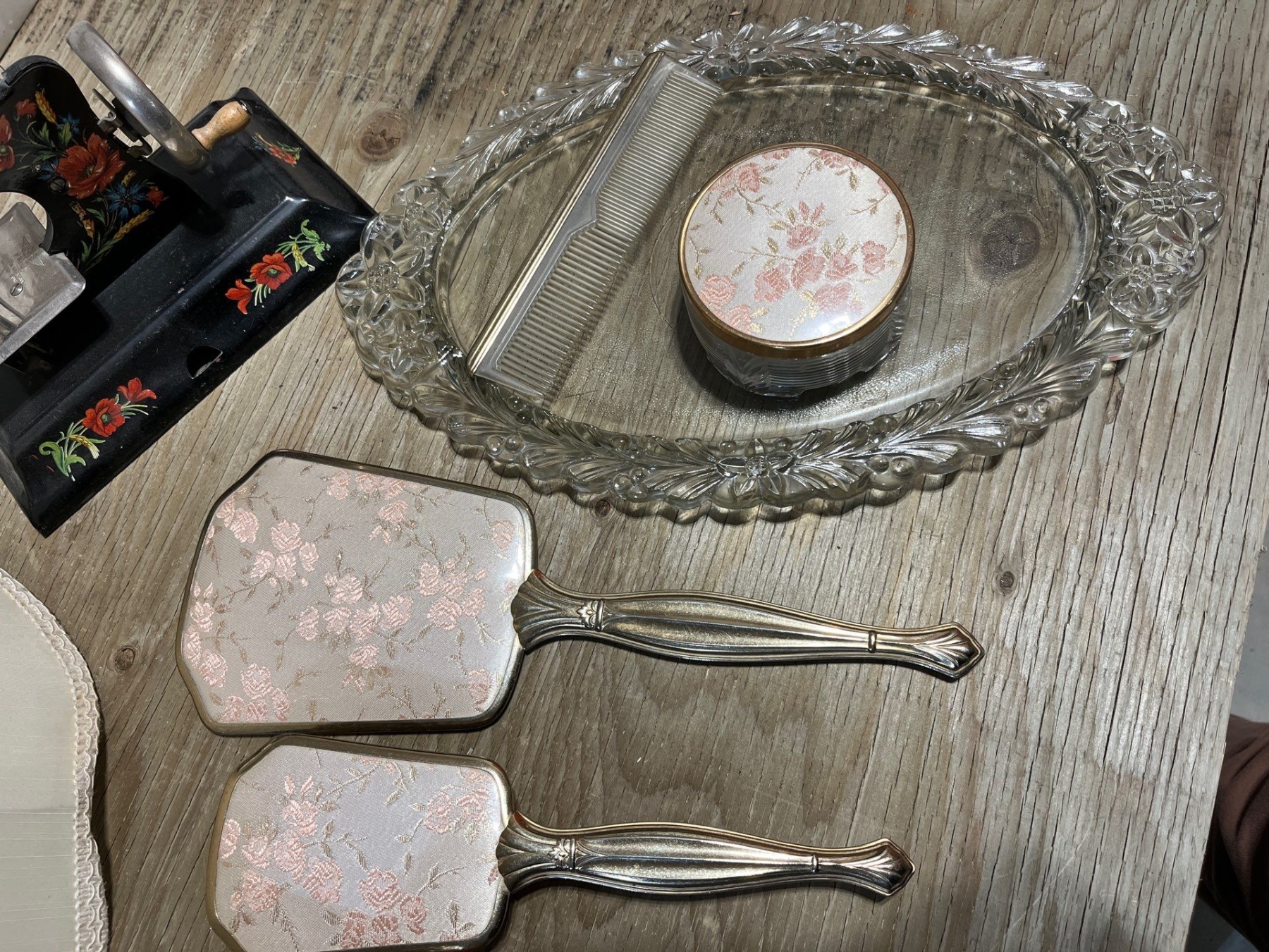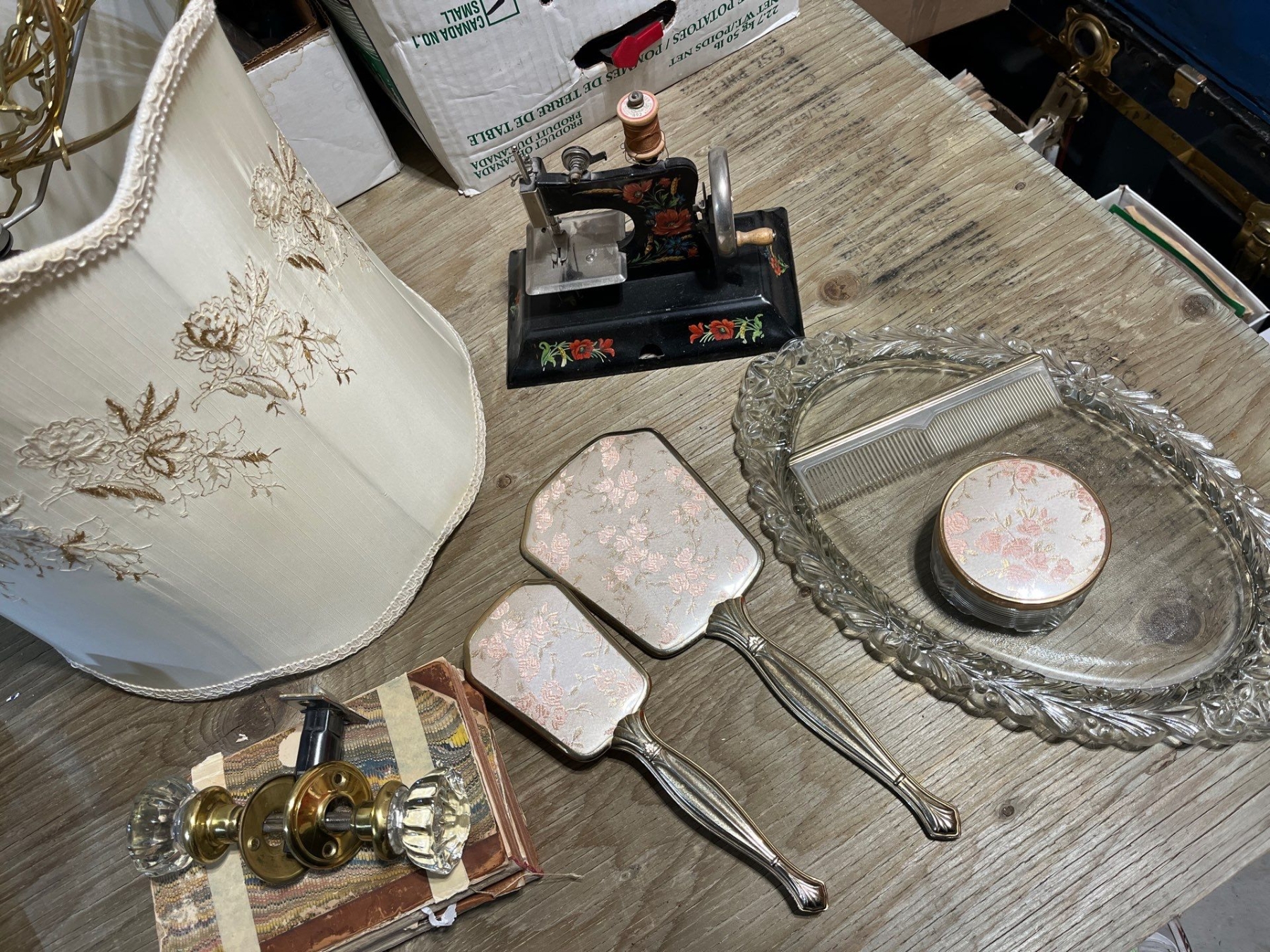 Vintage beauty set mirror brush comb with glass plate, glass jar for cosmetic powder, hanging lamp with gold thread, trim, glass door knob, vintage manual, sewing machine made in Germany