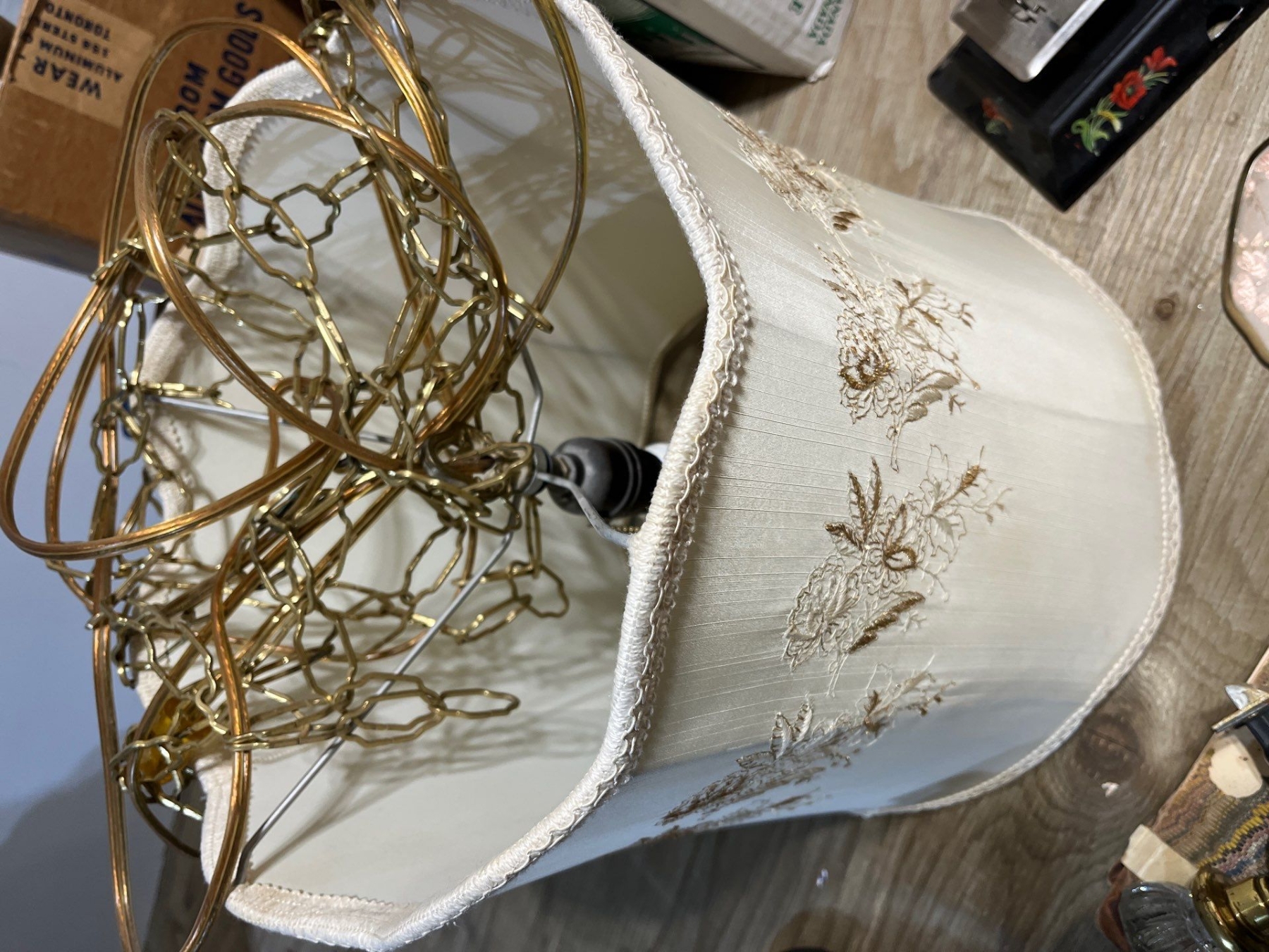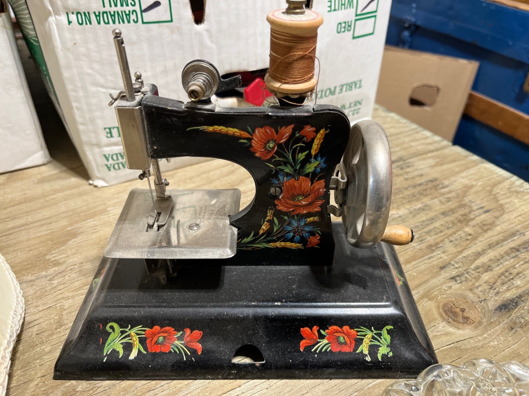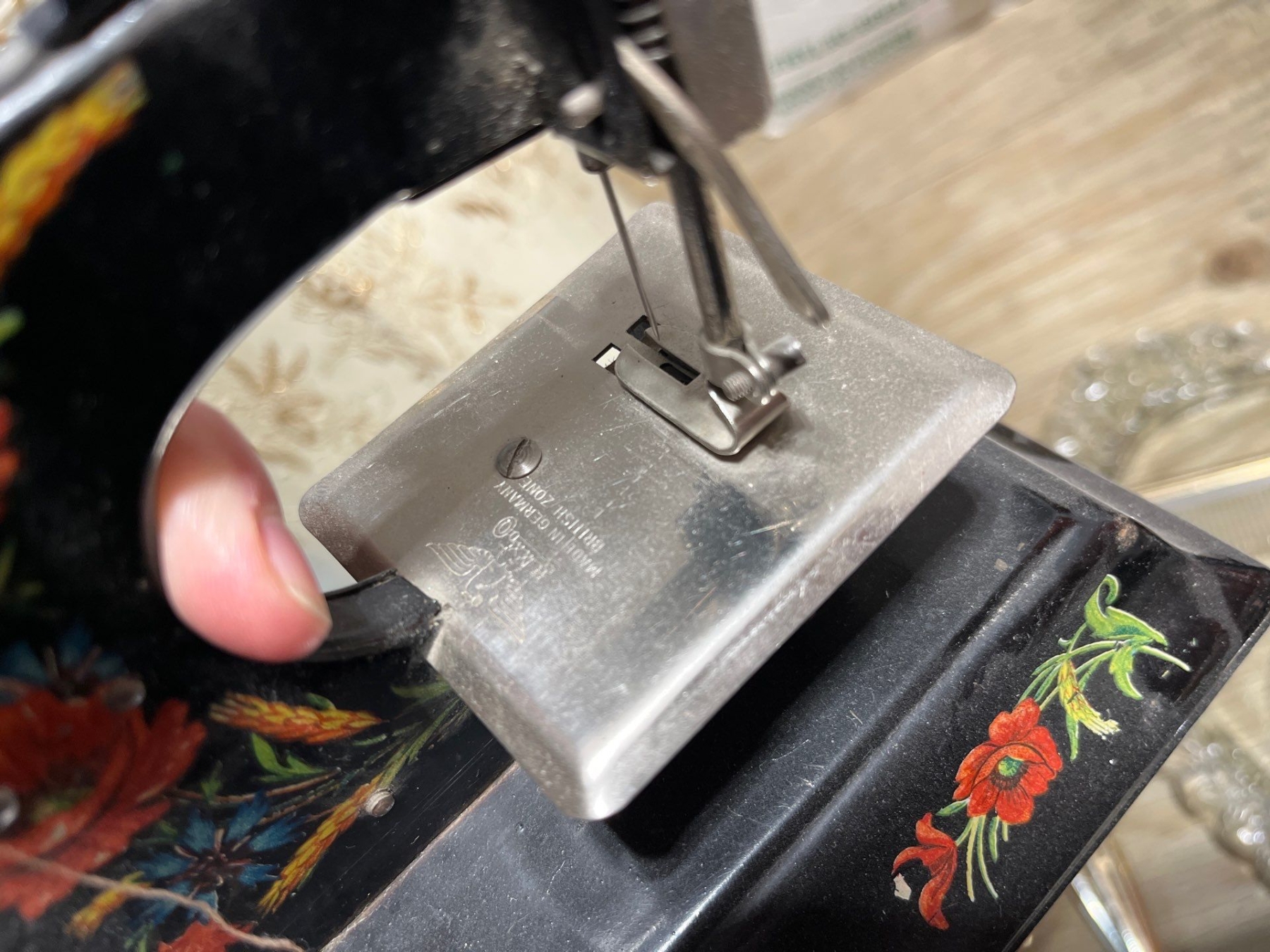 Vintage beauty set mirror brush comb with glass plate, glass jar for cosmetic powder, hanging lamp with gold thread, trim, glass door knob, vintage manual, sewing machine made in Germany