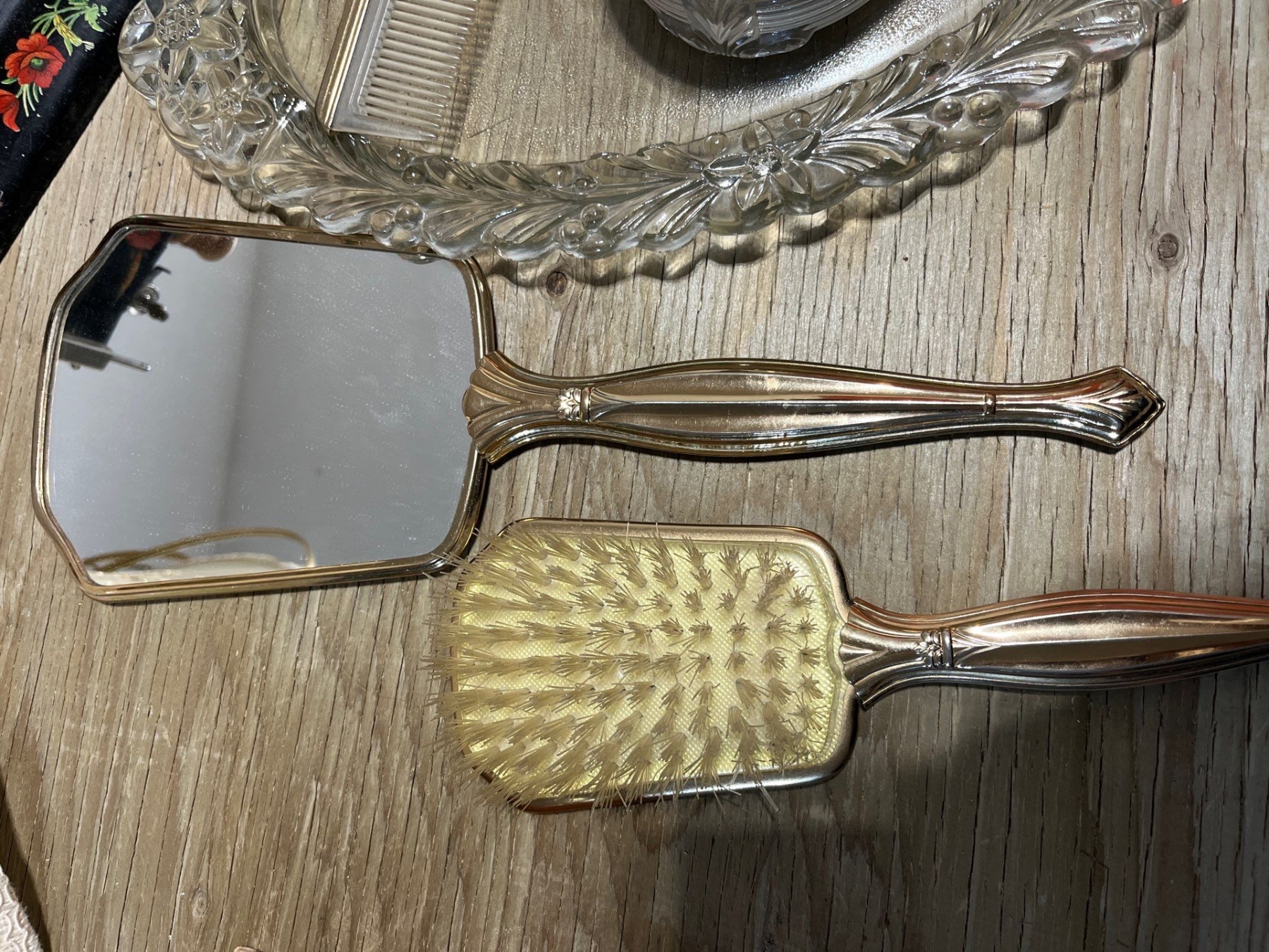 Vintage beauty set mirror brush comb with glass plate, glass jar for cosmetic powder, hanging lamp w