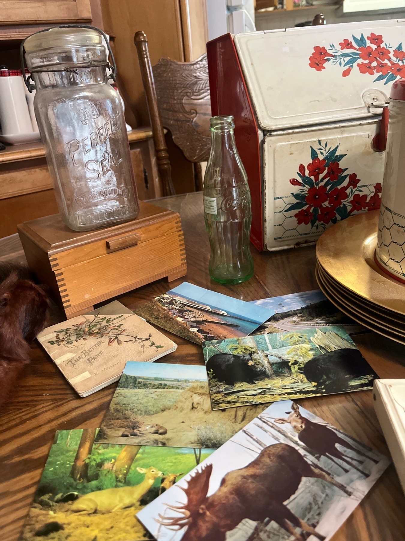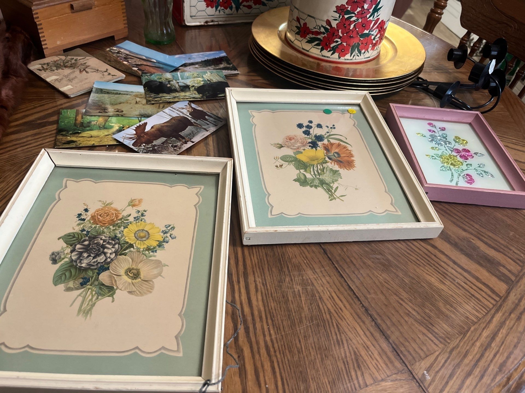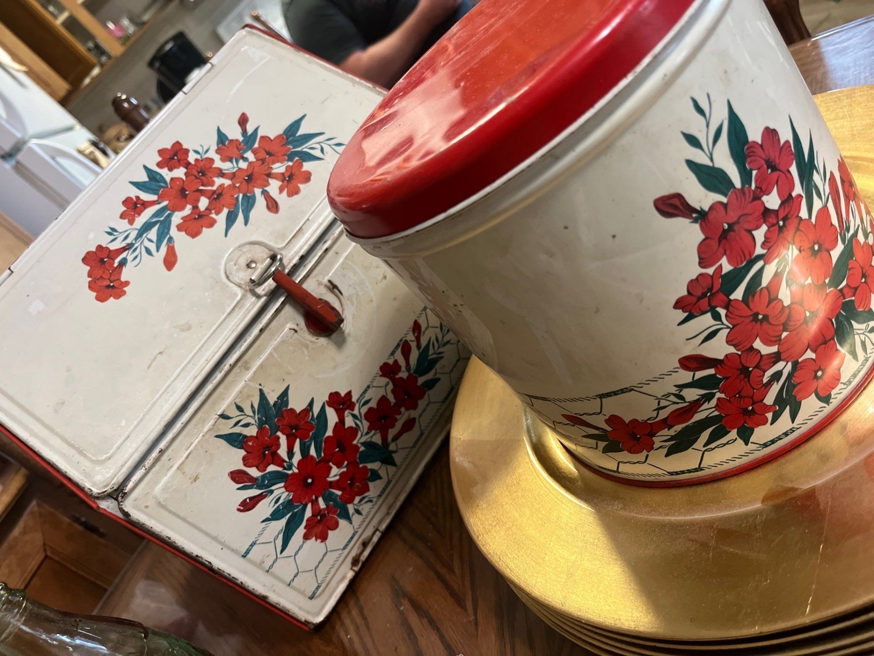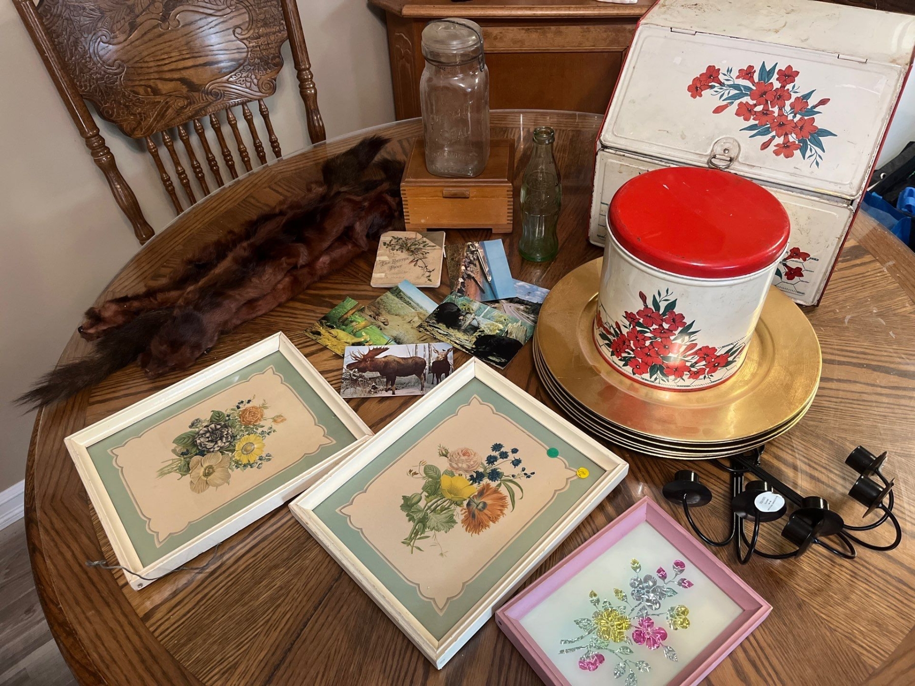 Vintage bread box and canister, set of plate Chargers , Coca-Cola bottle, small wooden box and vintage mason jar with three floral prints & firs