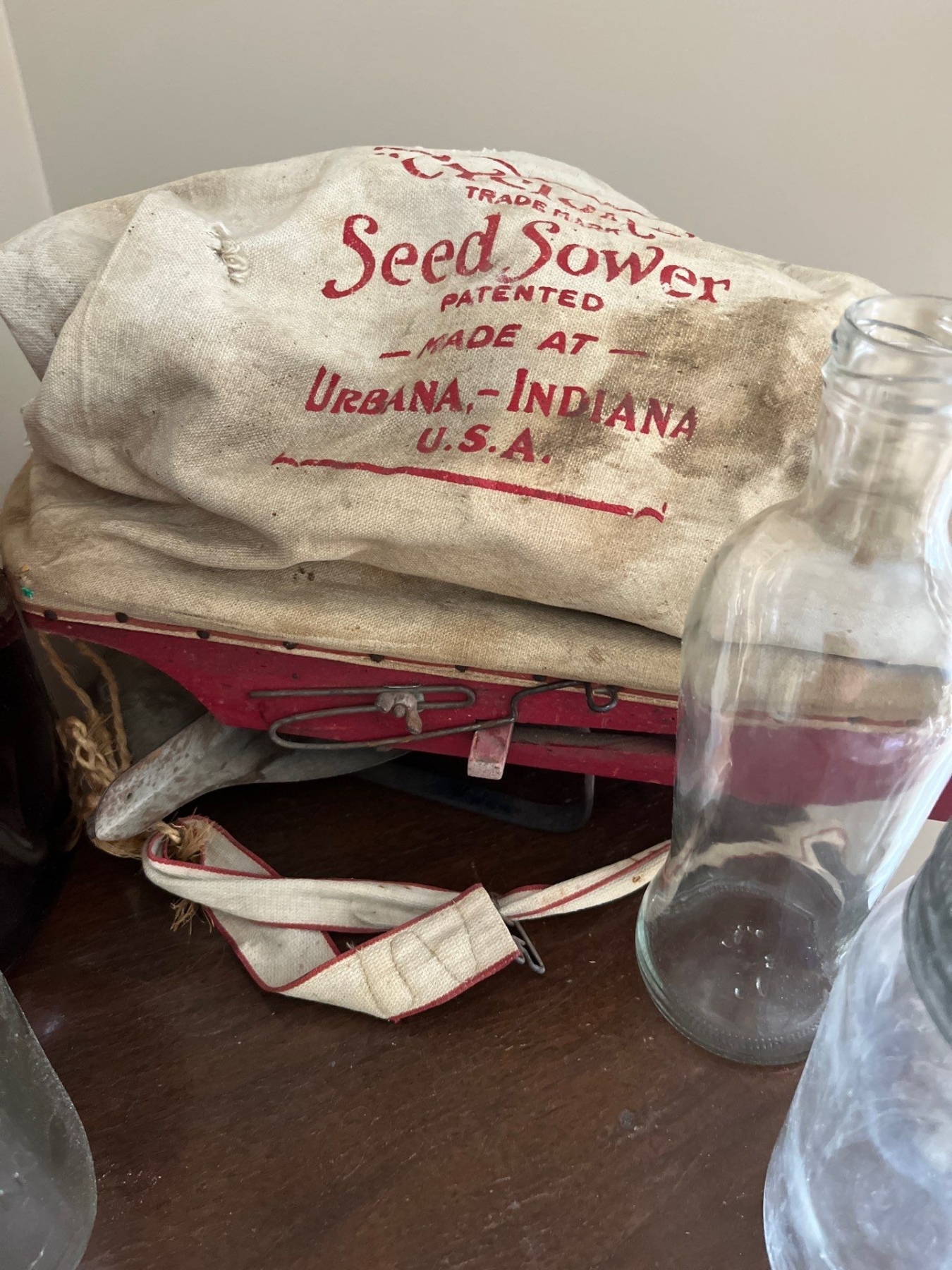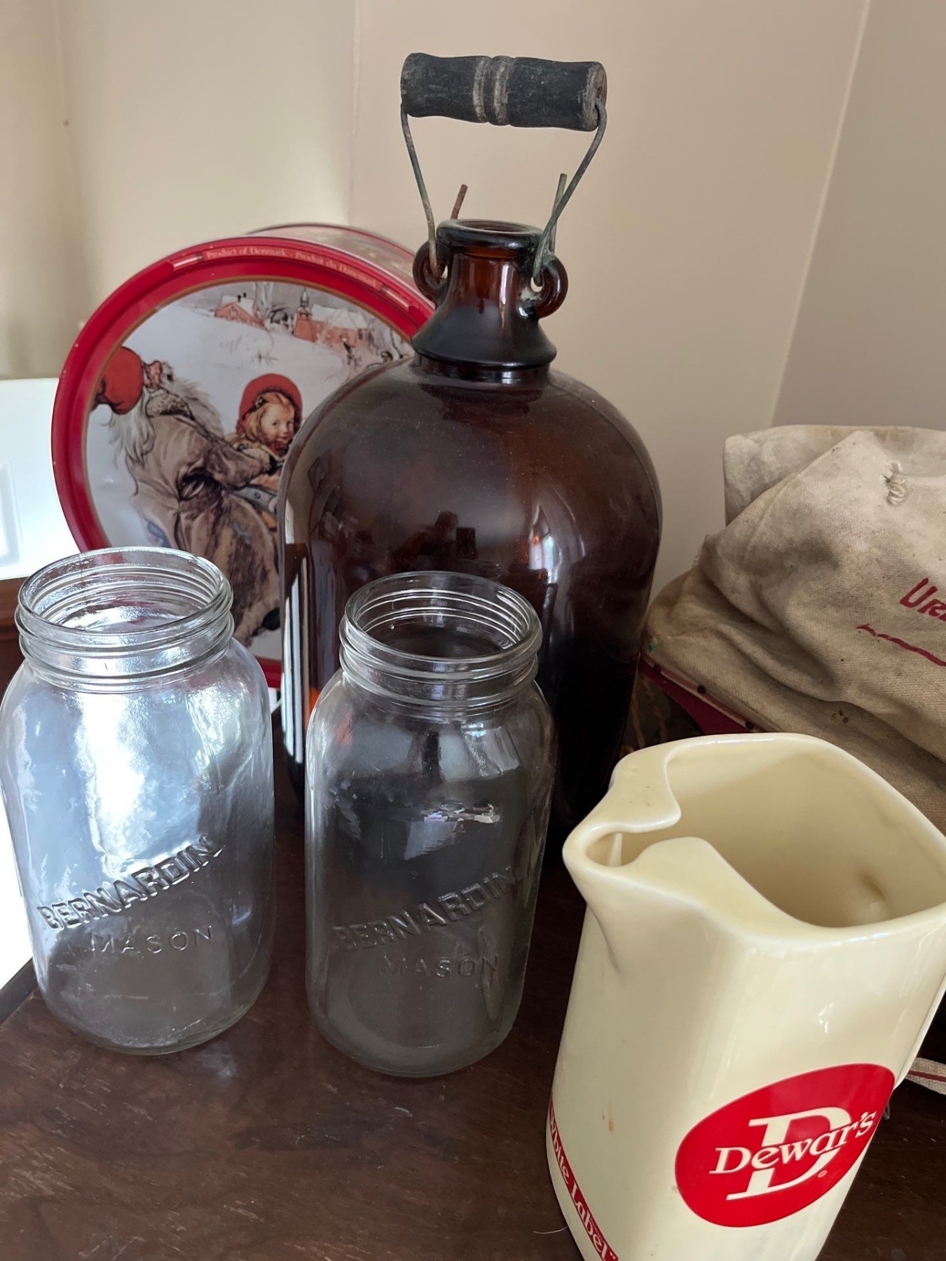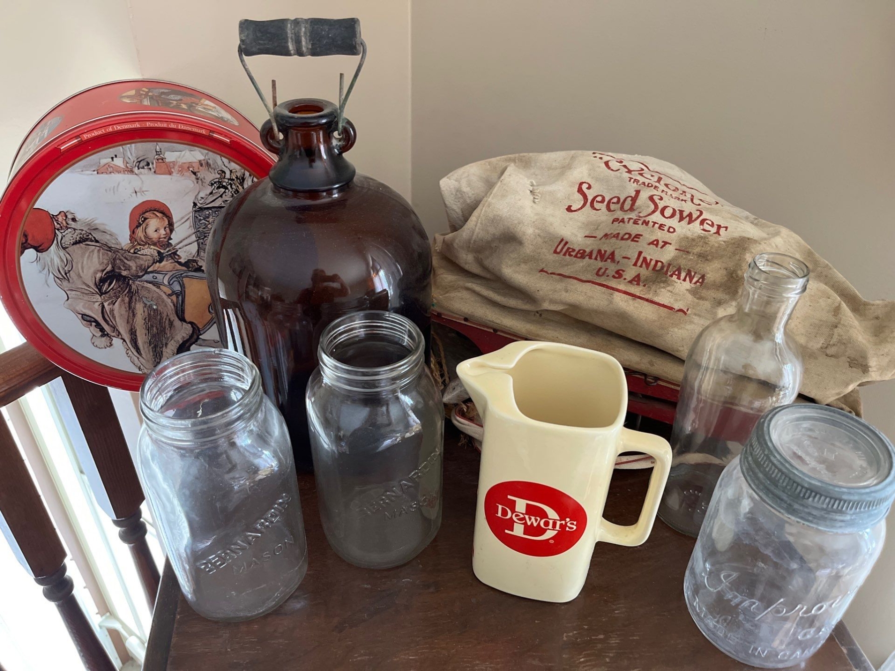Vintage brown jug, antique handheld seed, spreading system, canning jars and a vintage Hinze's glass bottle .