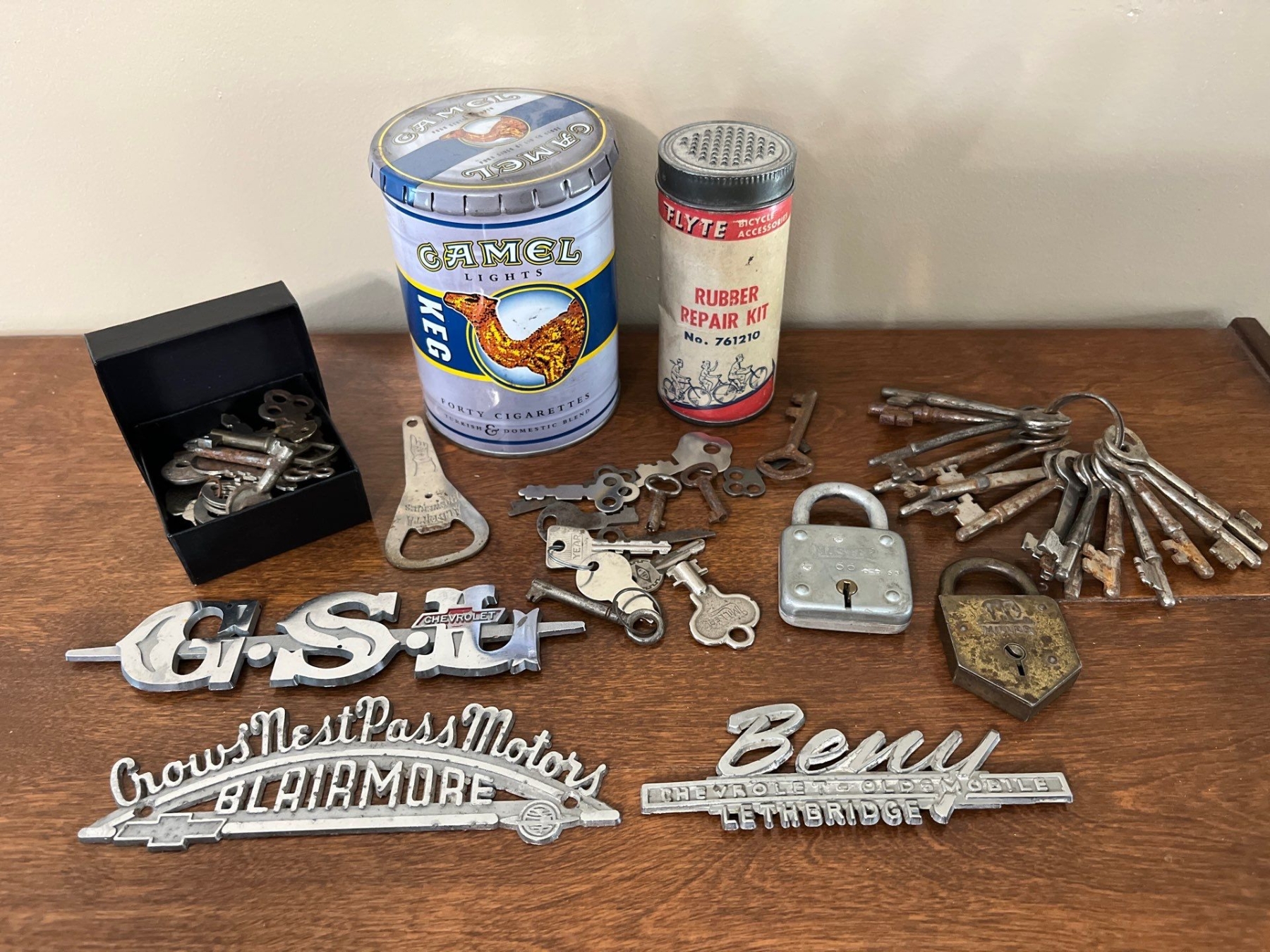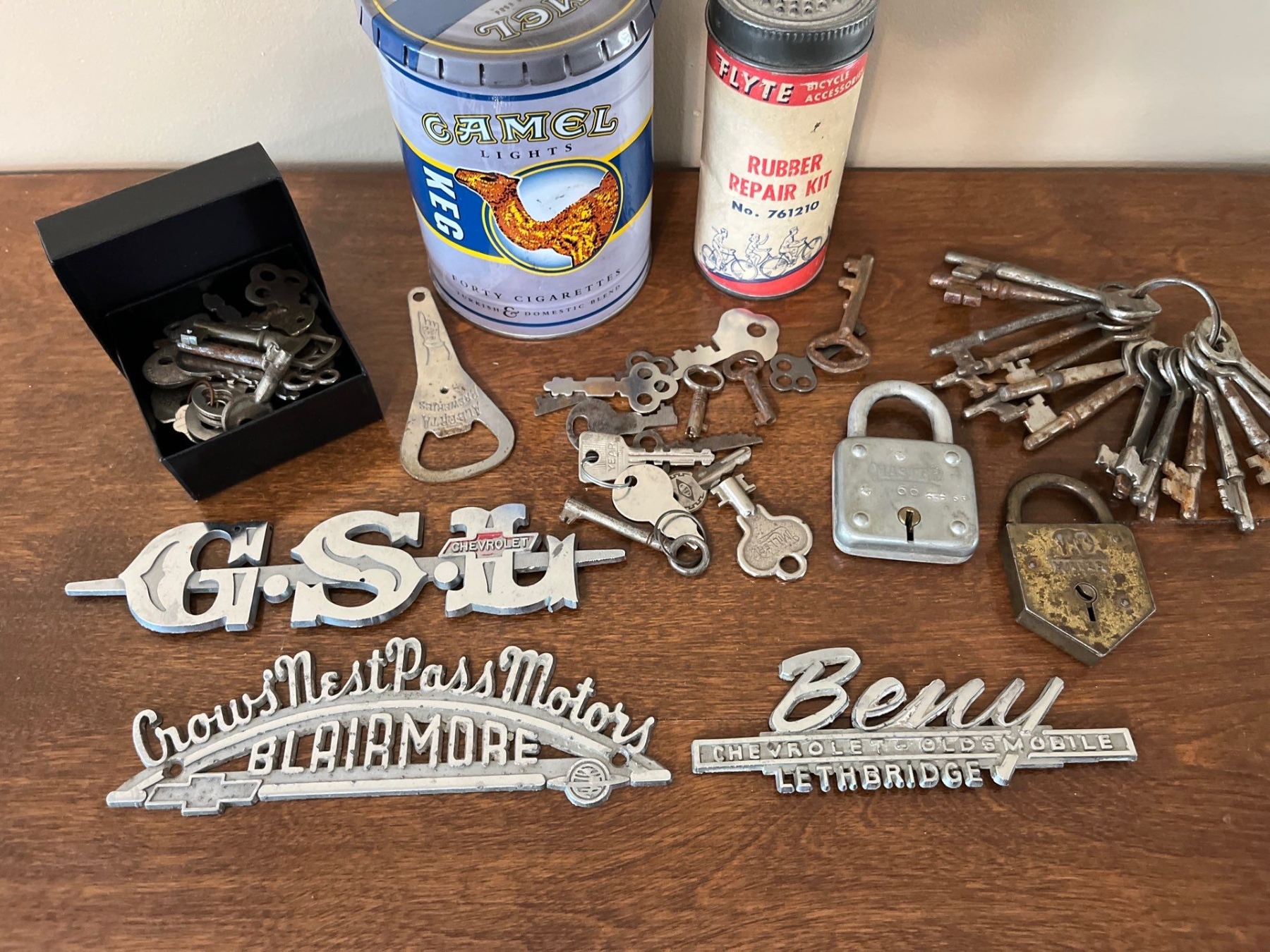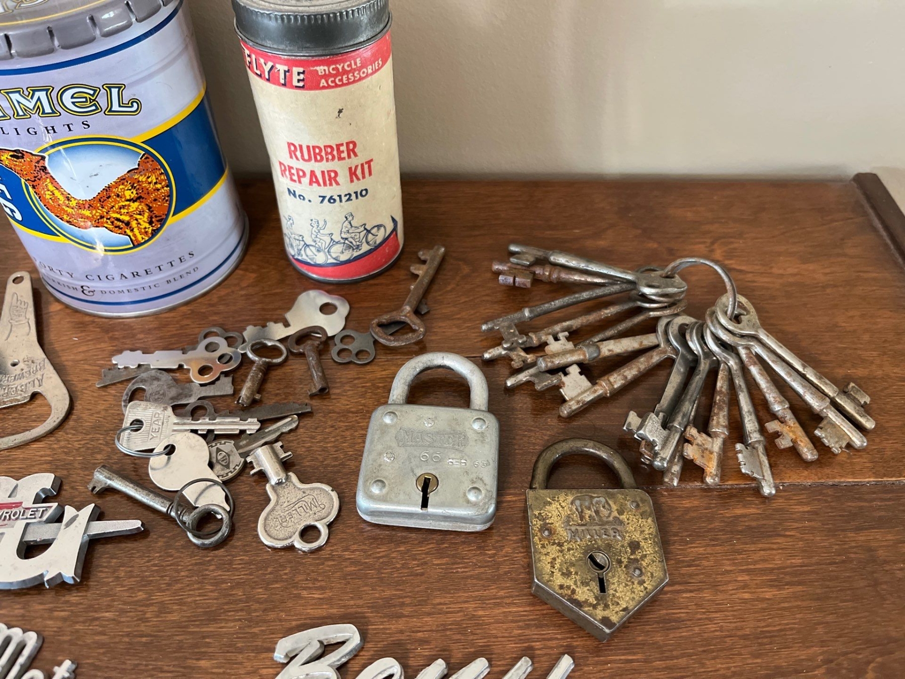 Vintage car dealership signs several antique keys and locks as well as a camel tin and a antique rubber repair kit