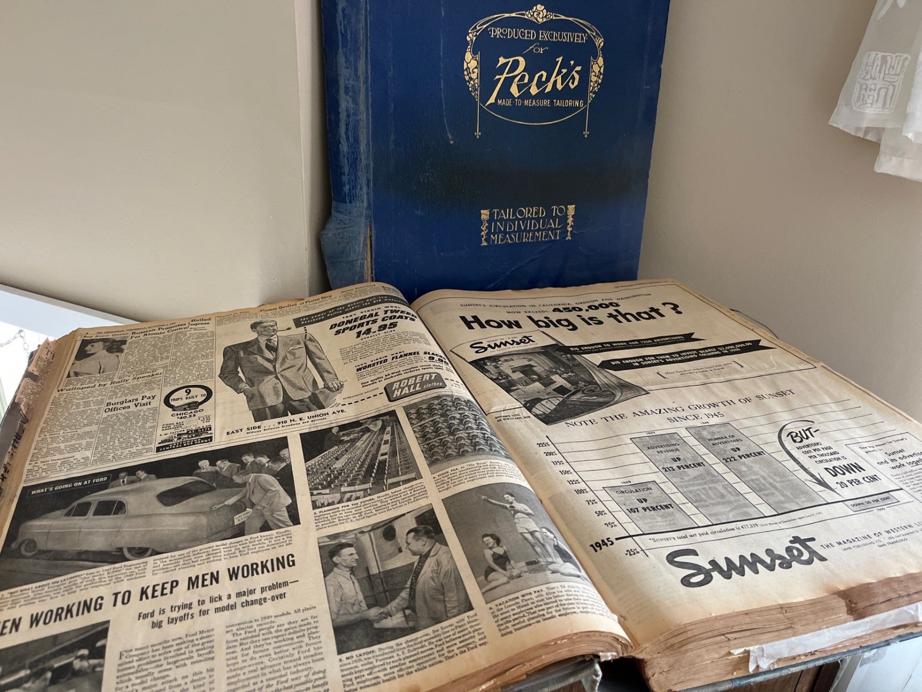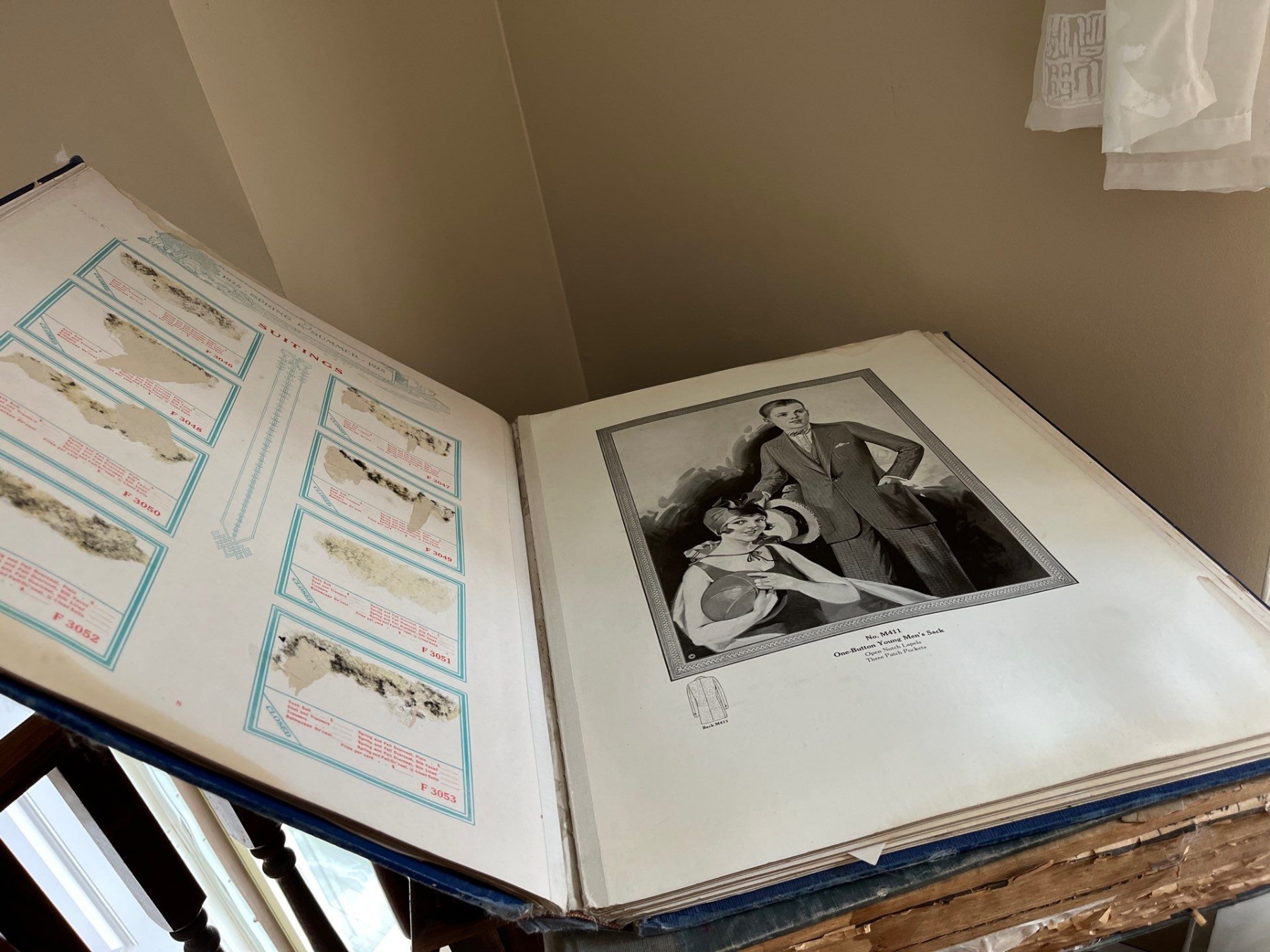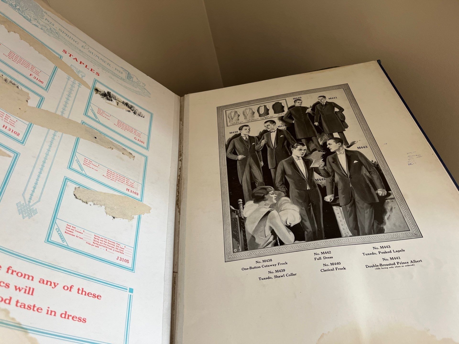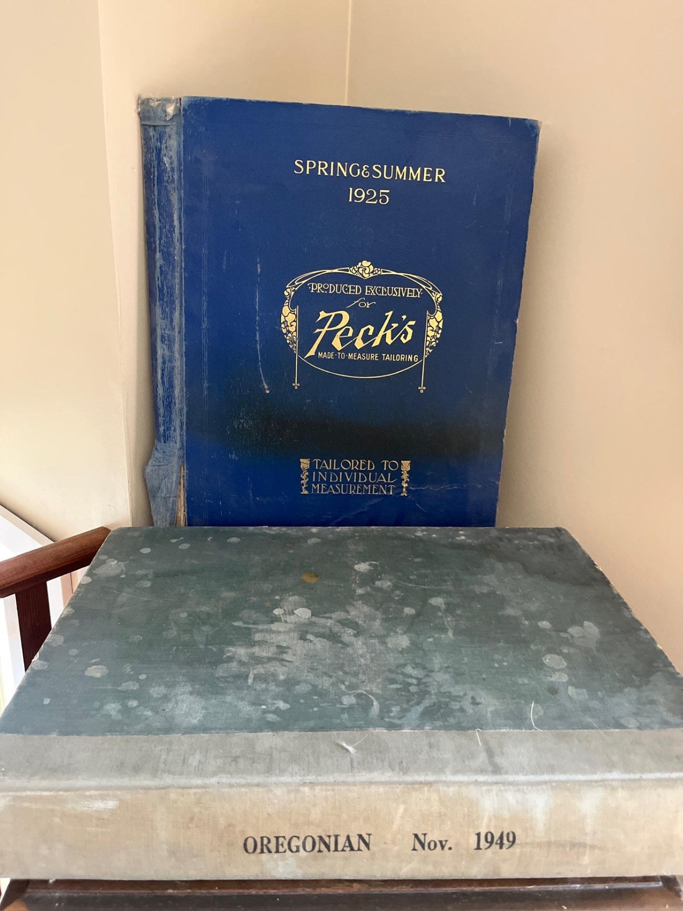 Vintage catalog or pattern book from "Peck's," a made-to-measure tailoring company, for their Spring & Summer 1925 collection and hey very large book from 1949 with several news articles from San Francisco
