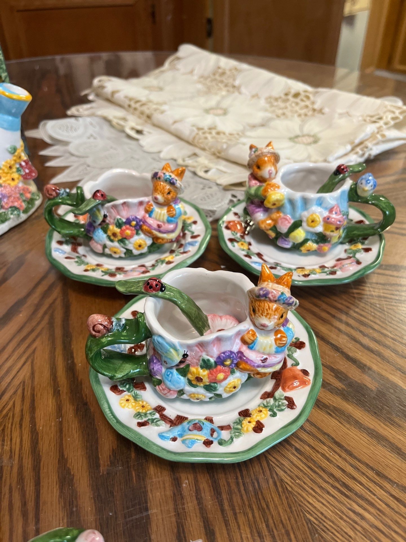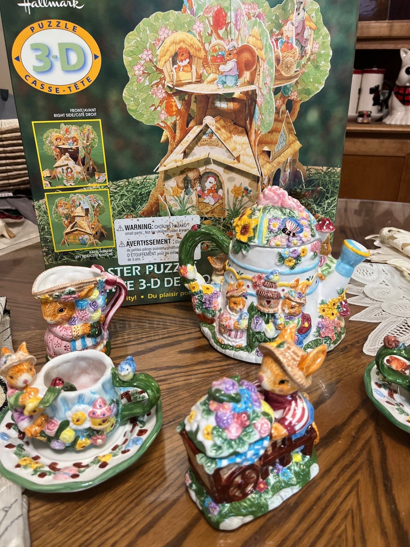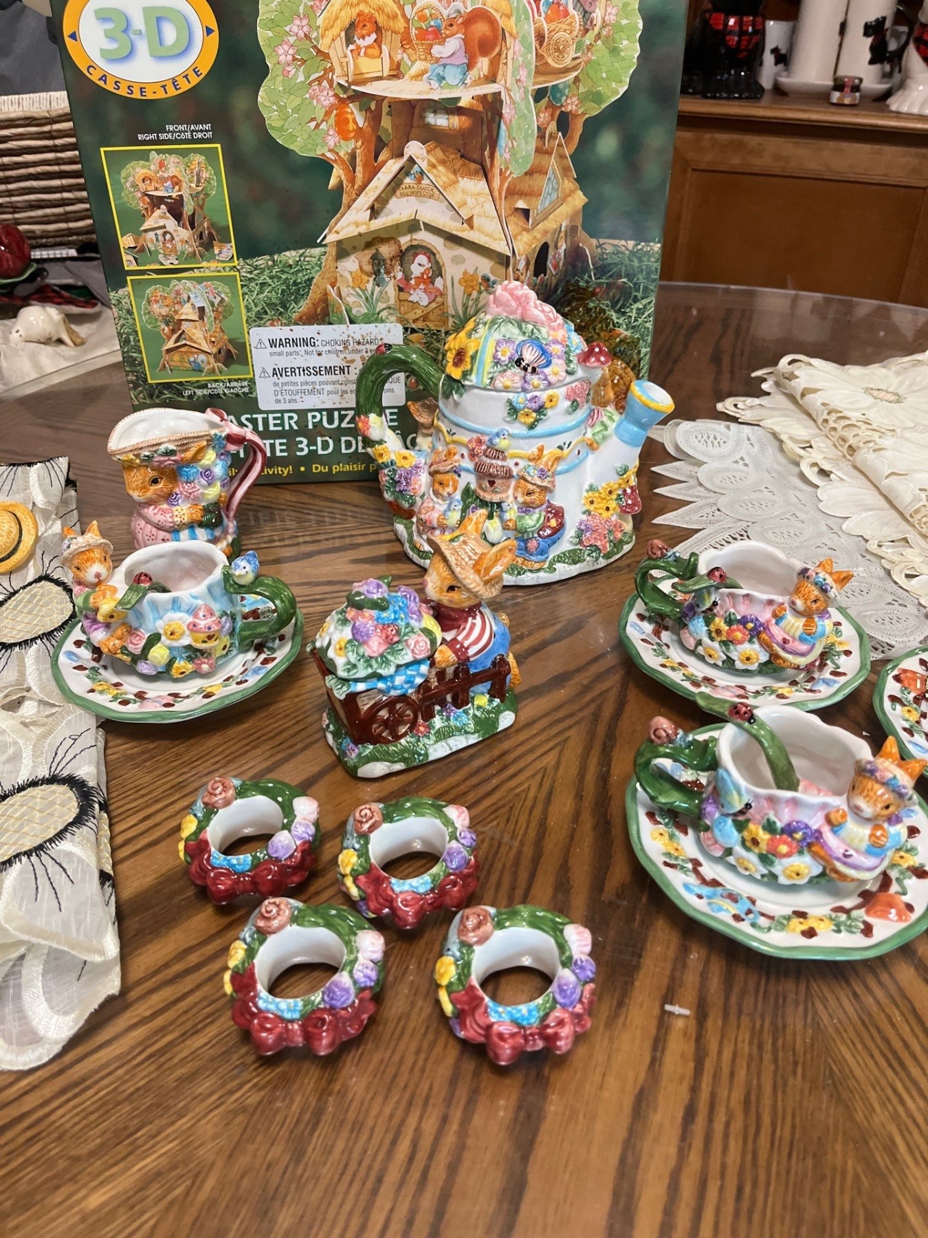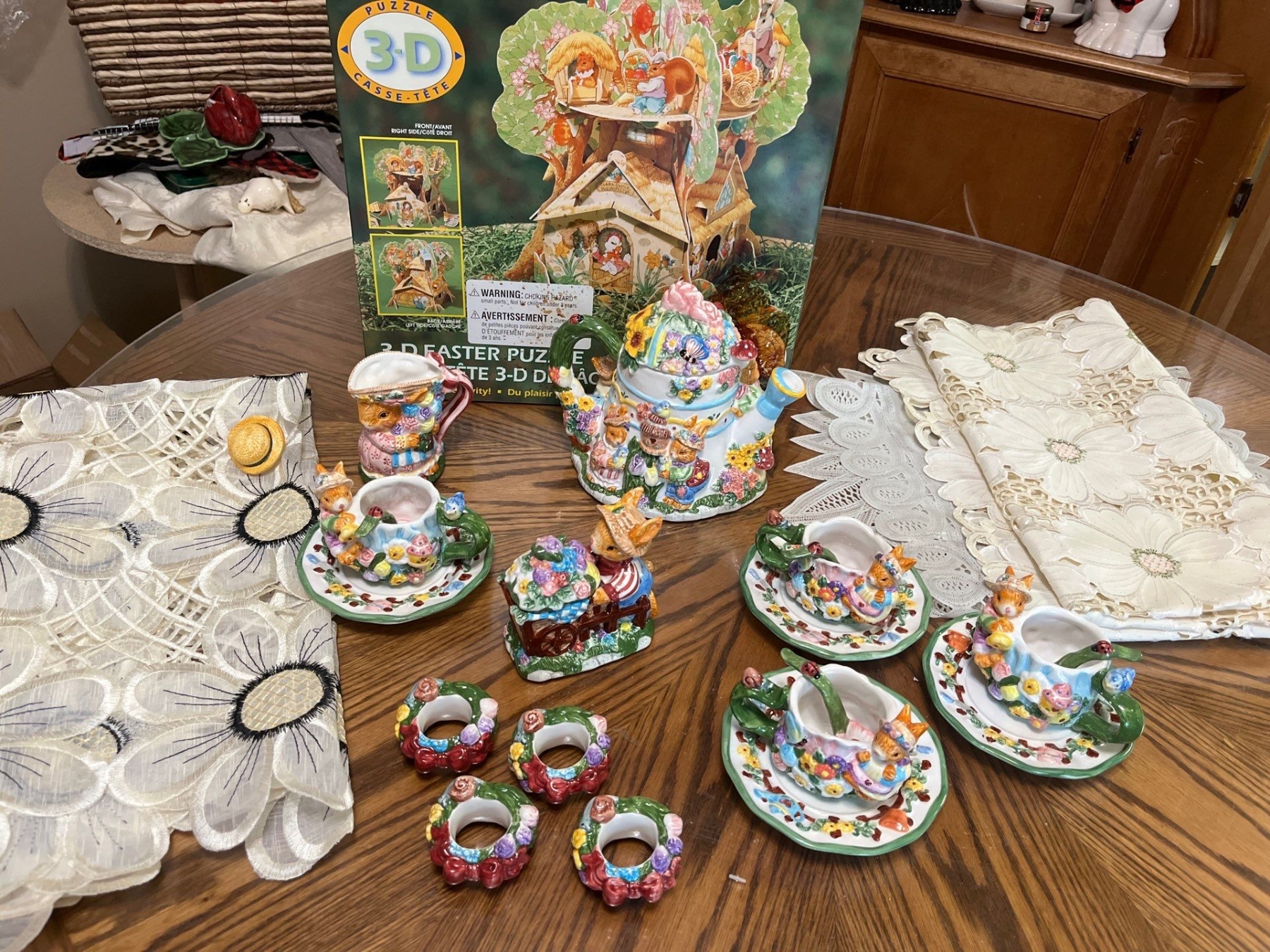 Vintage ceramic teapot, specifically identified as a "Mercuries Bunny Rabbit Teapot set " from the 1999 Springtime" collection with puzzle vintage table, runners, and table cloths.