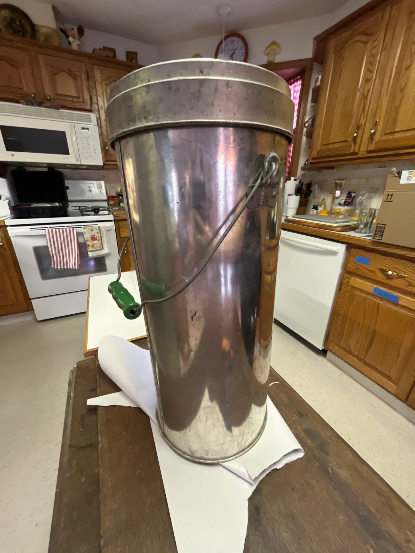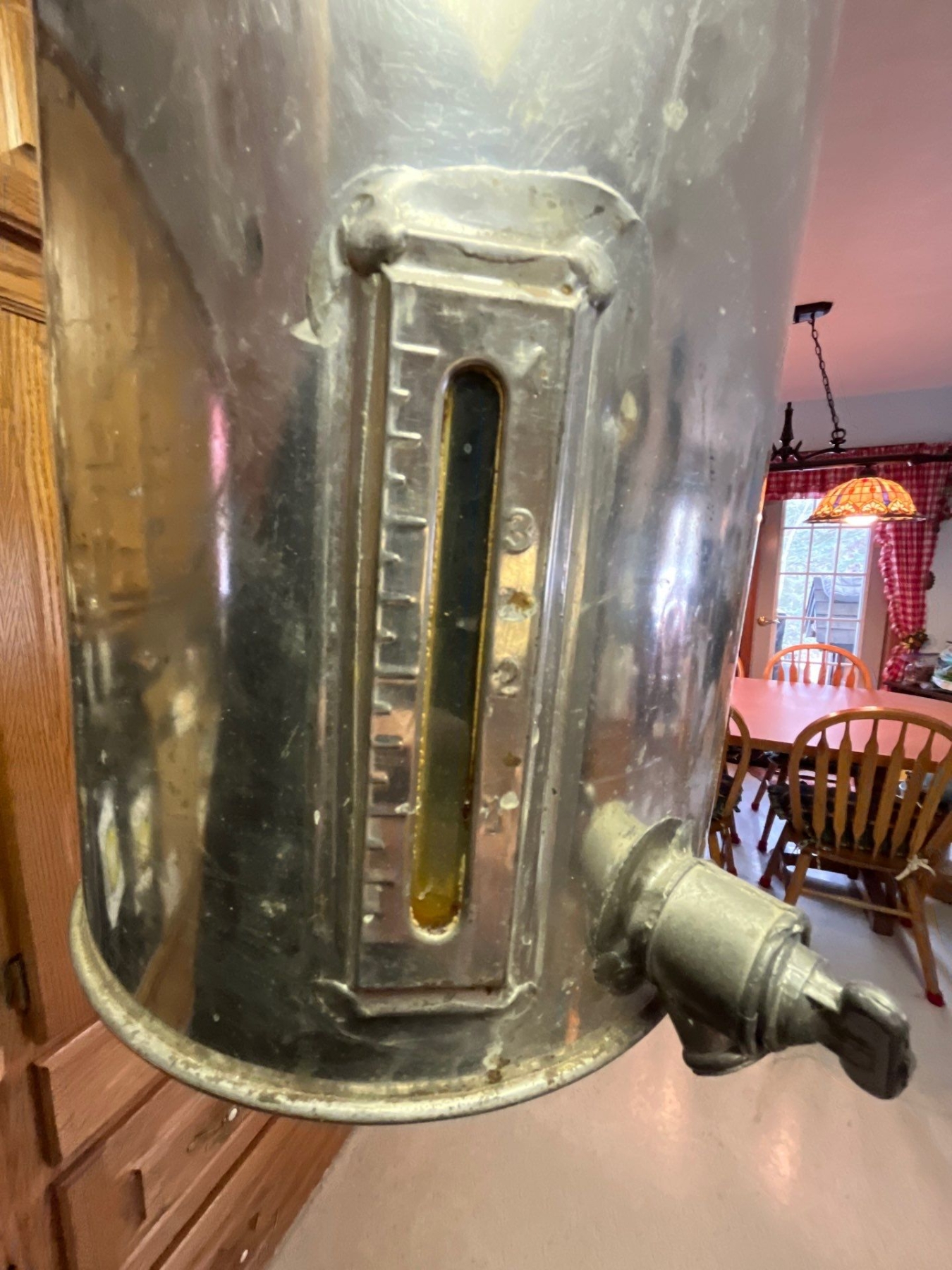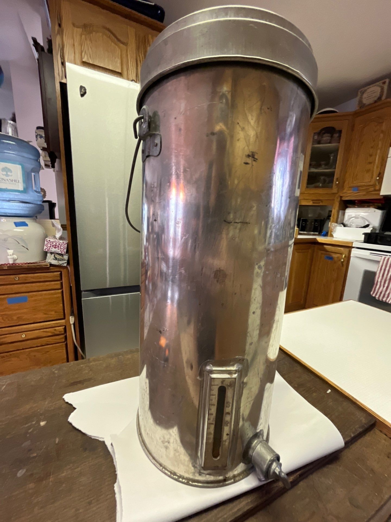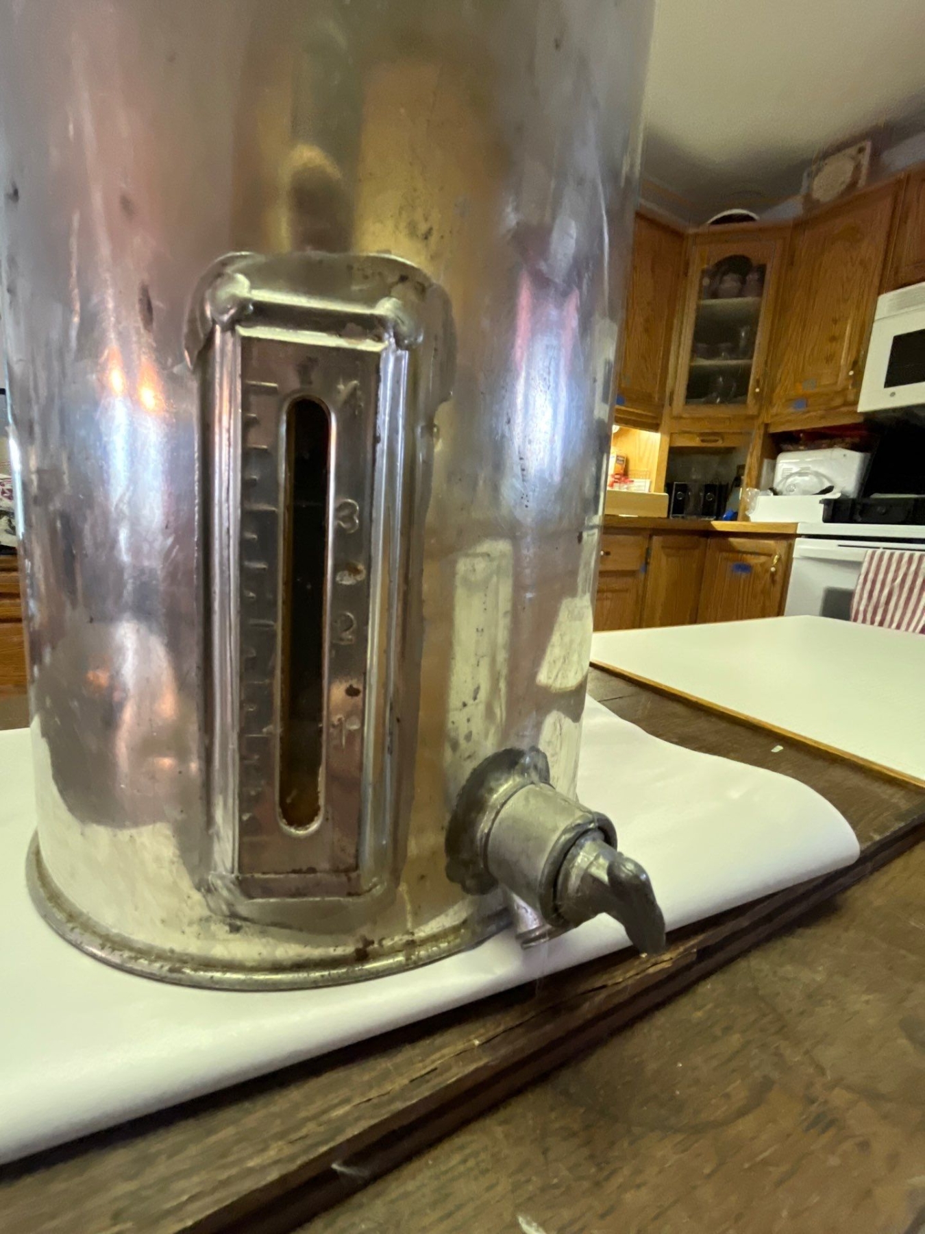 Vintage commercial coffee urn/percolator, used for brewing and dispensing large quantities of coffee.