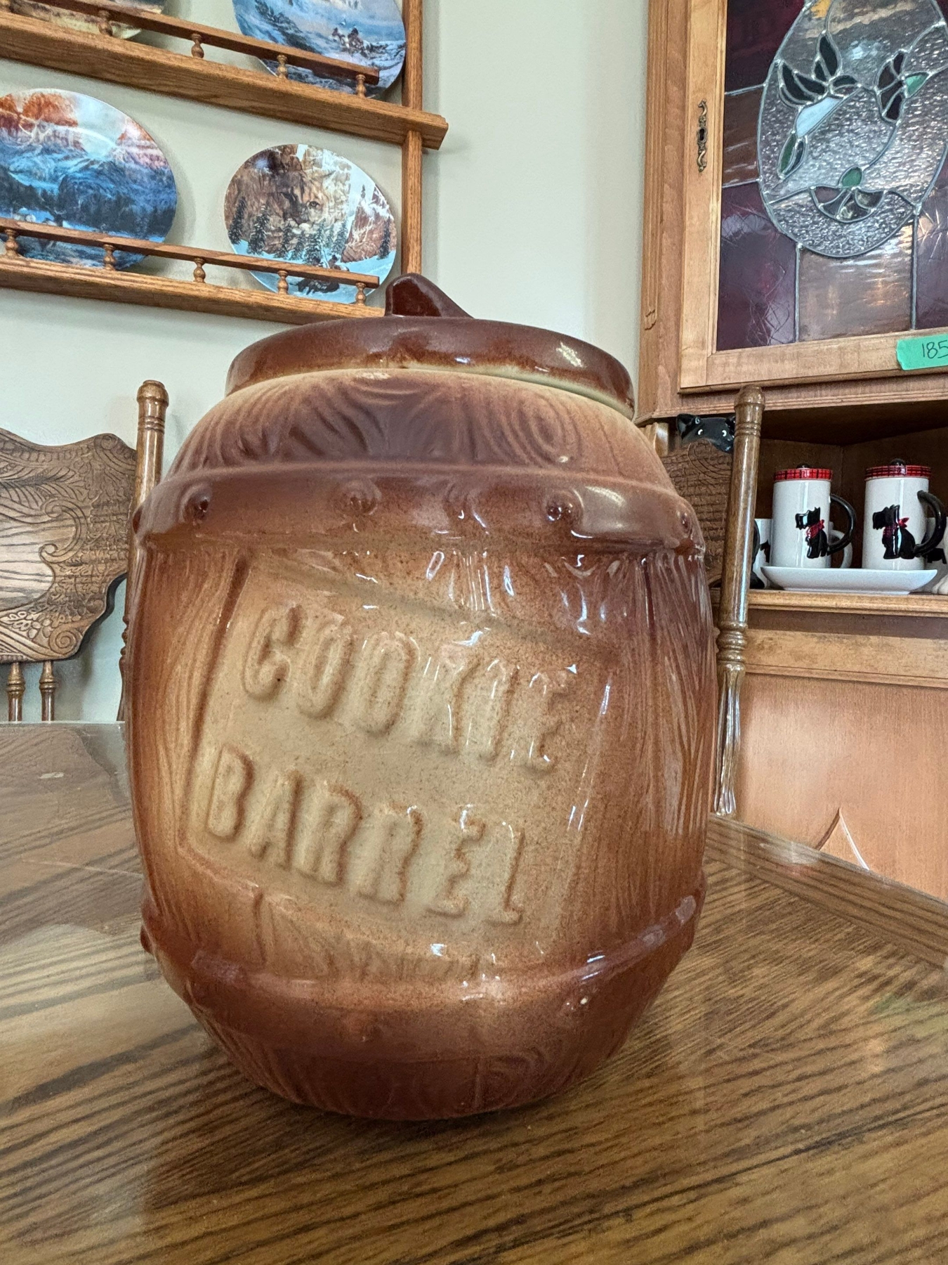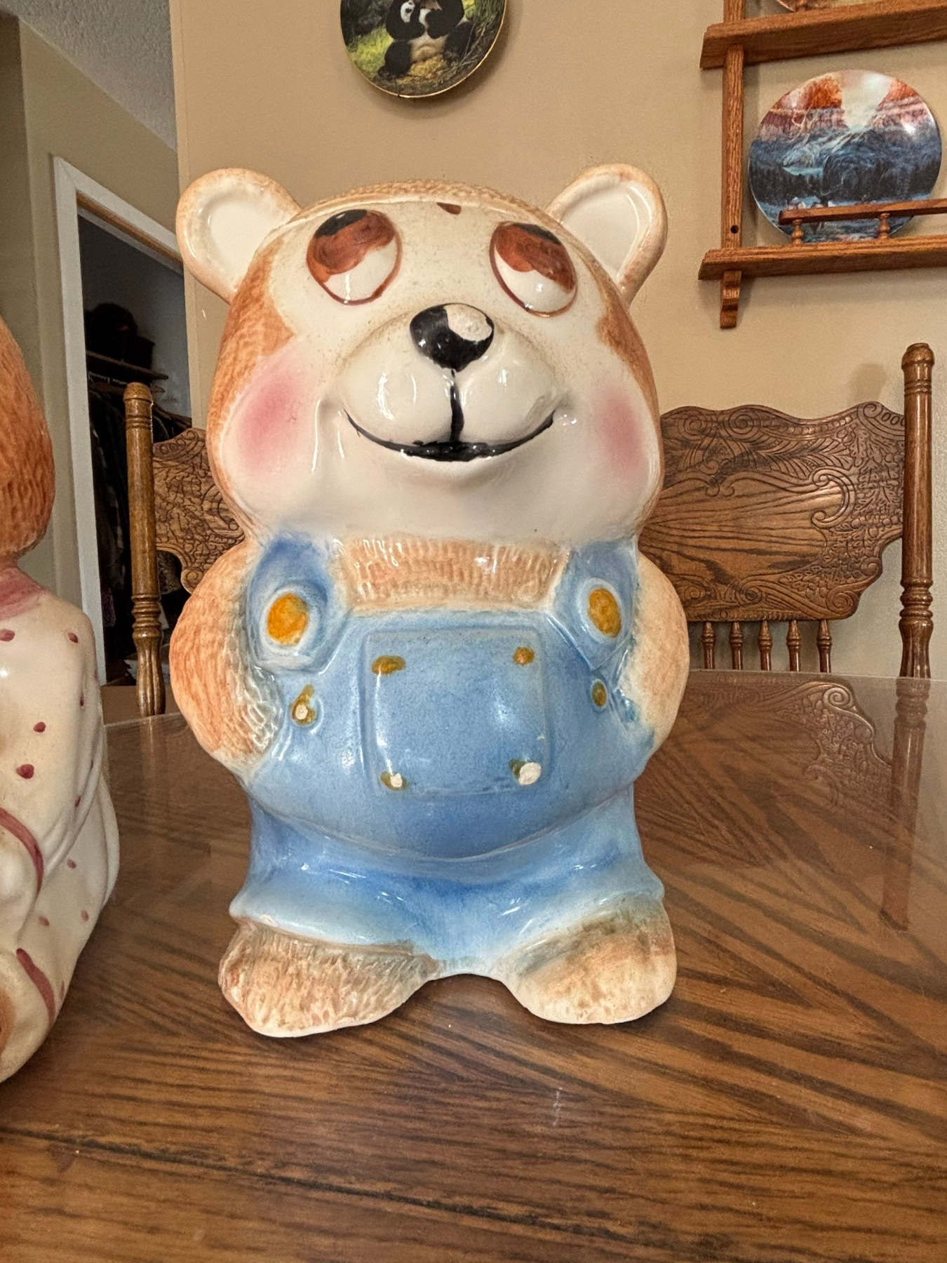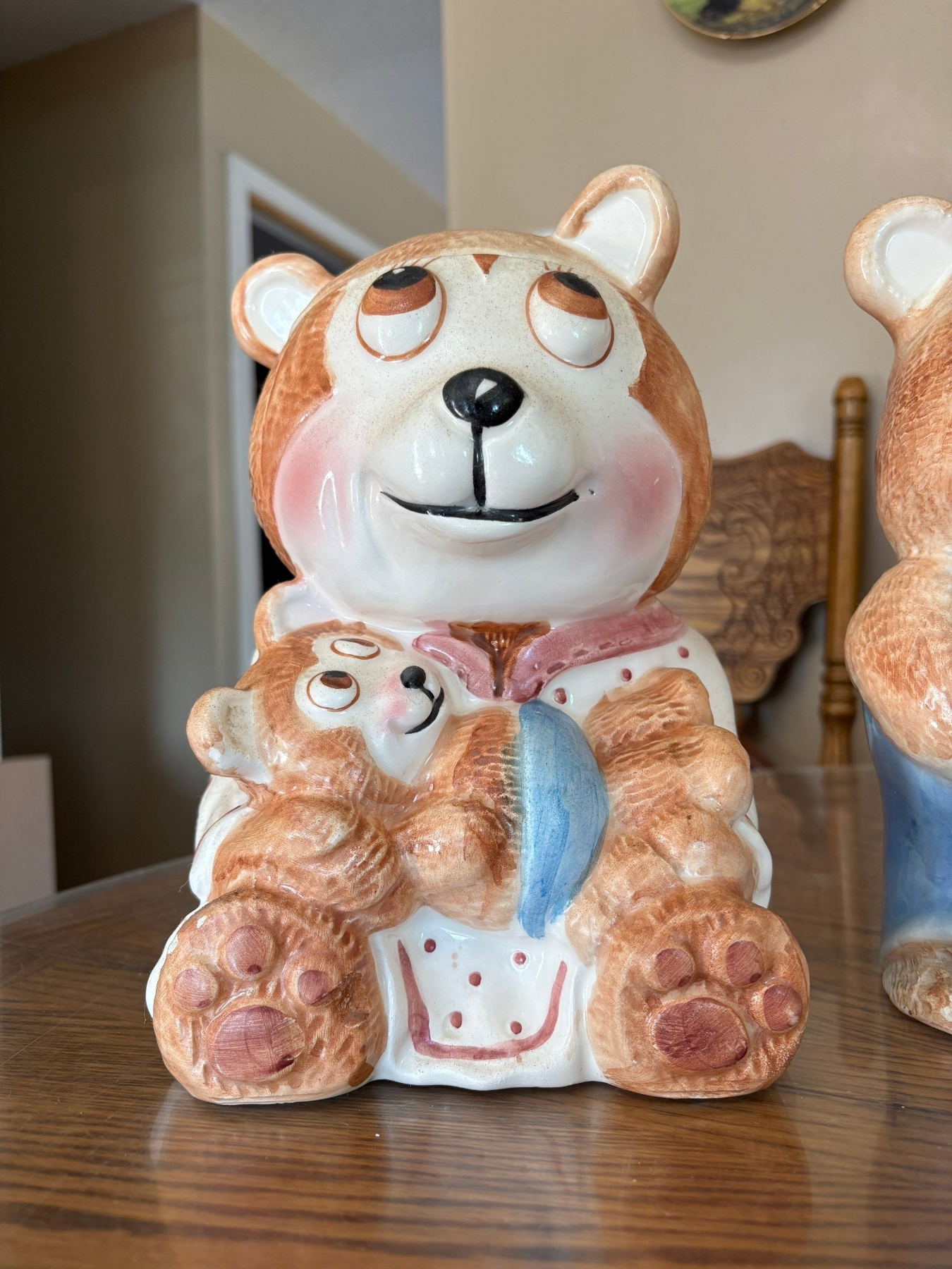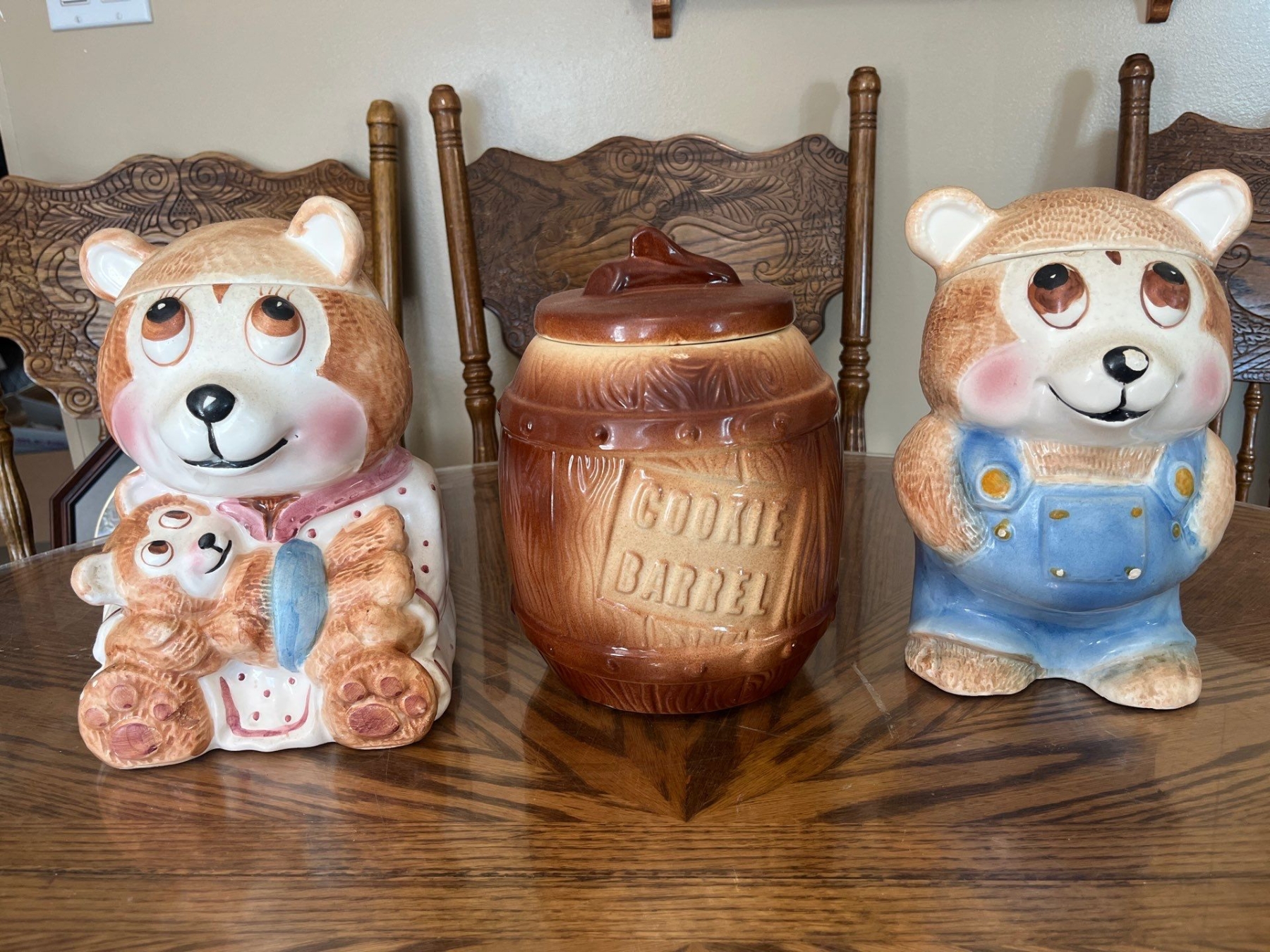 Vintage cookie jars, two bears and a cookie barrel from the 1950s
