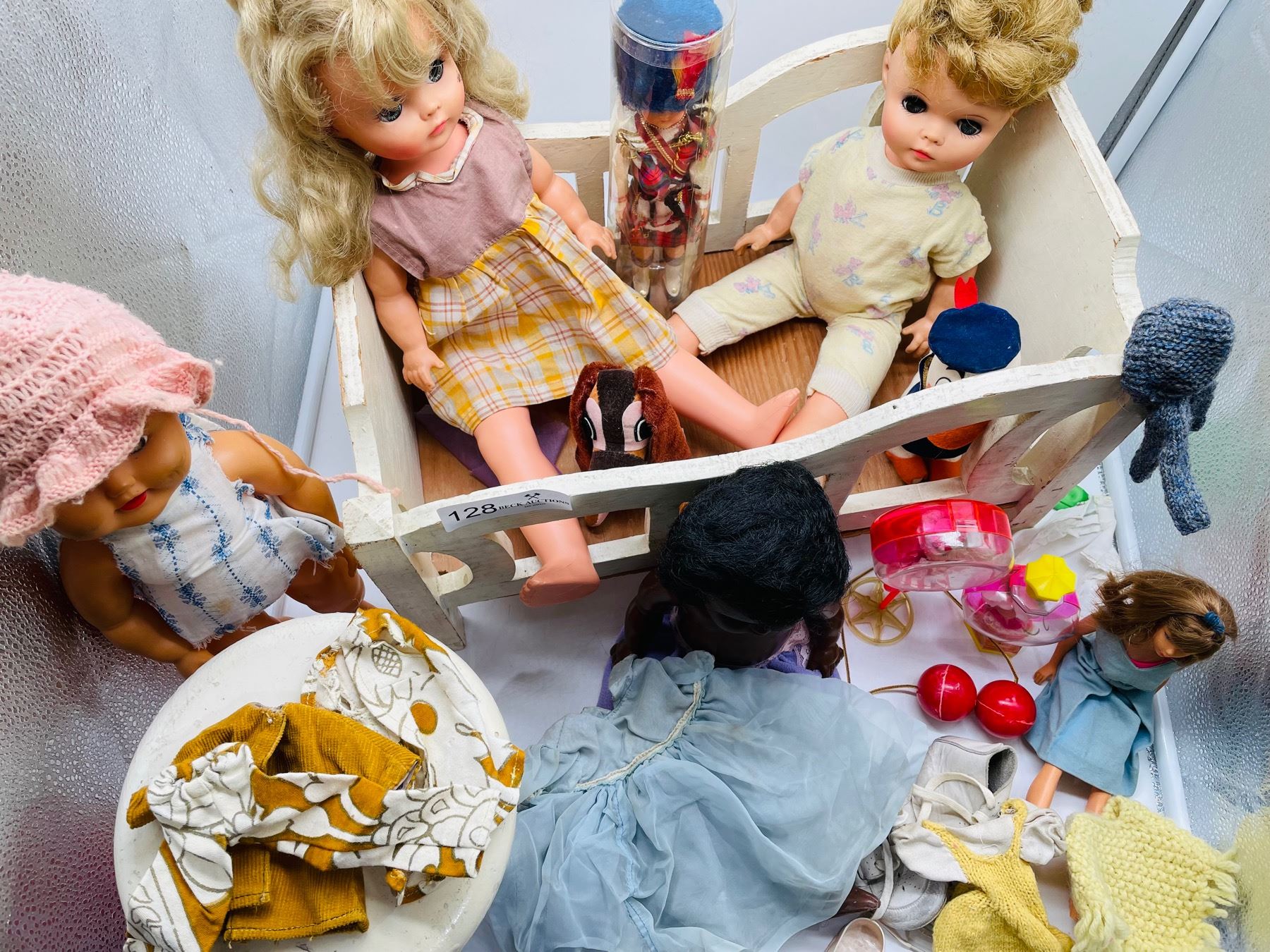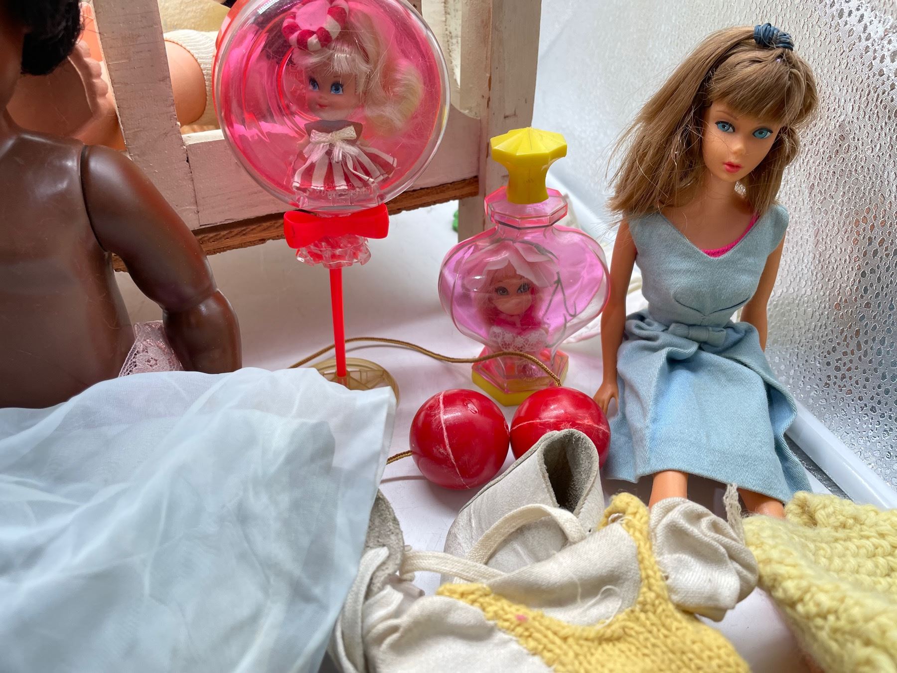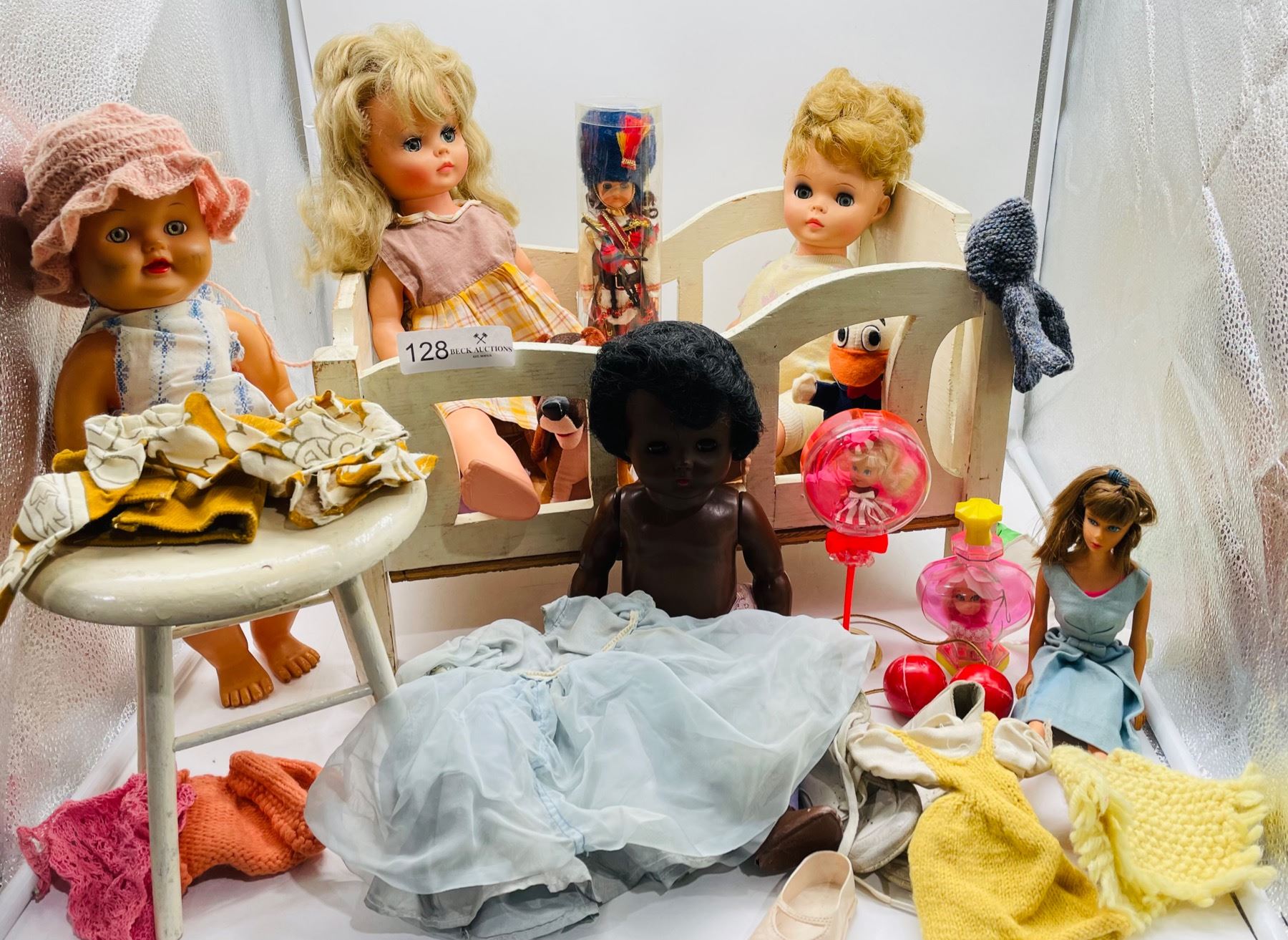 Vintage dolls in worn and played with condition. Lot includes some retro homemade Barbie clothes with vintage Barbie, as well as a crib and stool.